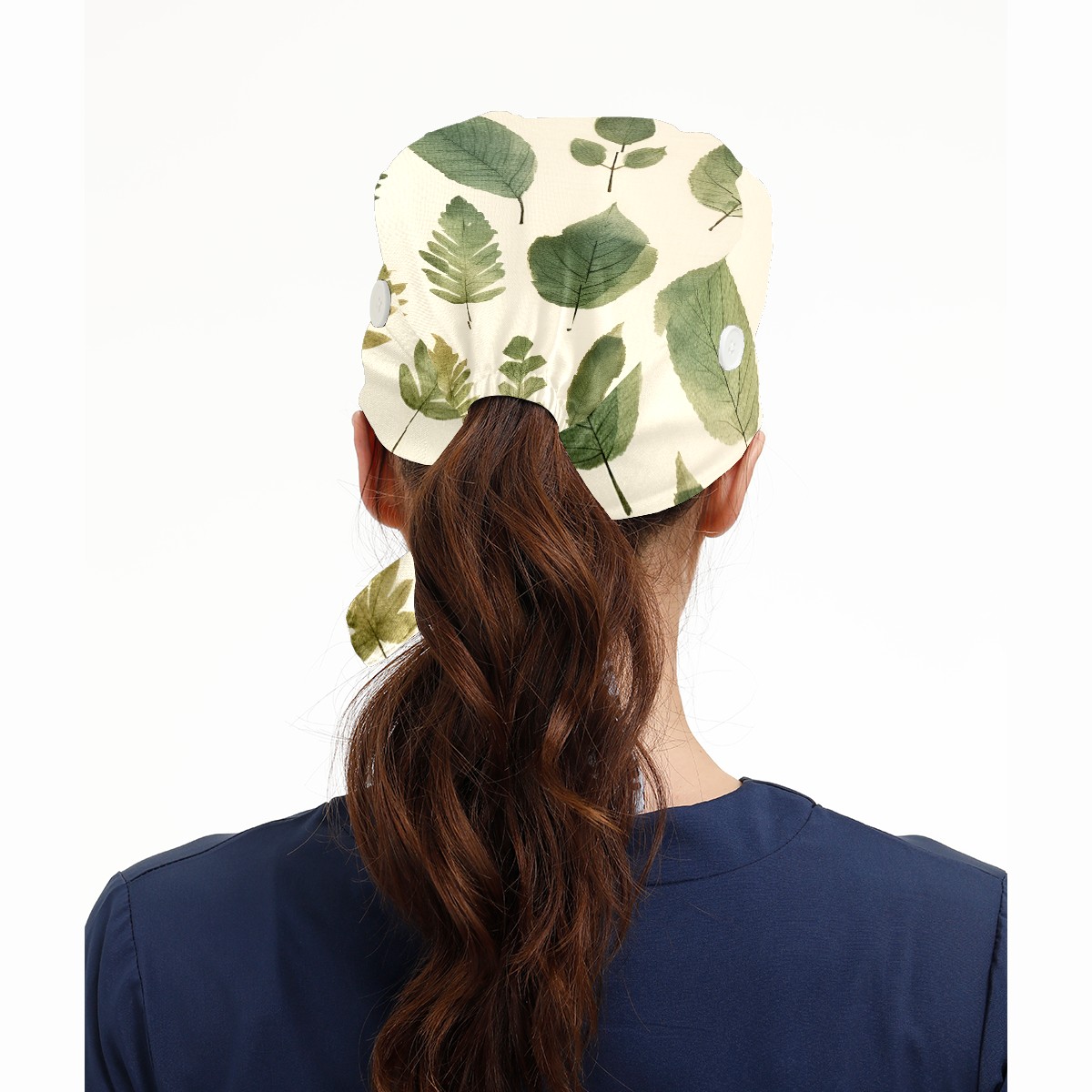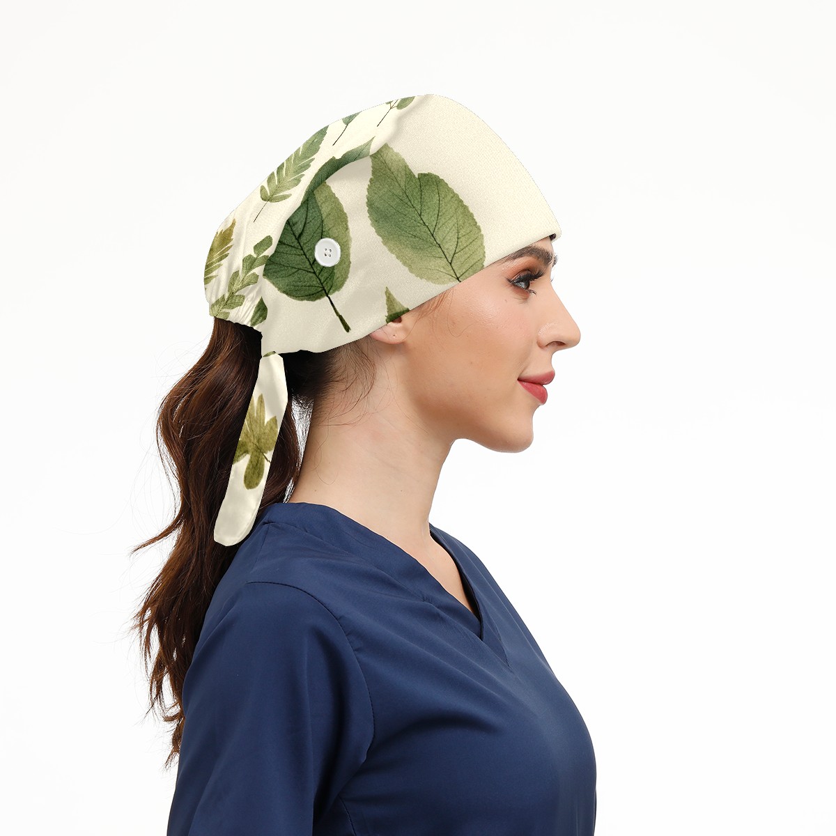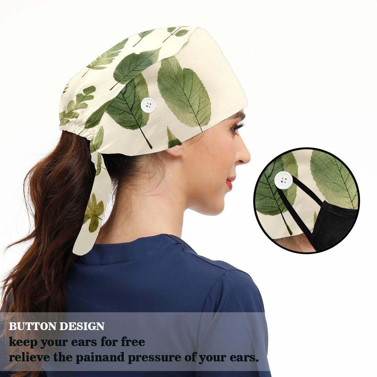 Working Caps with Button&Sweatband Satin Lined Cotton Adjustable Nurse Hats Elastic Band Scrub Cap Surgeon Hat Leaves 4