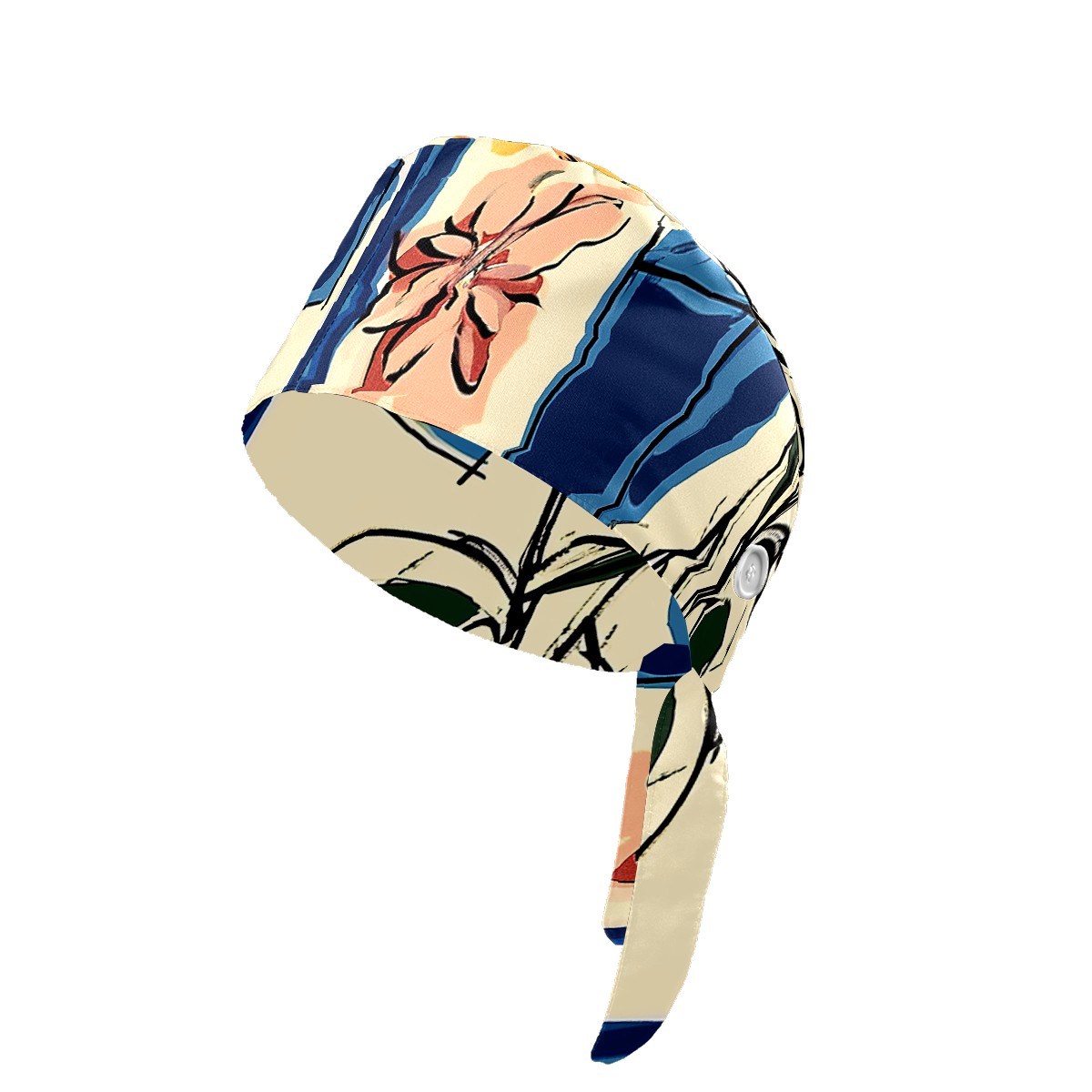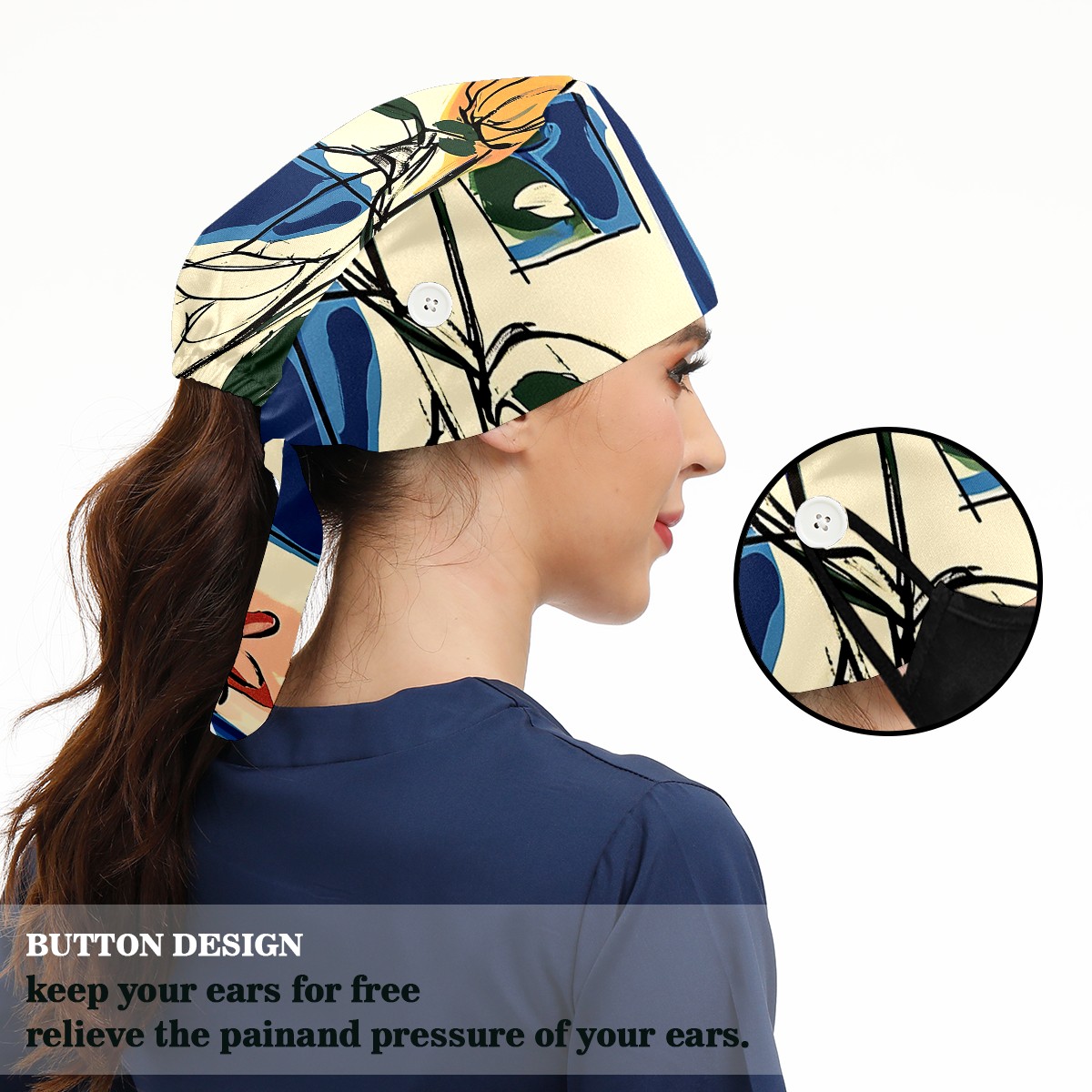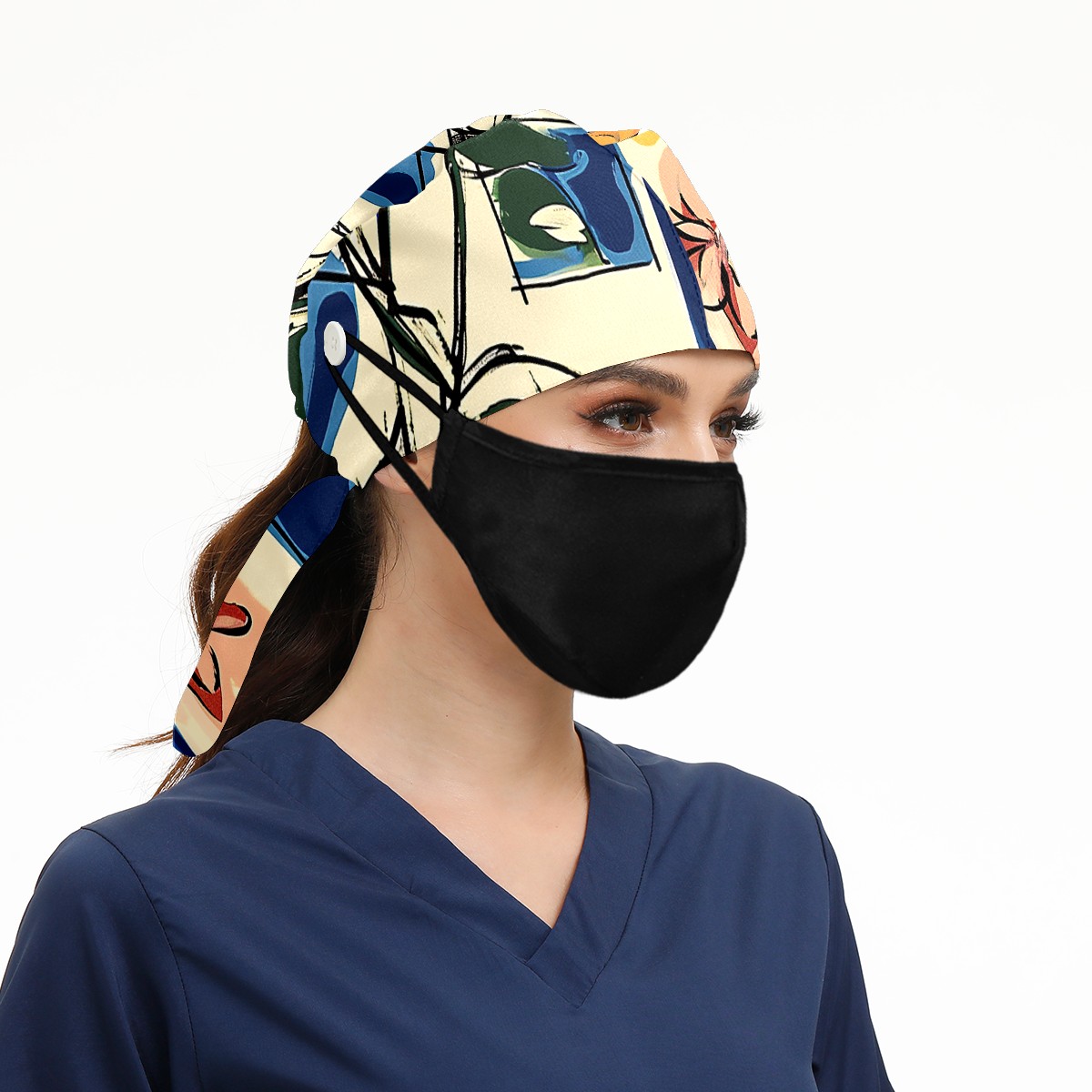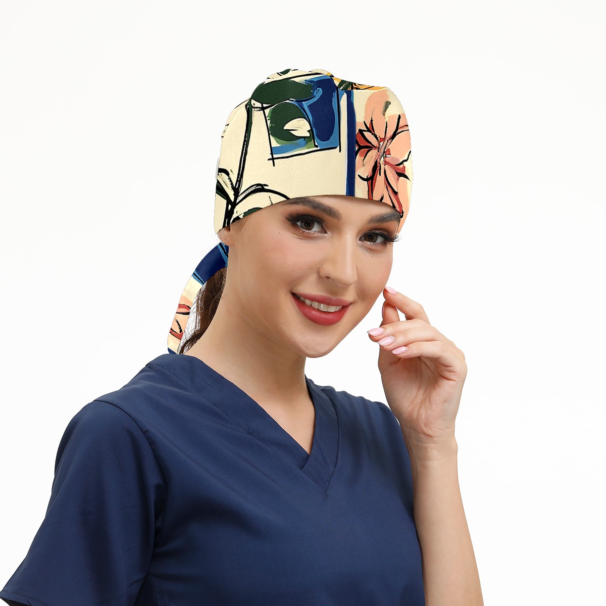 Working Caps with Button&Sweatband Satin Lined Cotton Adjustable Nurse Hats Elastic Band Scrub Cap Surgeon Hat Glass Flowers 4