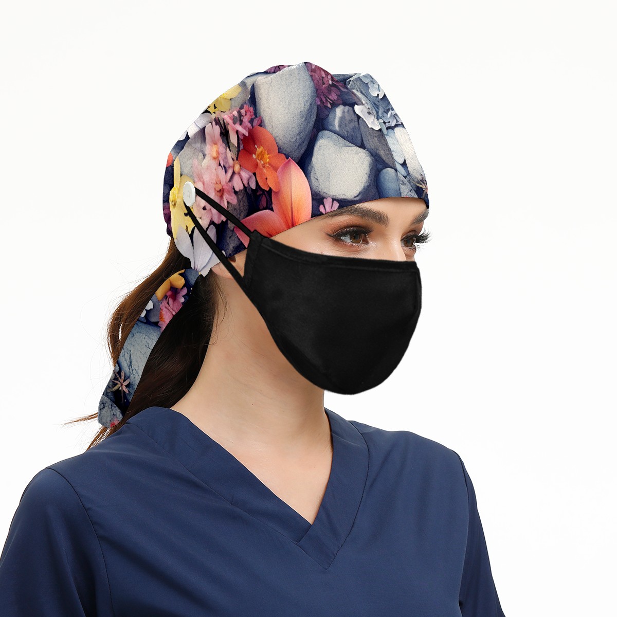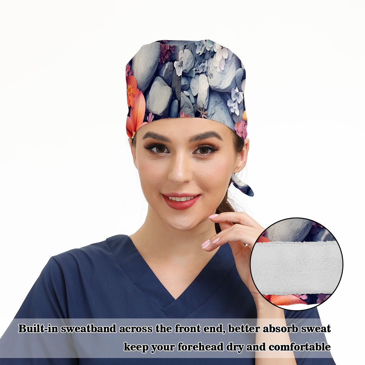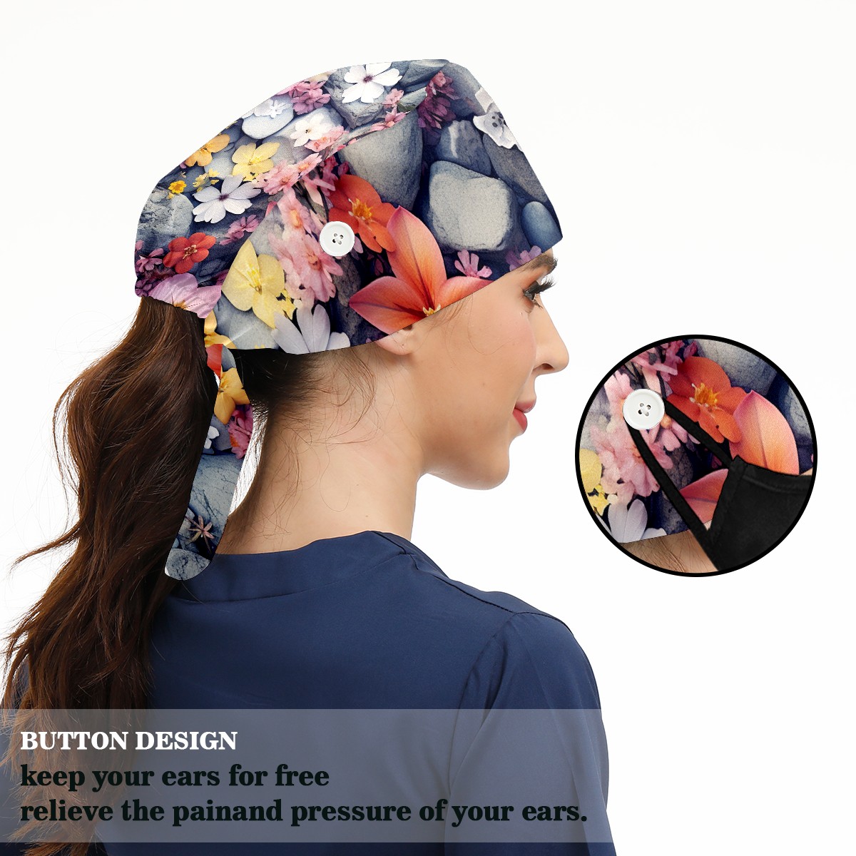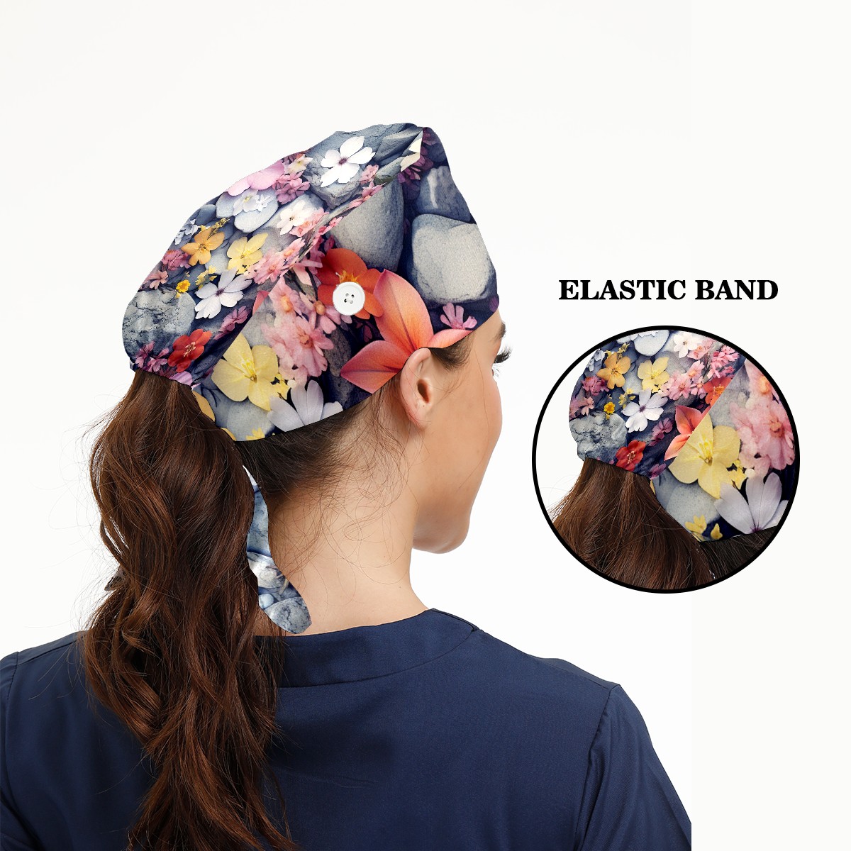 Working Caps with Button&Sweatband Satin Lined Cotton Adjustable Nurse Hats Elastic Band Scrub Cap Surgeon Hat Flower 007