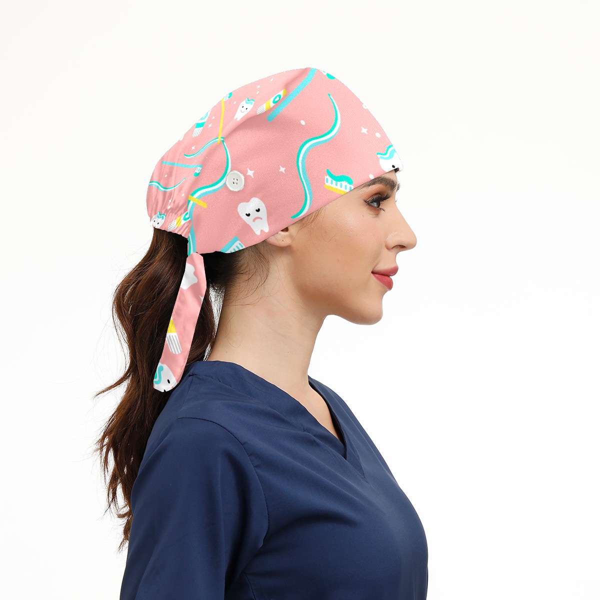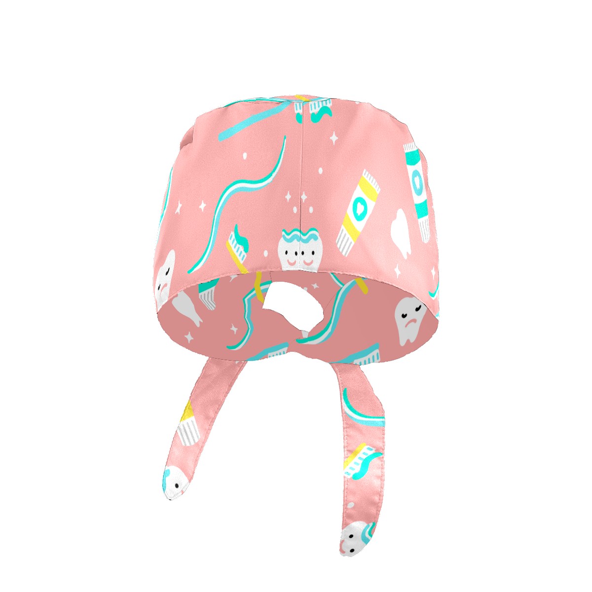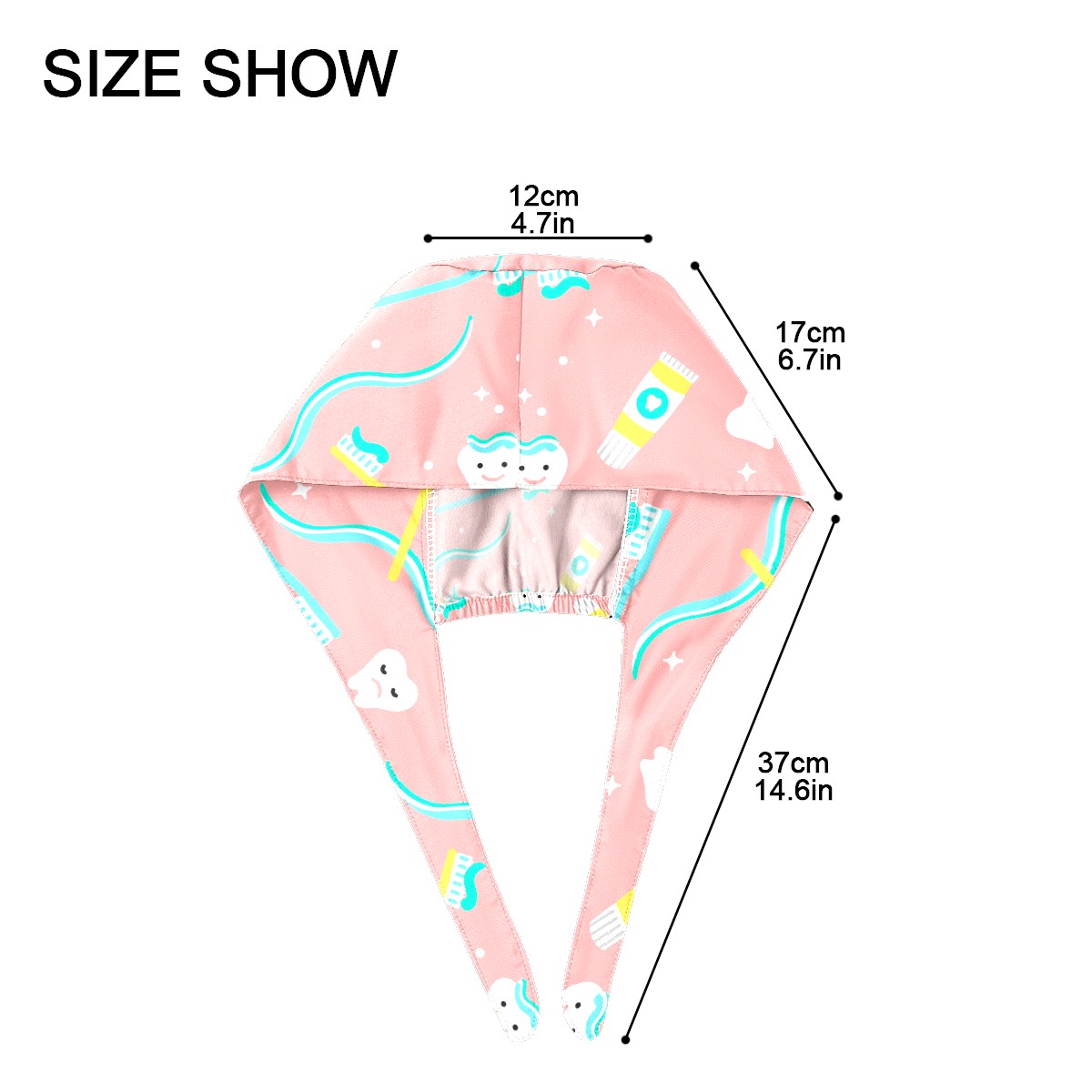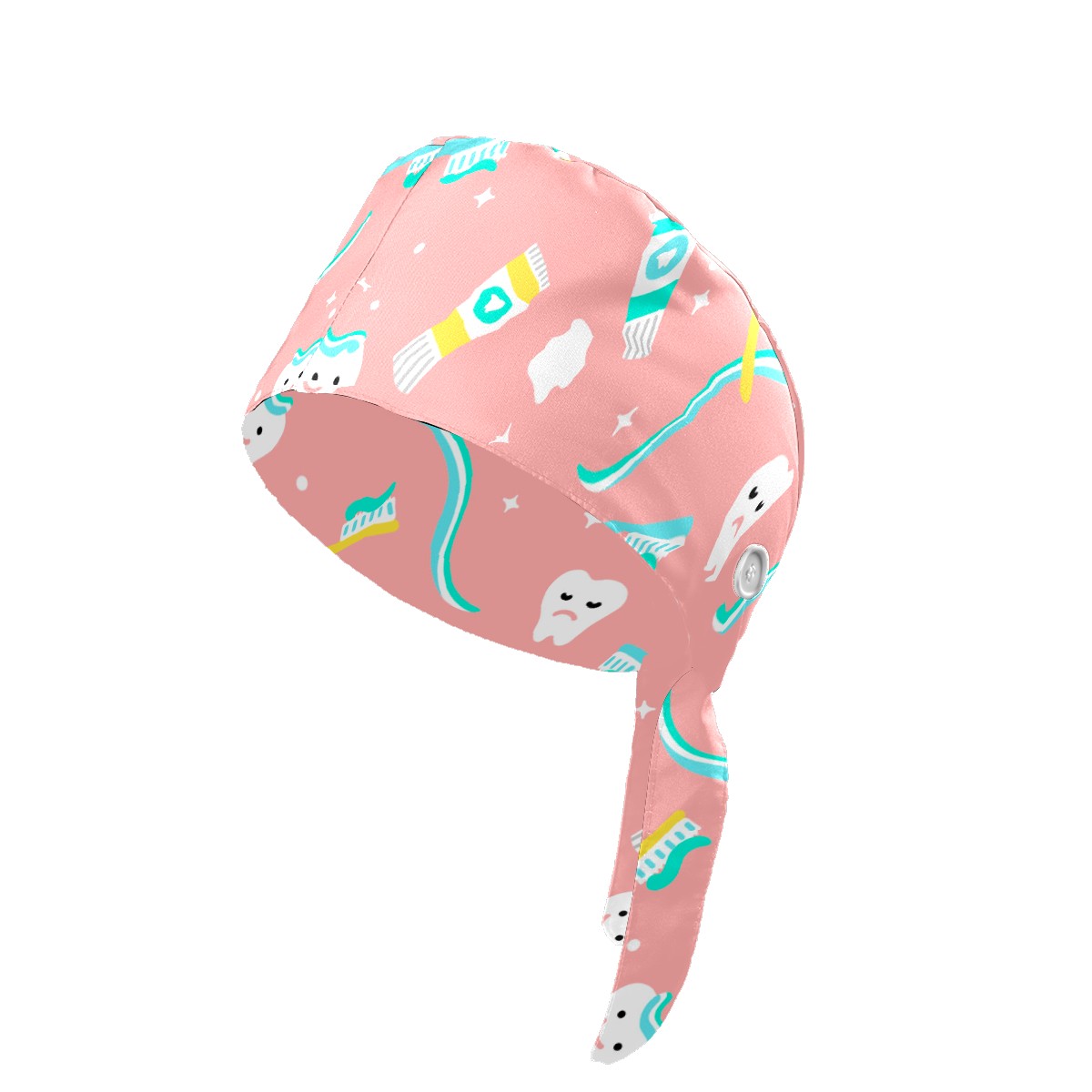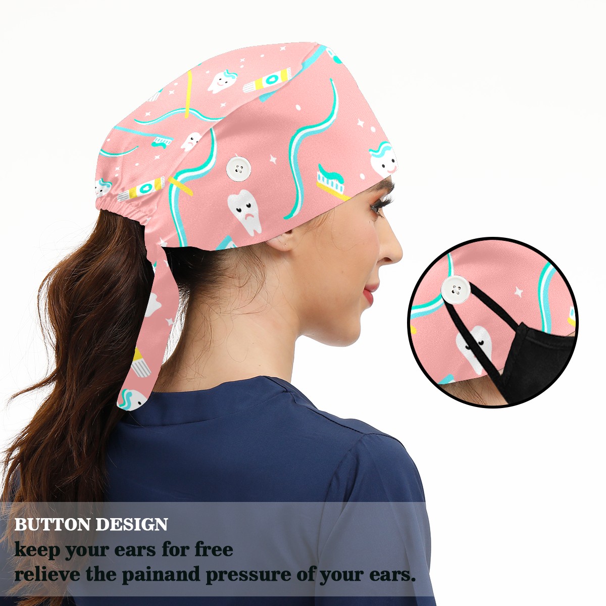 Working Caps with Button&Sweatband Satin Lined Cotton Adjustable Nurse Hats Elastic Band Scrub Cap Surgeon Hat Cute Tooth Dentist Toothbrush Toothpaste