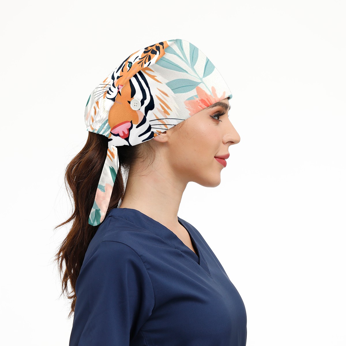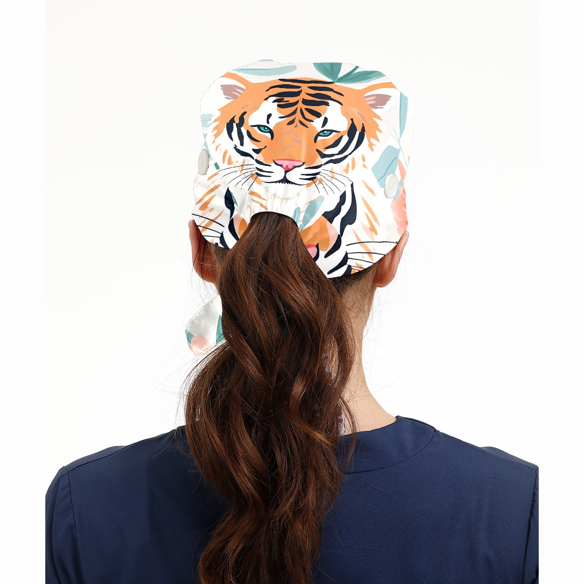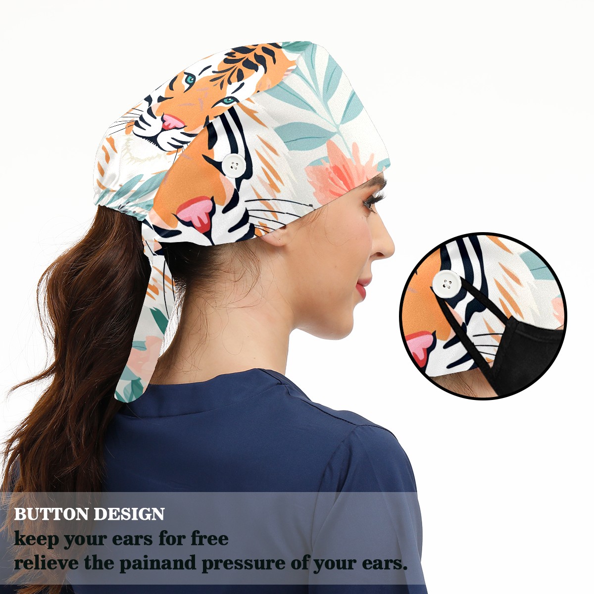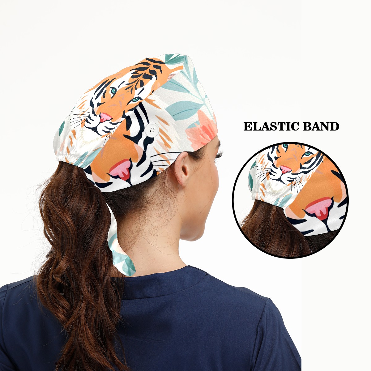 Working Caps with Button&Sweatband Satin Lined Cotton Adjustable Nurse Hats Elastic Band Scrub Cap Surgeon Hat Cute-Tiger