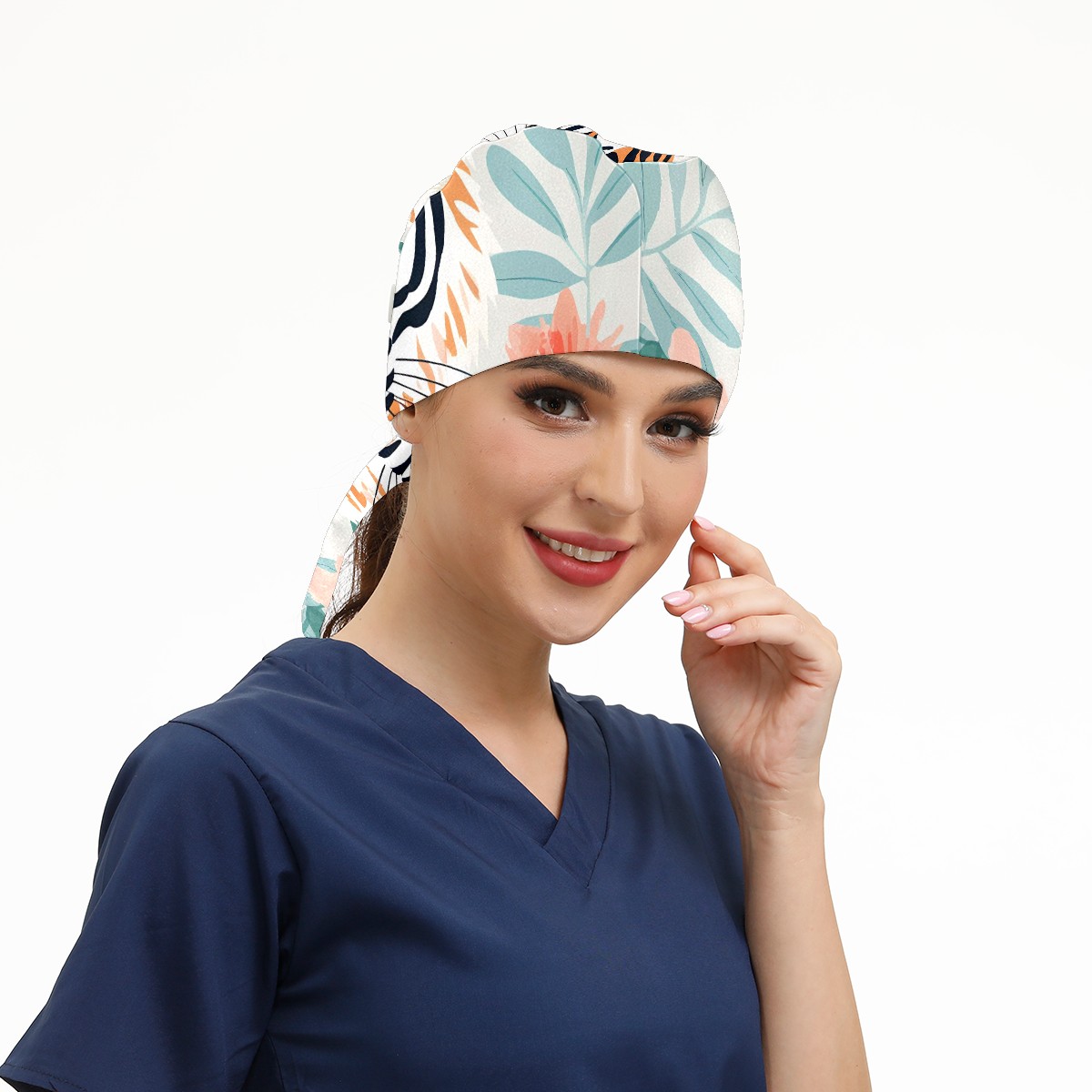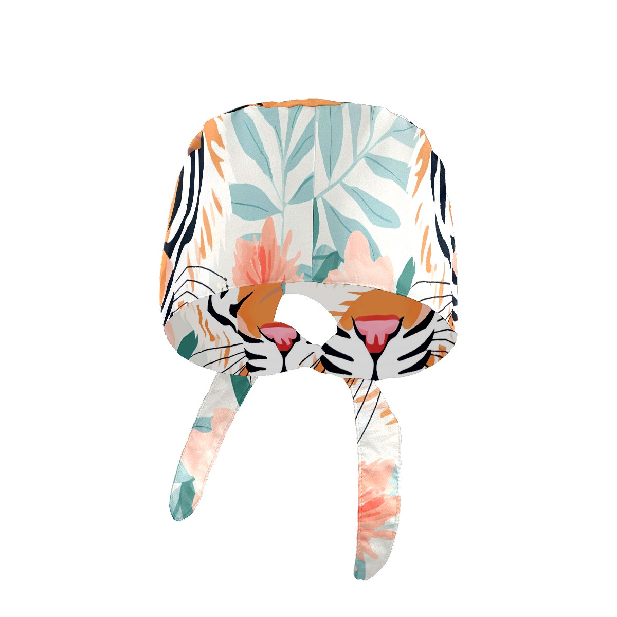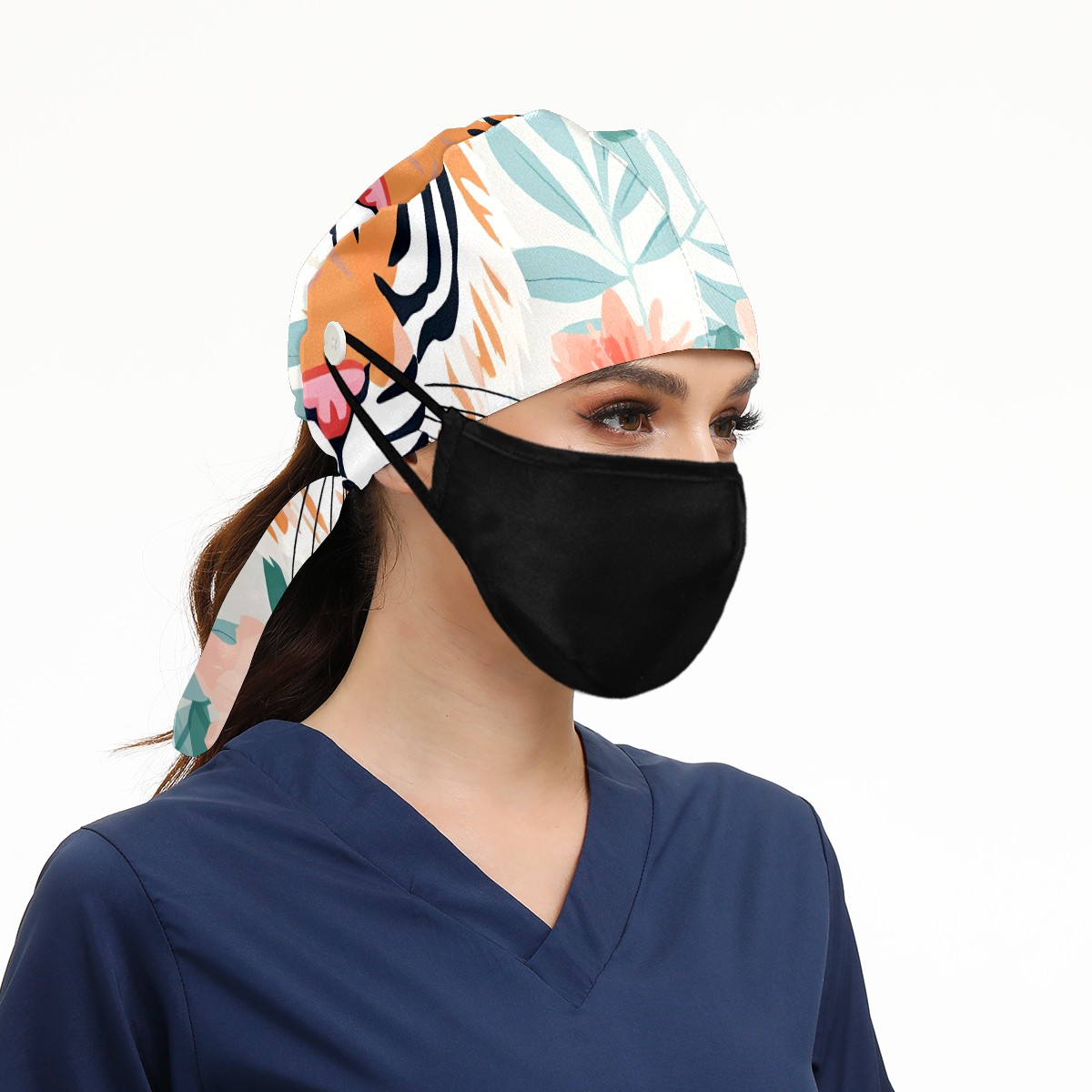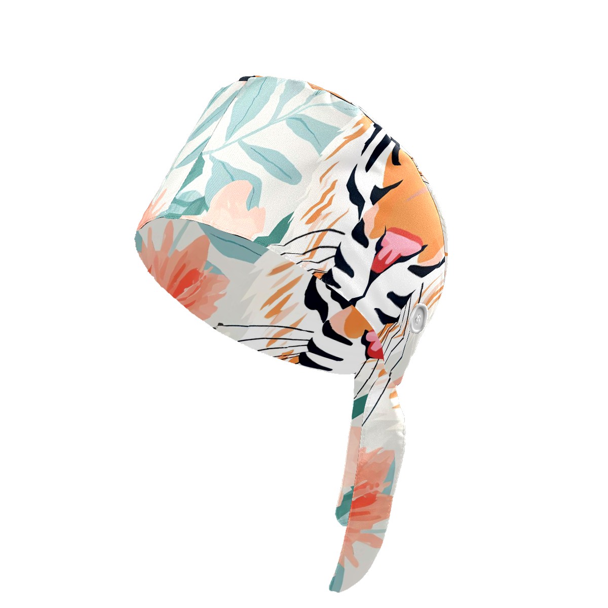 Working Caps with Button&Sweatband Satin Lined Cotton Adjustable Nurse Hats Elastic Band Scrub Cap Surgeon Hat Cute-Tiger