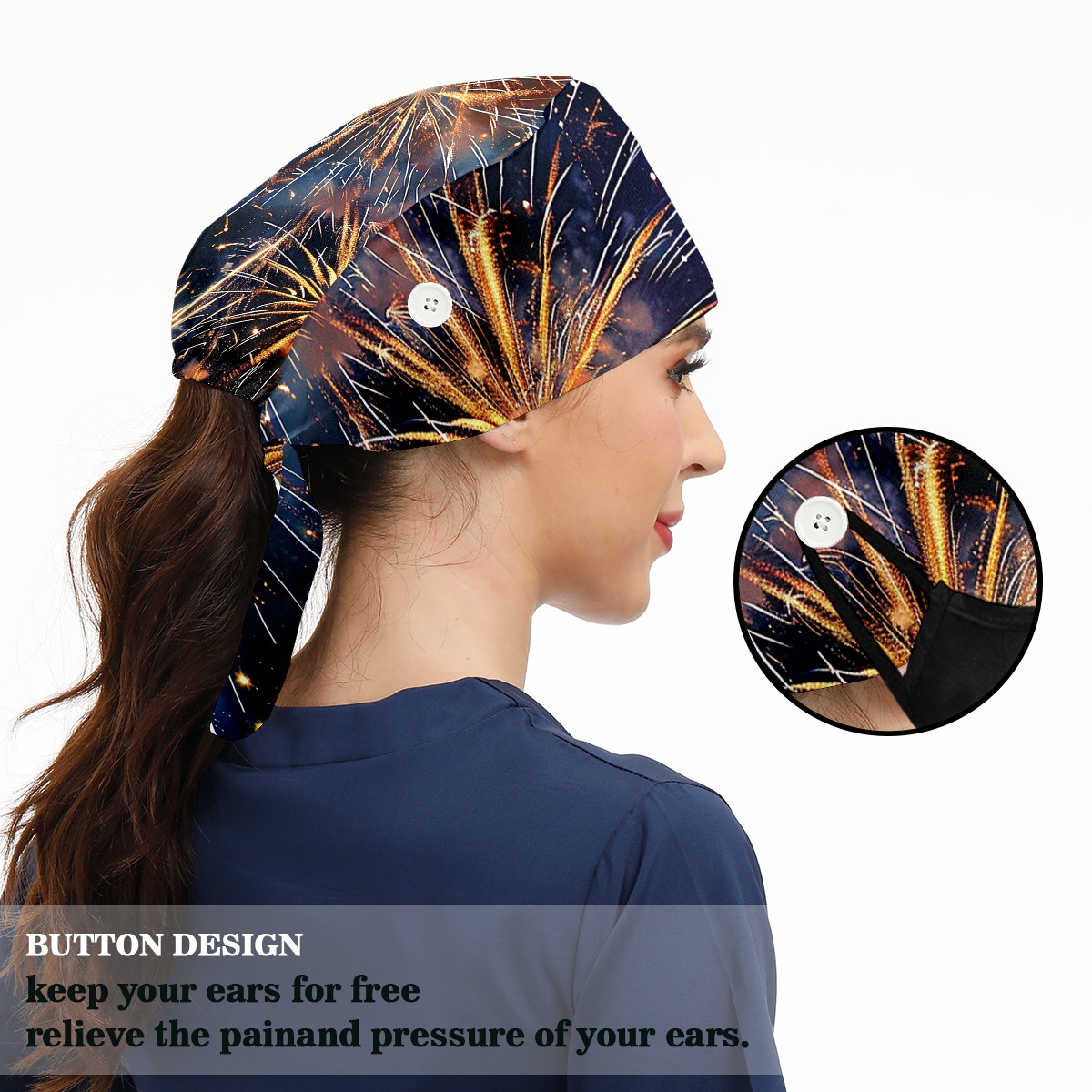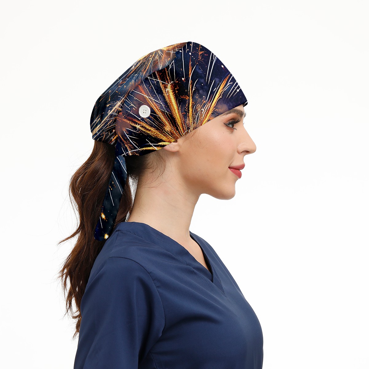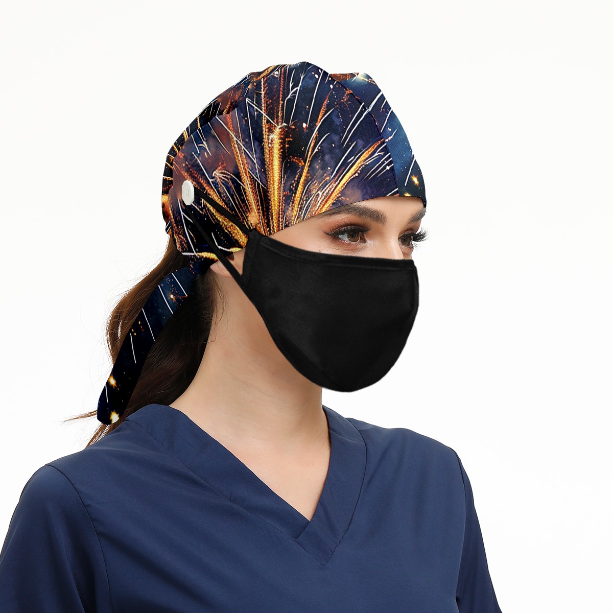 Working Caps with Button&Sweatband Satin Lined Cotton Adjustable Nurse Hats Elastic Band Scrub Cap Surgeon Hat Fireworks