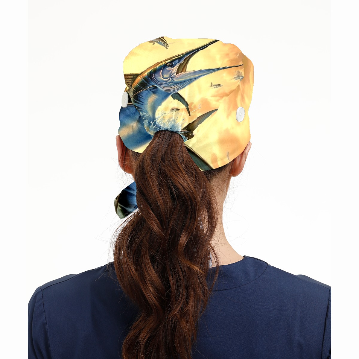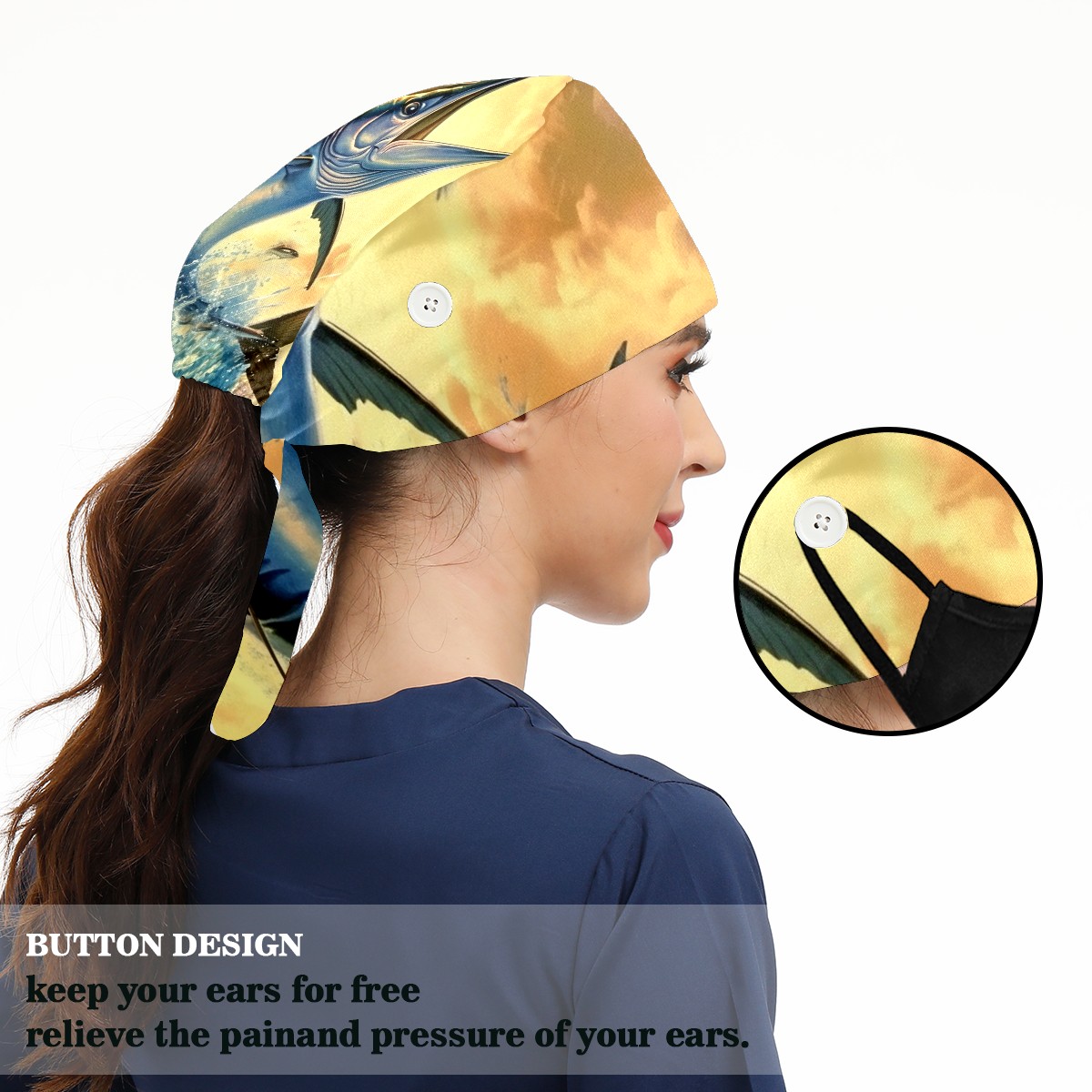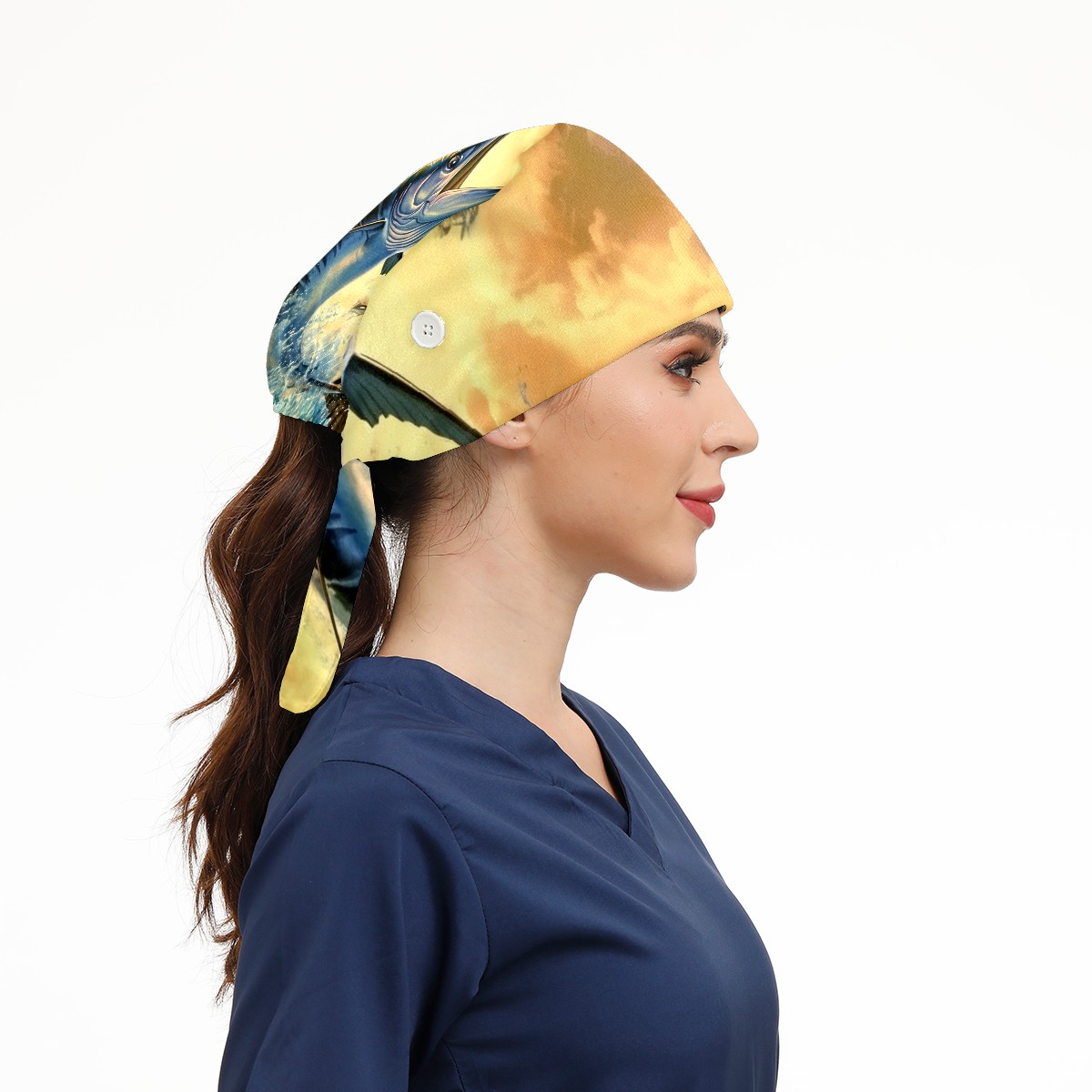 Working Caps with Button&Sweatband Satin Lined Cotton Adjustable Nurse Hats Elastic Band Scrub Cap Surgeon Hat Fish Flying Out Of The Ocean (1)