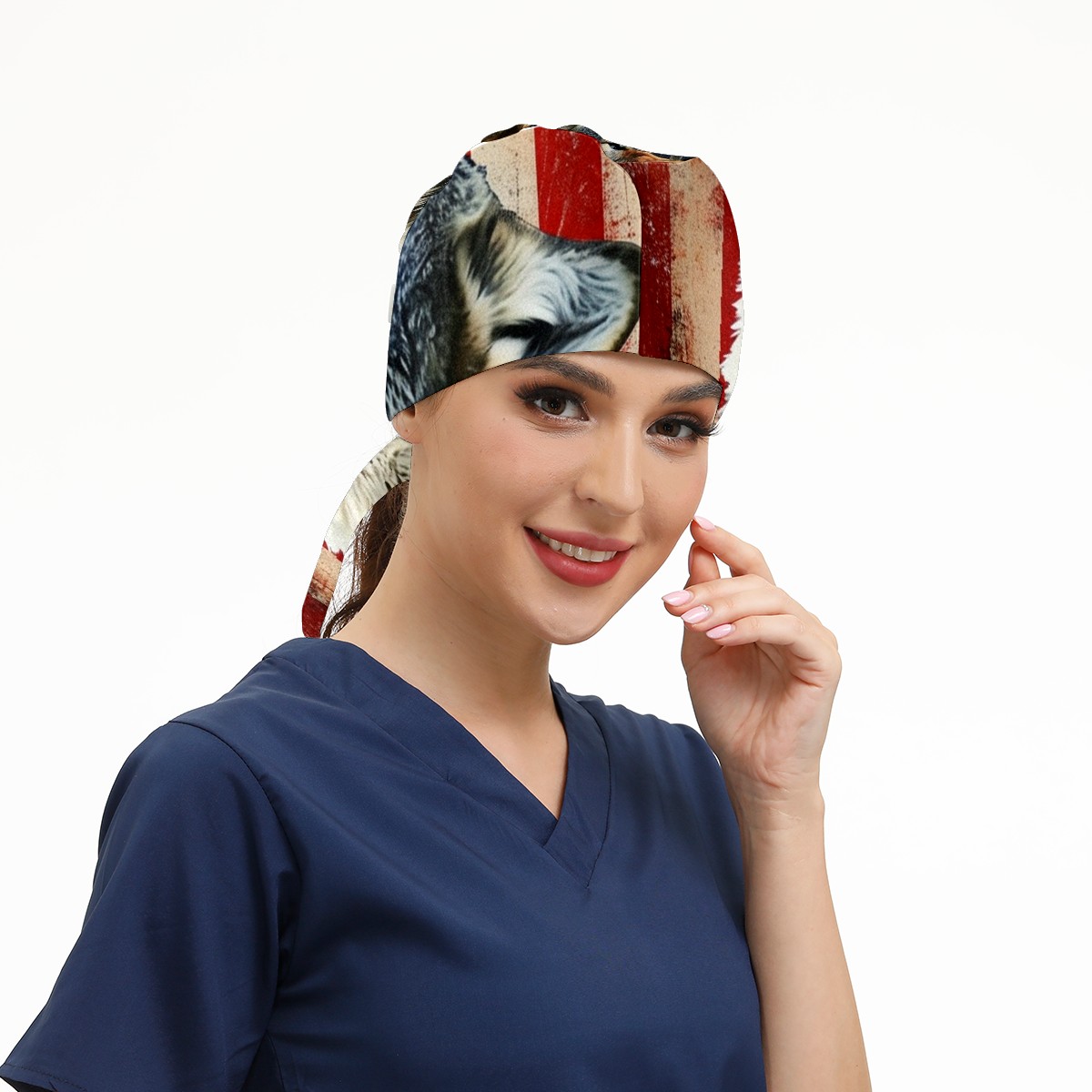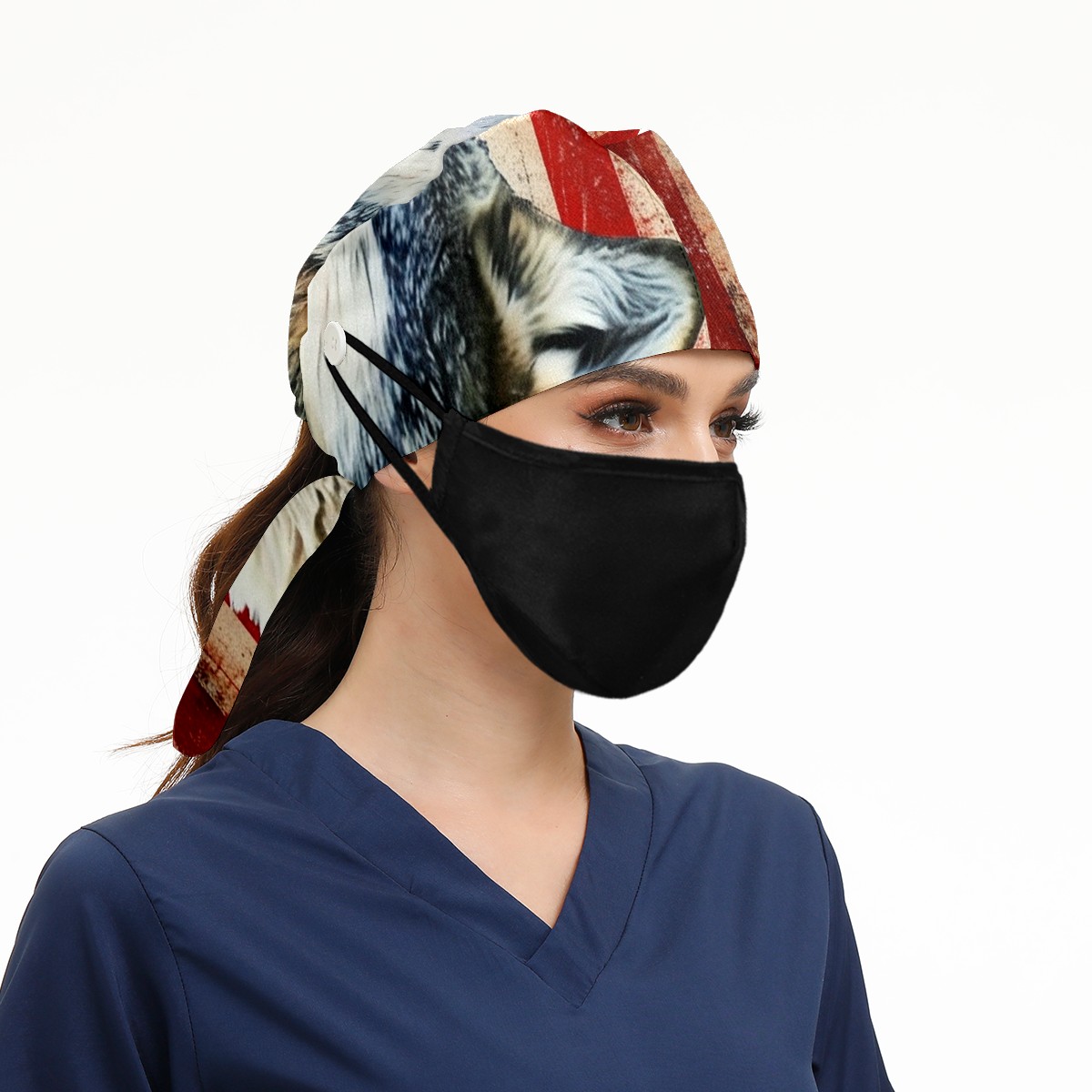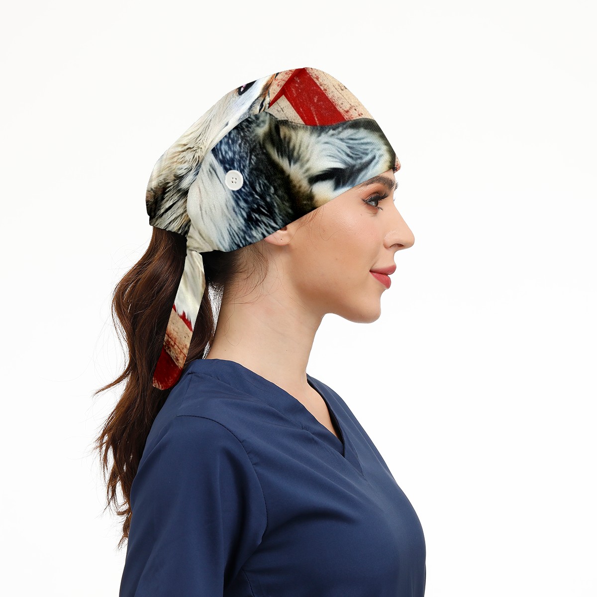 Working Caps with Button&Sweatband Satin Lined Cotton Adjustable Nurse Hats Elastic Band Scrub Cap Surgeon Hat American Flag And Wolf (3)