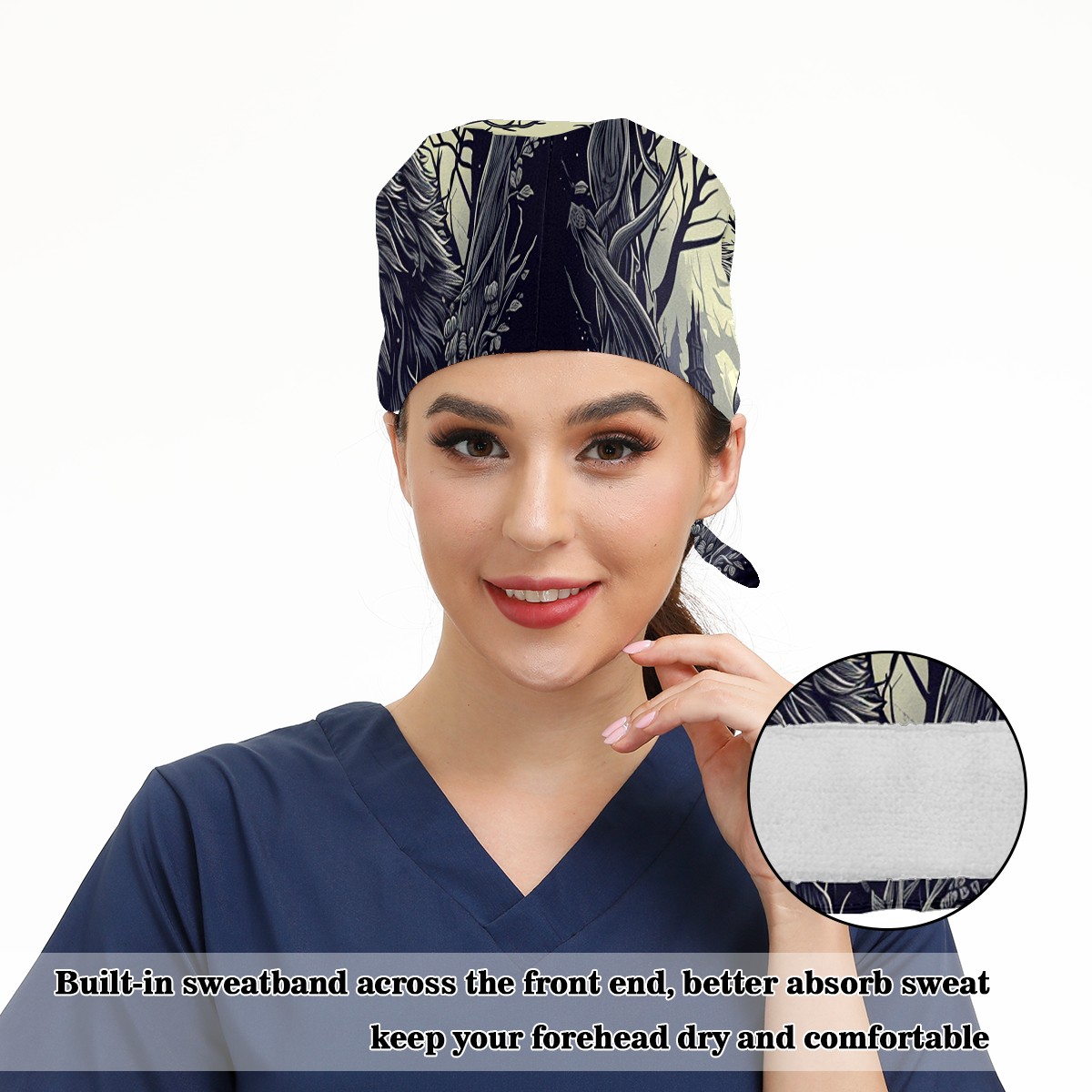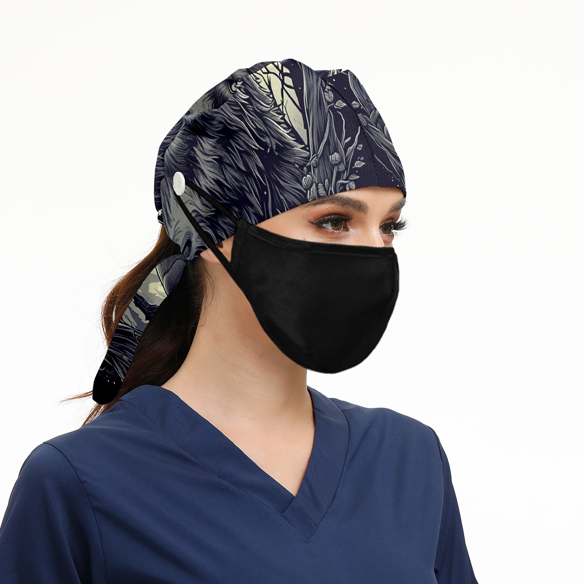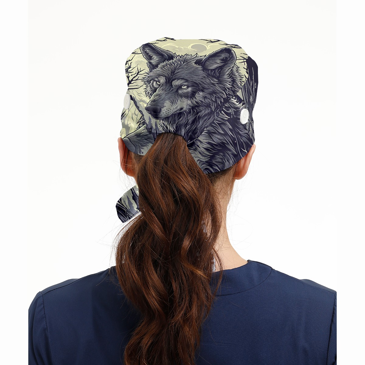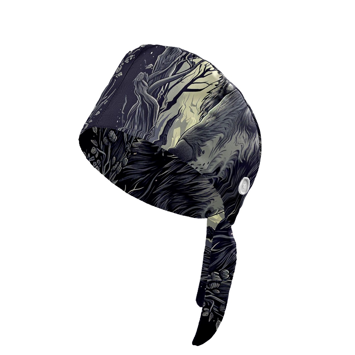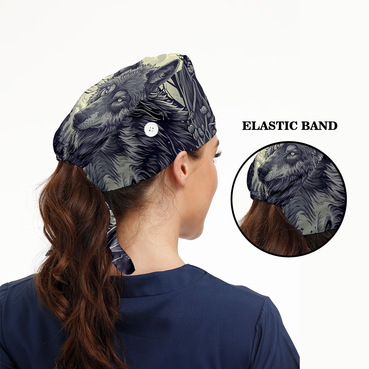 Working Caps with Button&Sweatband Satin Lined Cotton Adjustable Nurse Hats Elastic Band Scrub Cap Surgeon Hat Wolf