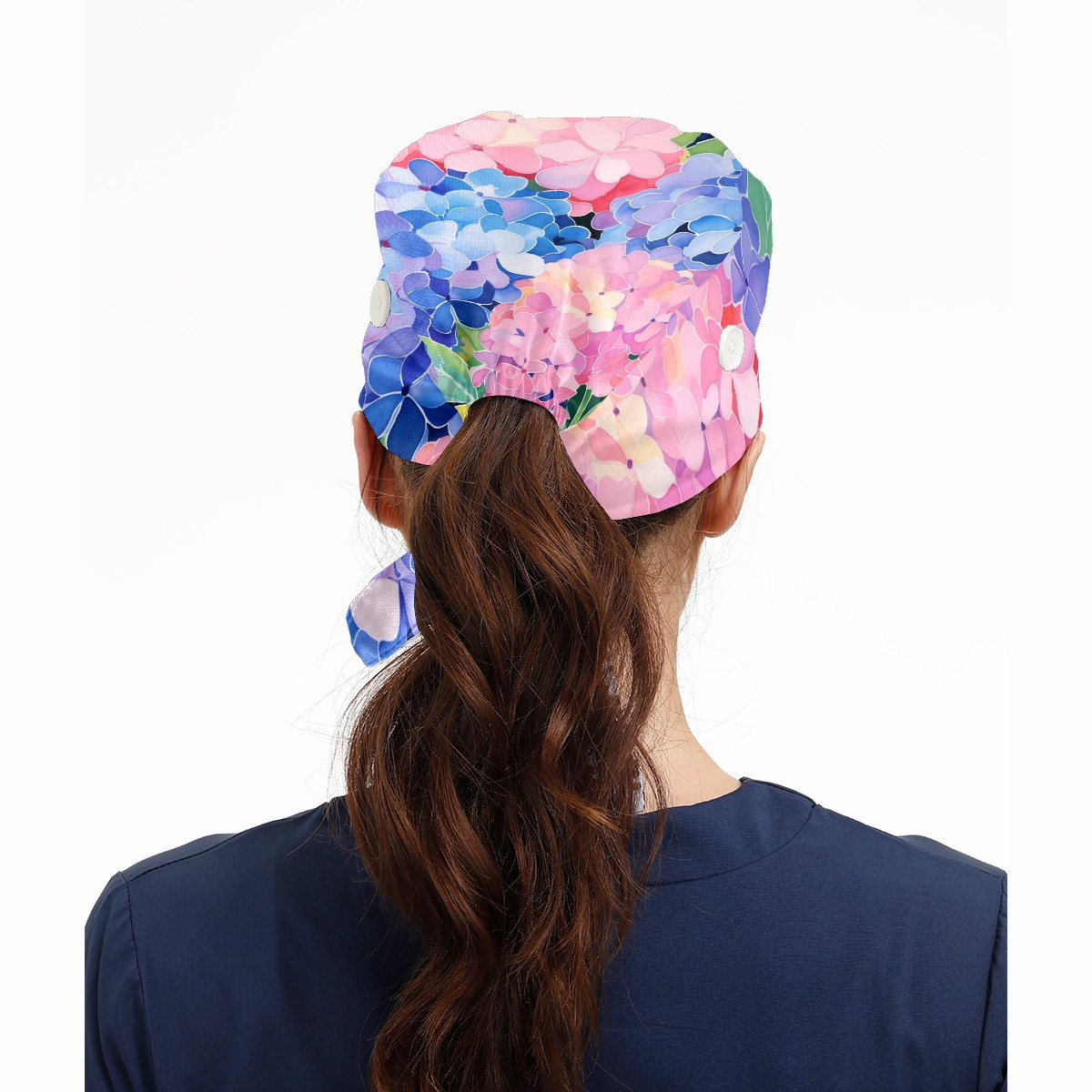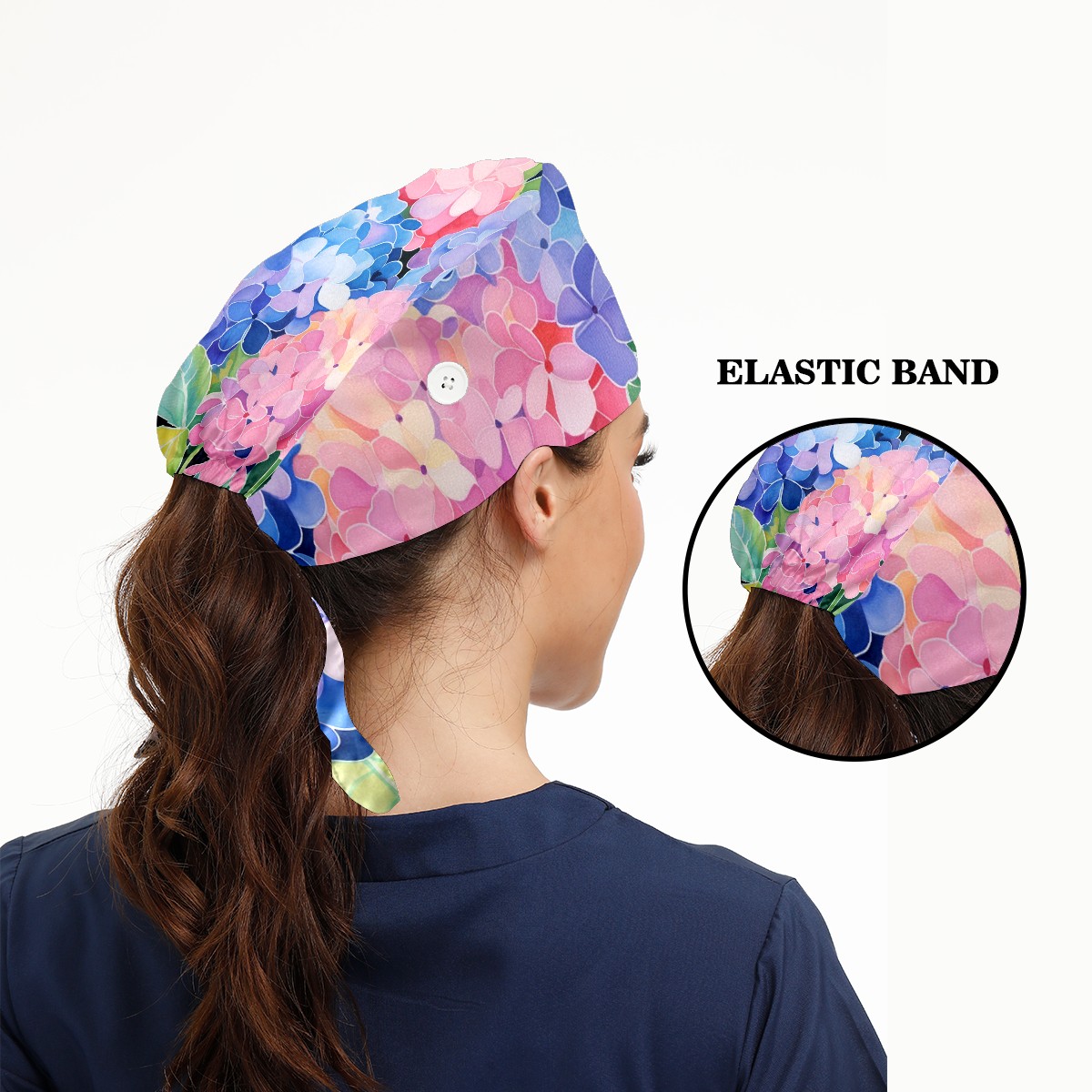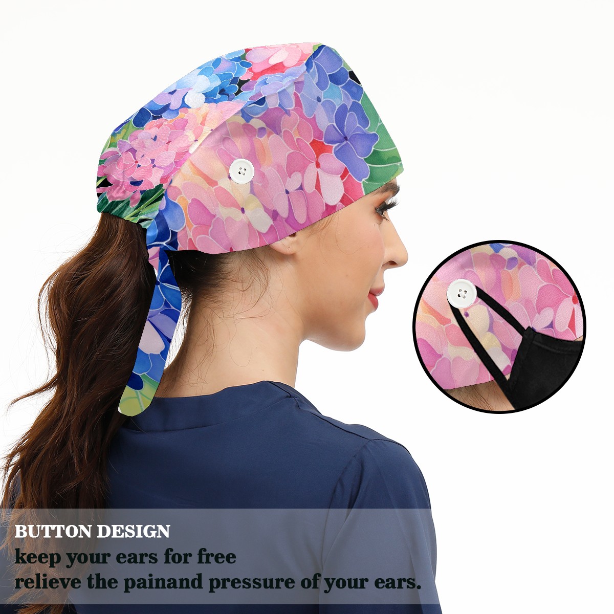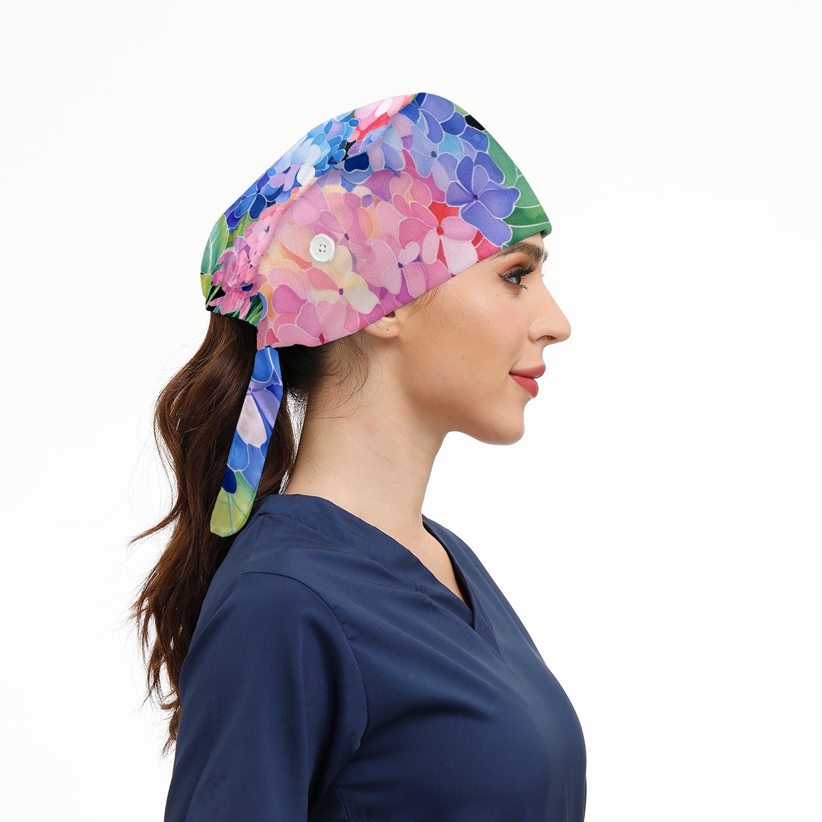 Working Caps with Button&Sweatband Satin Lined Cotton Adjustable Nurse Hats Elastic Band Scrub Cap Surgeon Hat Watercolour Flower