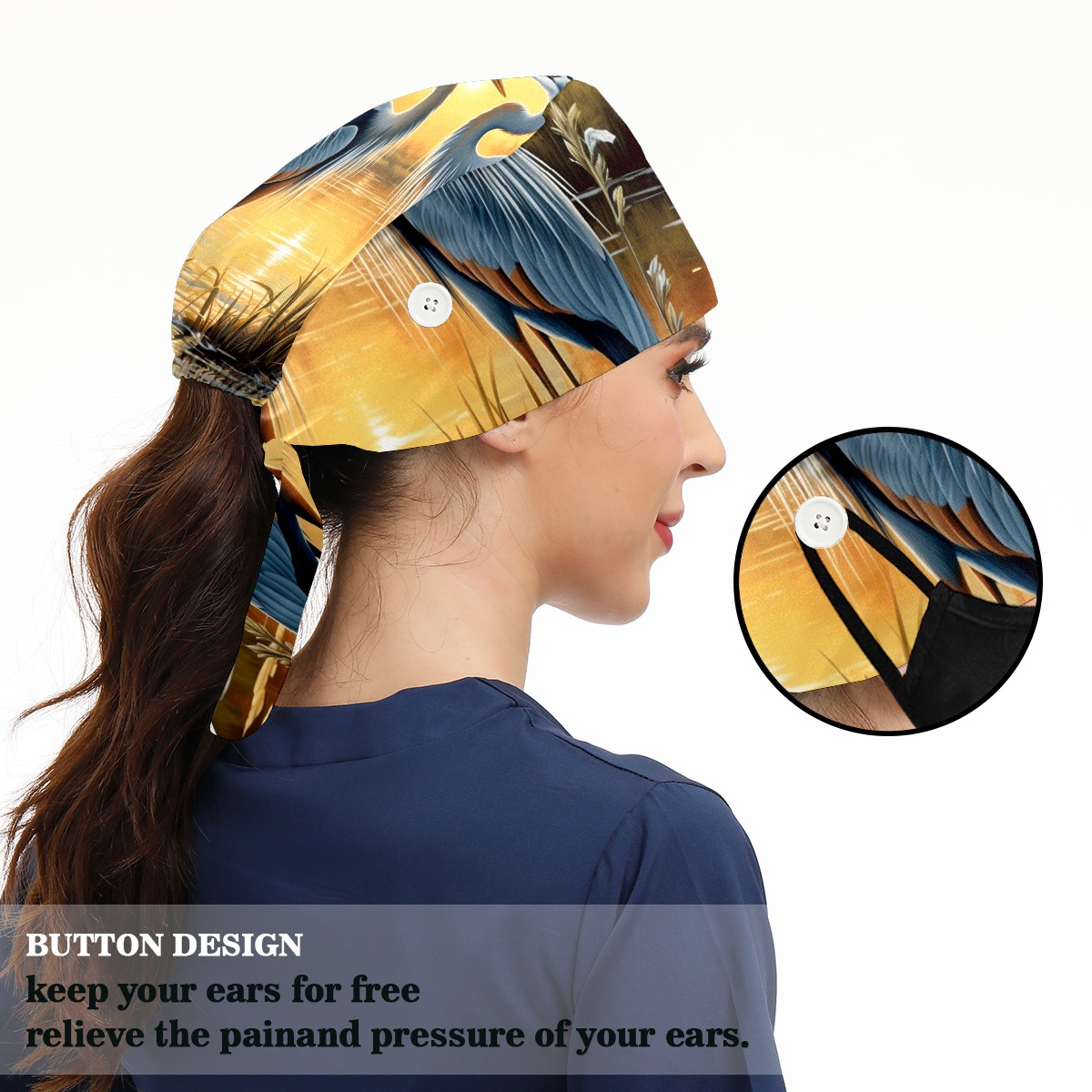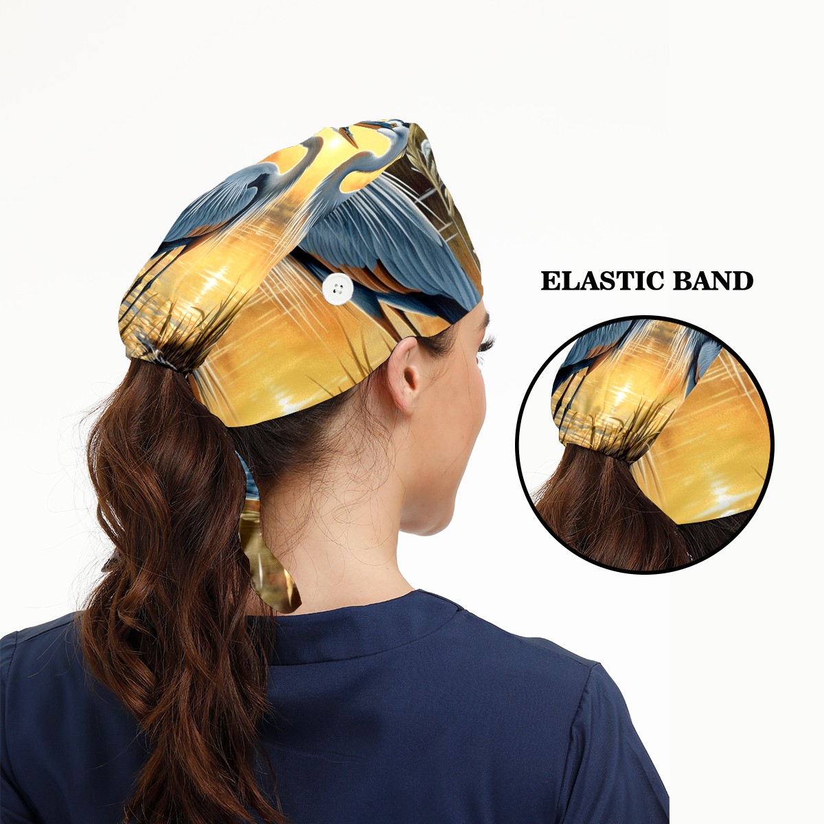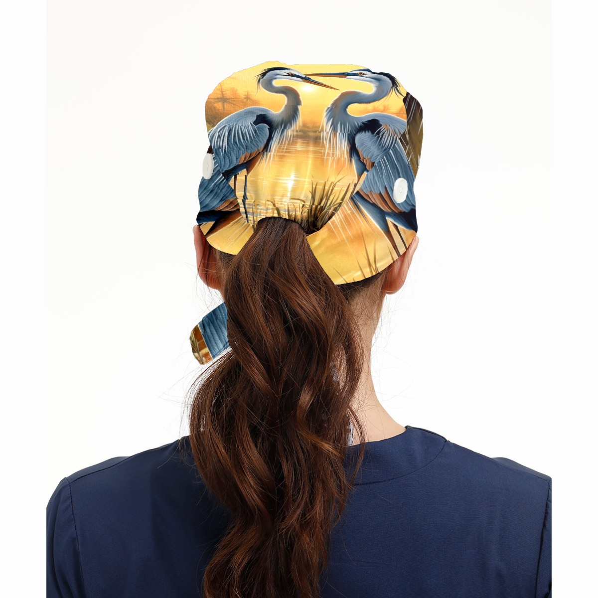 Working Caps with Button&Sweatband Satin Lined Cotton Adjustable Nurse Hats Elastic Band Scrub Cap Surgeon Hat Two Blue Herons Standing