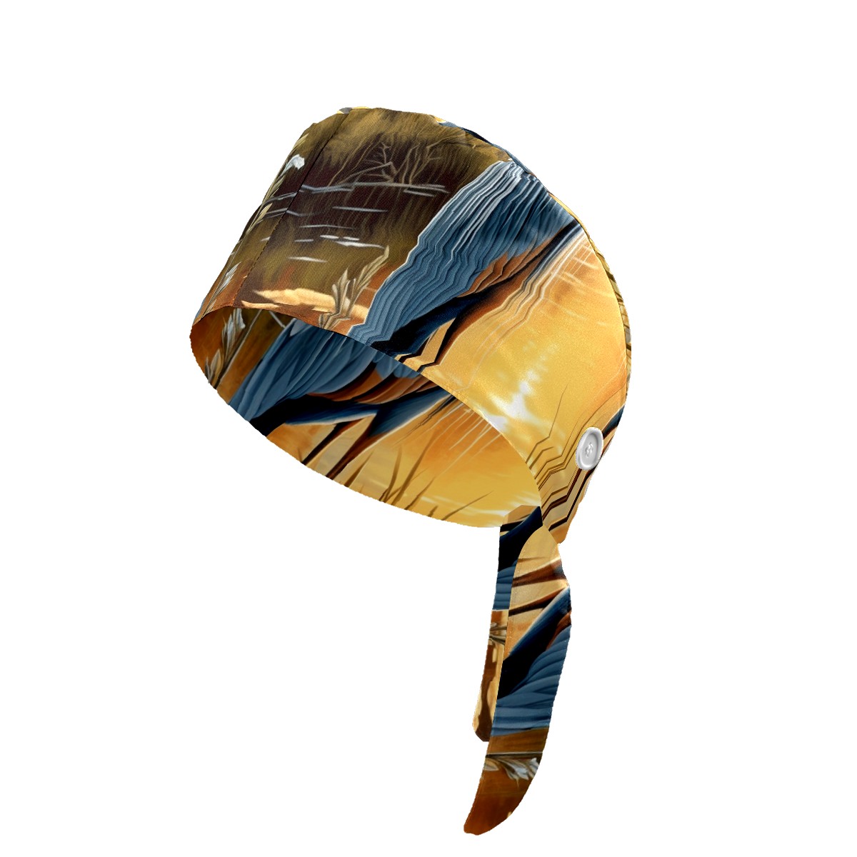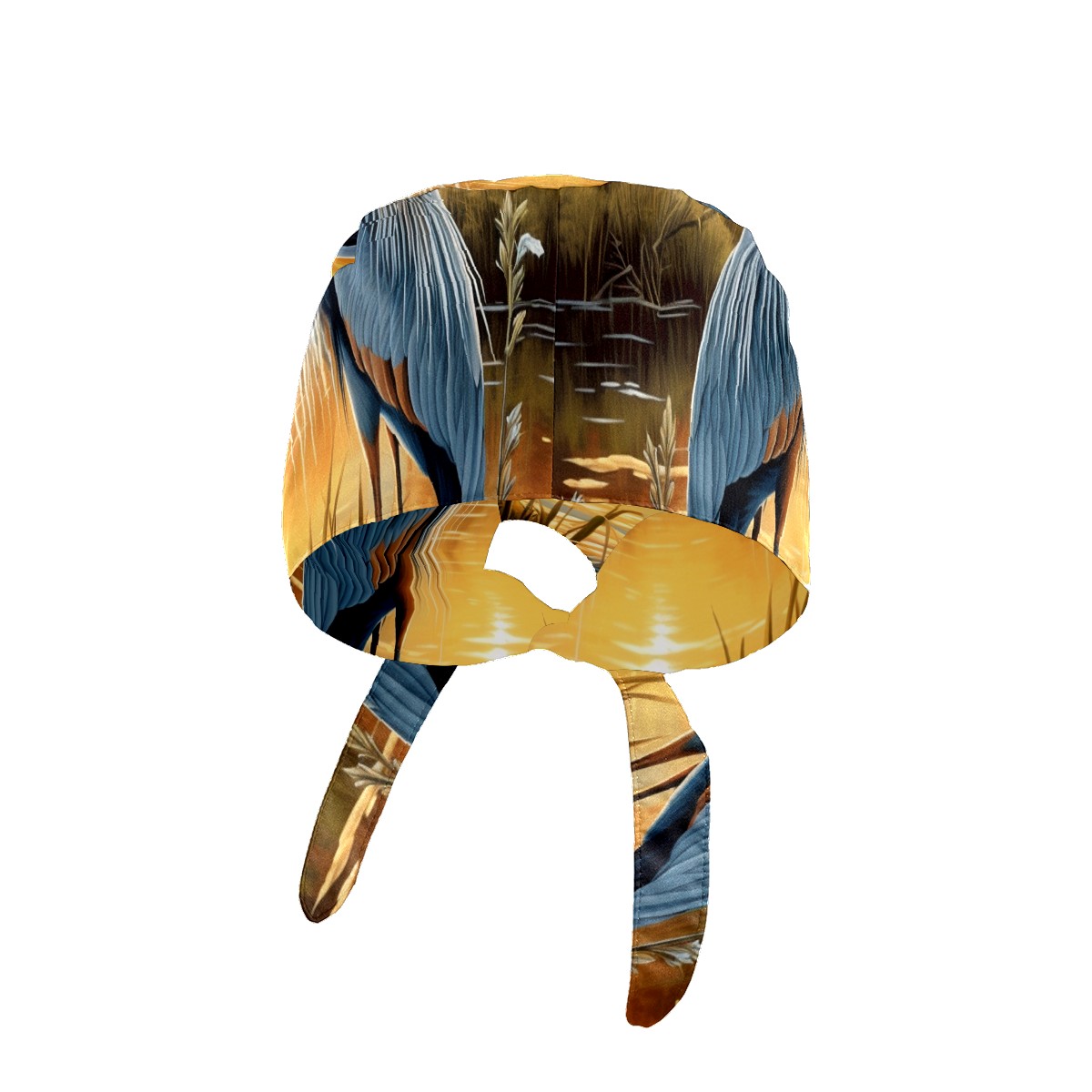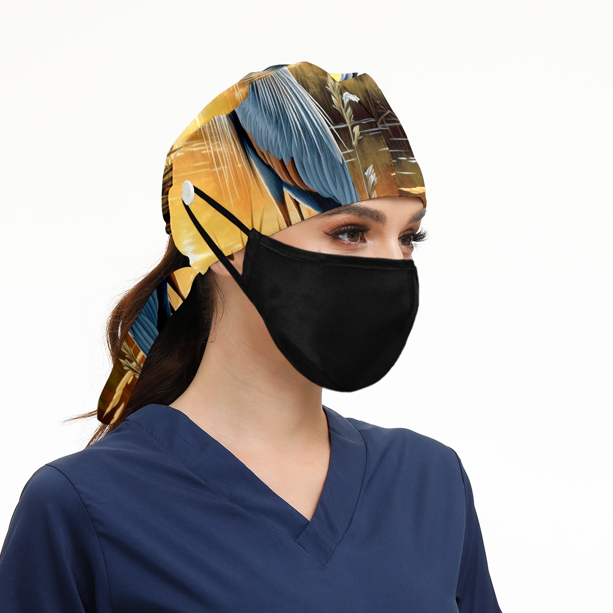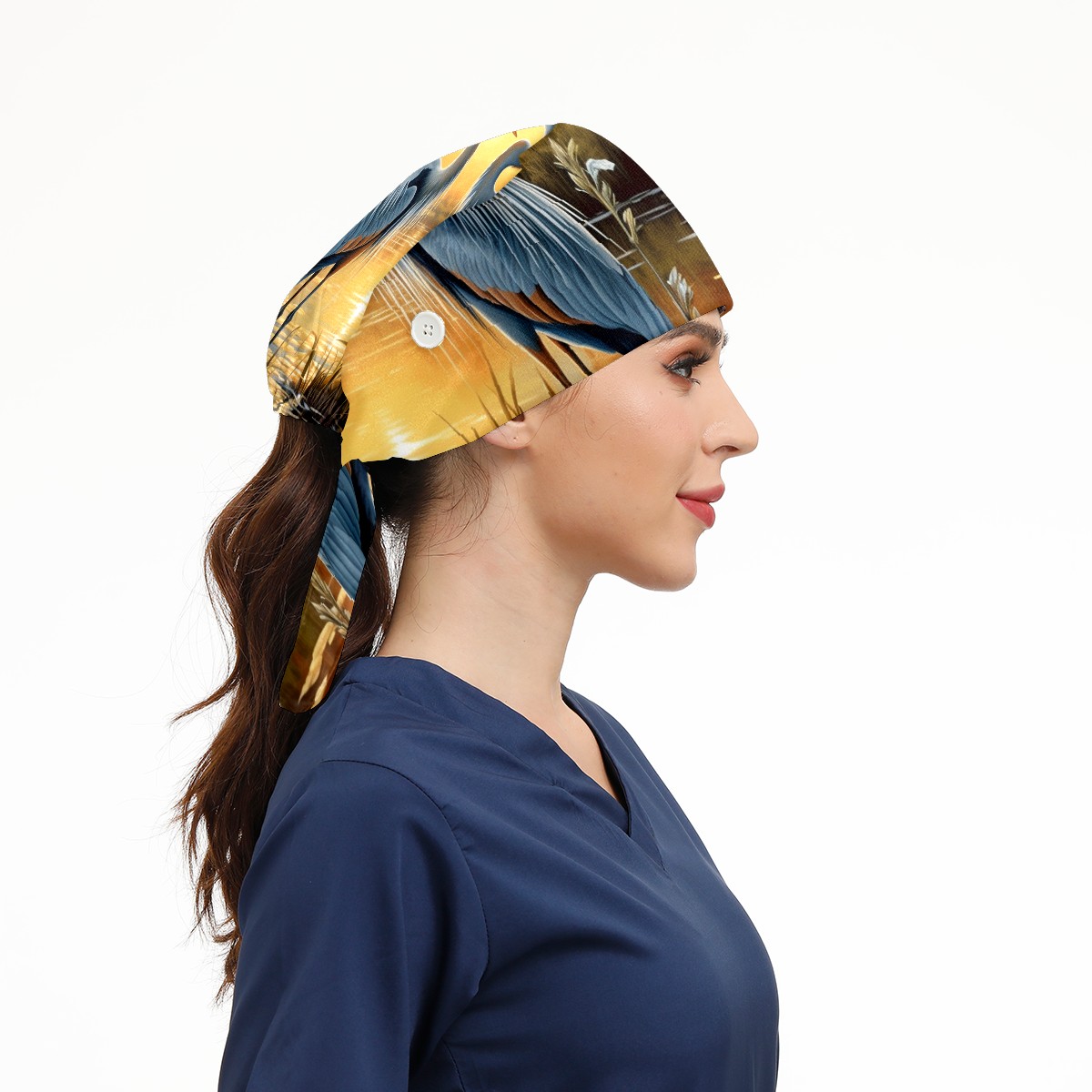 Working Caps with Button&Sweatband Satin Lined Cotton Adjustable Nurse Hats Elastic Band Scrub Cap Surgeon Hat Two Blue Herons Standing