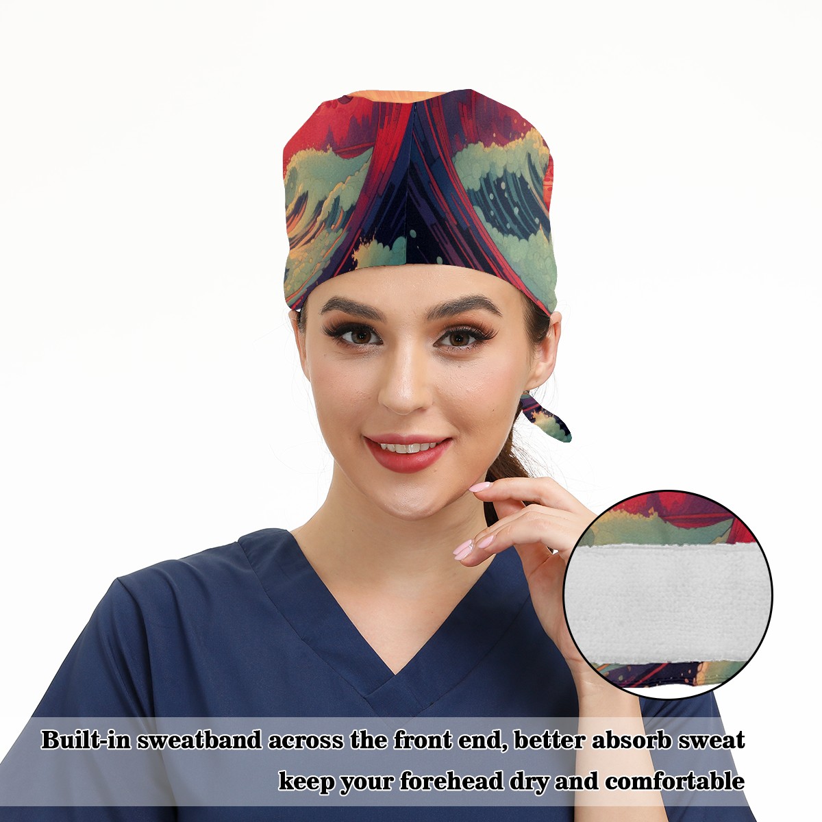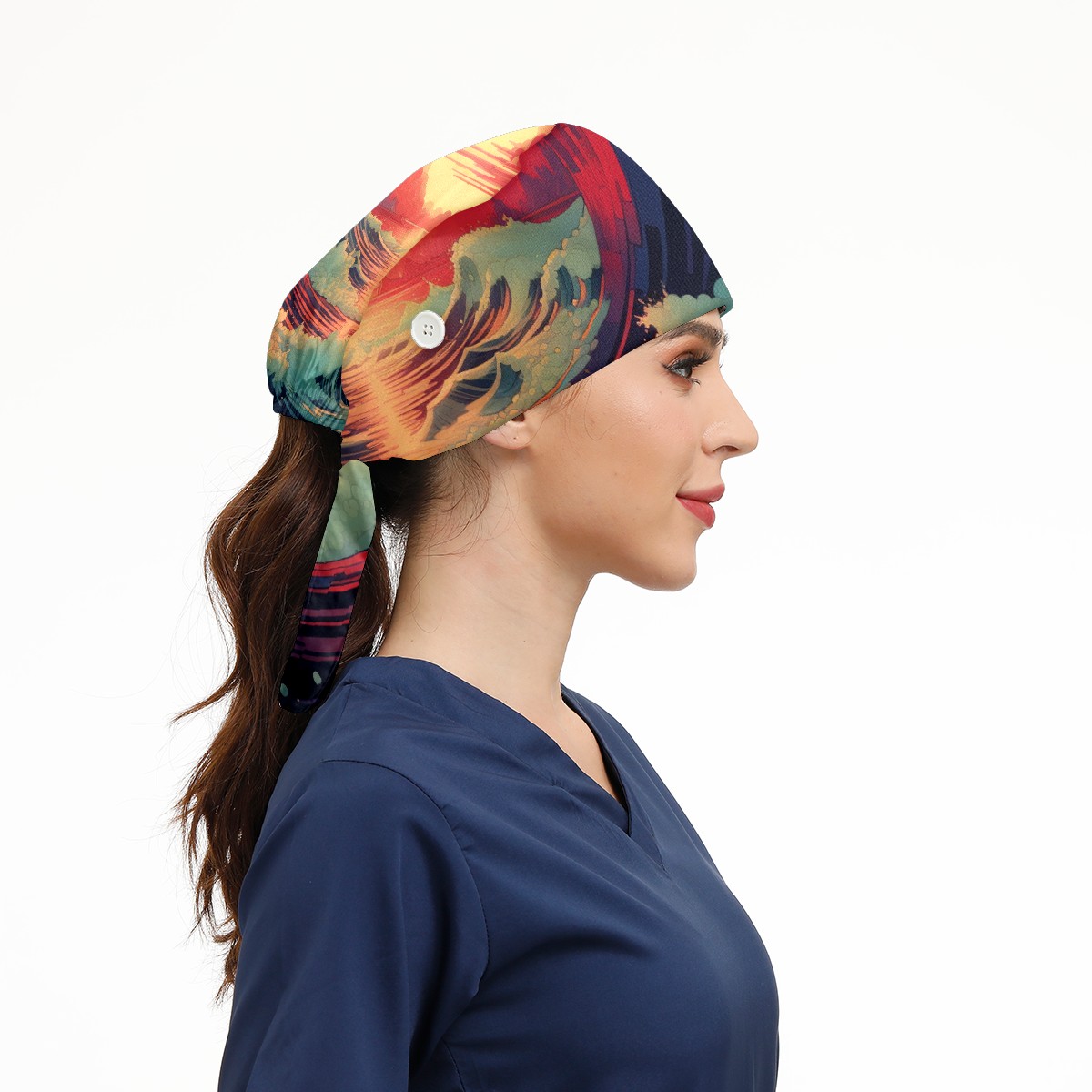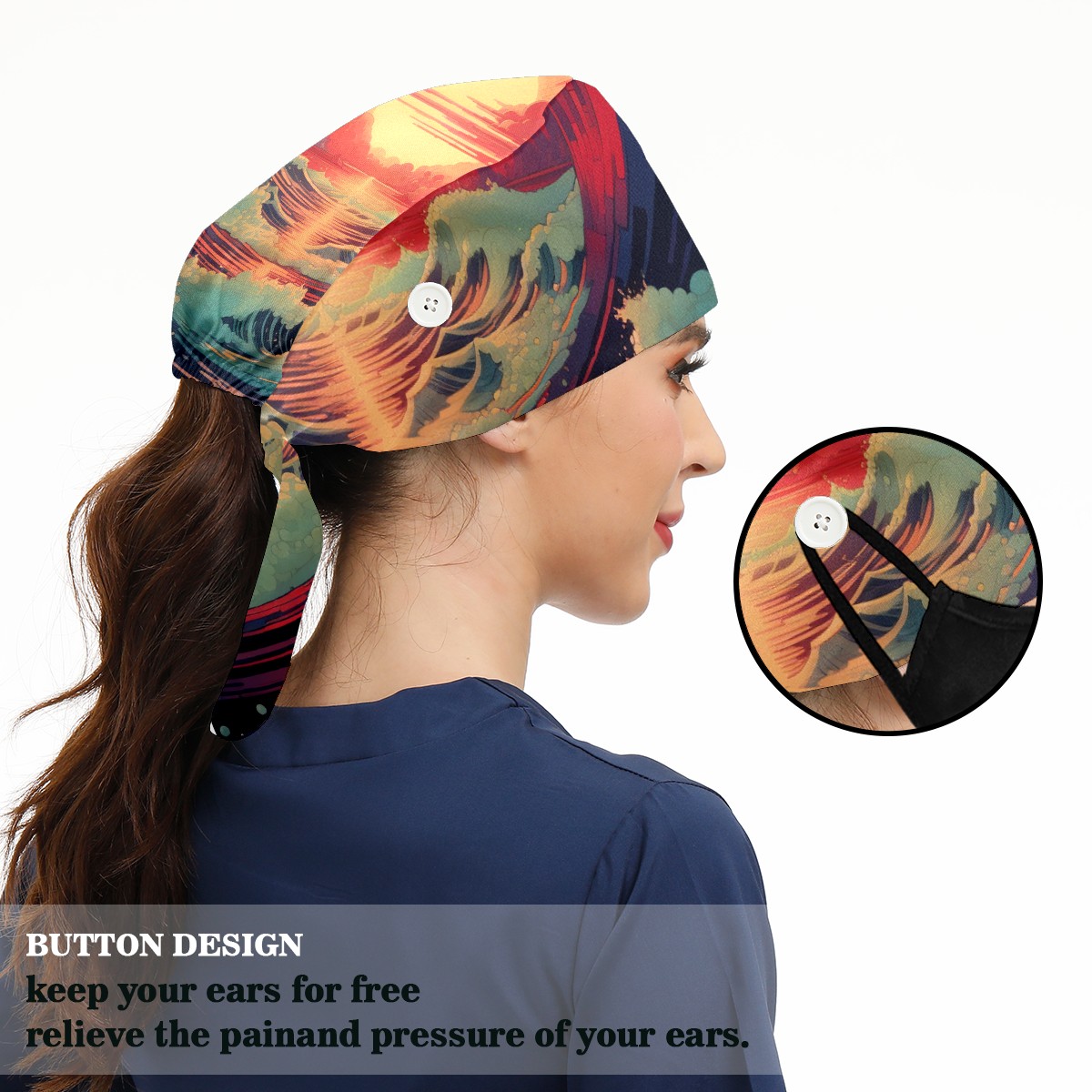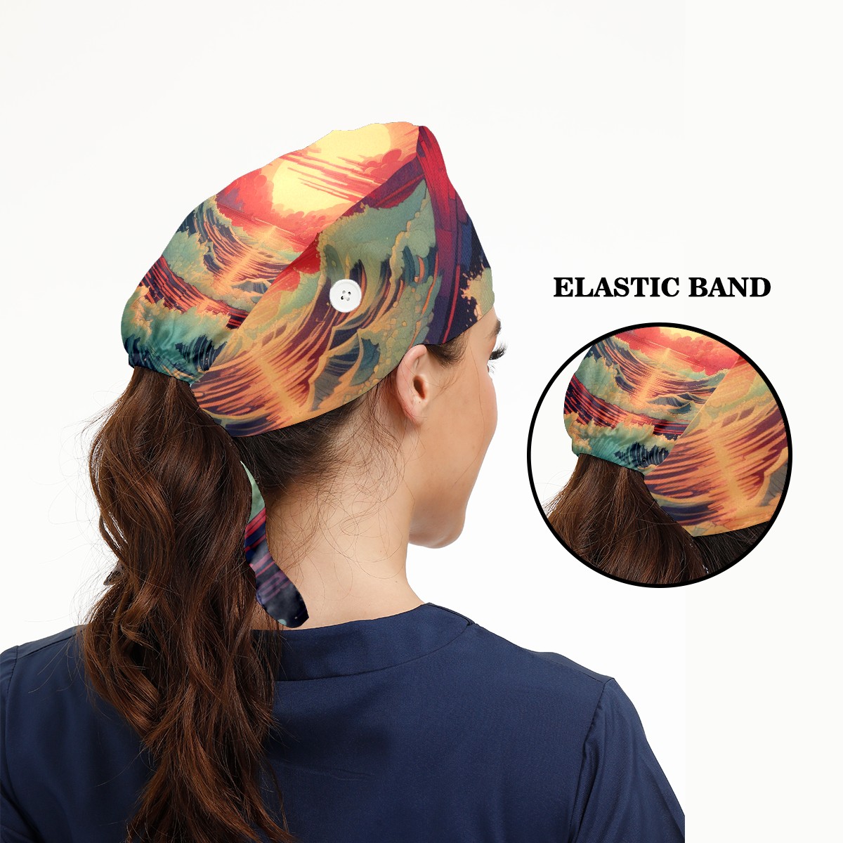 Working Caps with Button&Sweatband Satin Lined Cotton Adjustable Nurse Hats Elastic Band Scrub Cap Surgeon Hat Sunset Wave