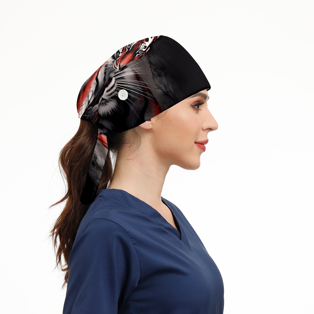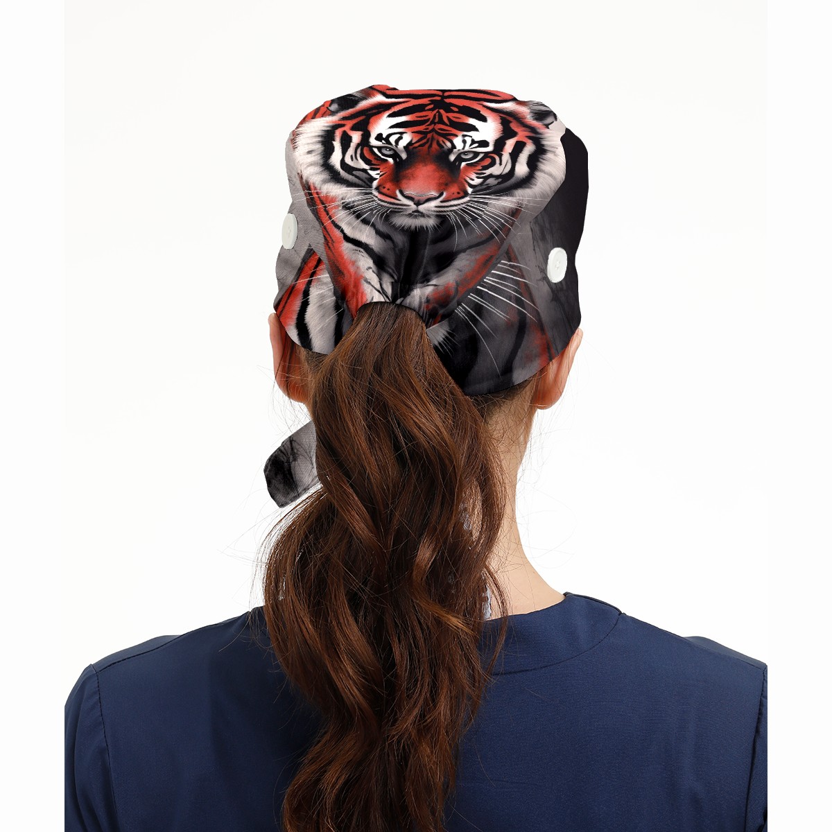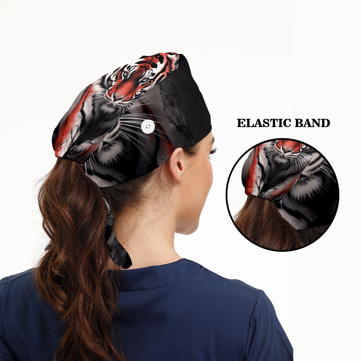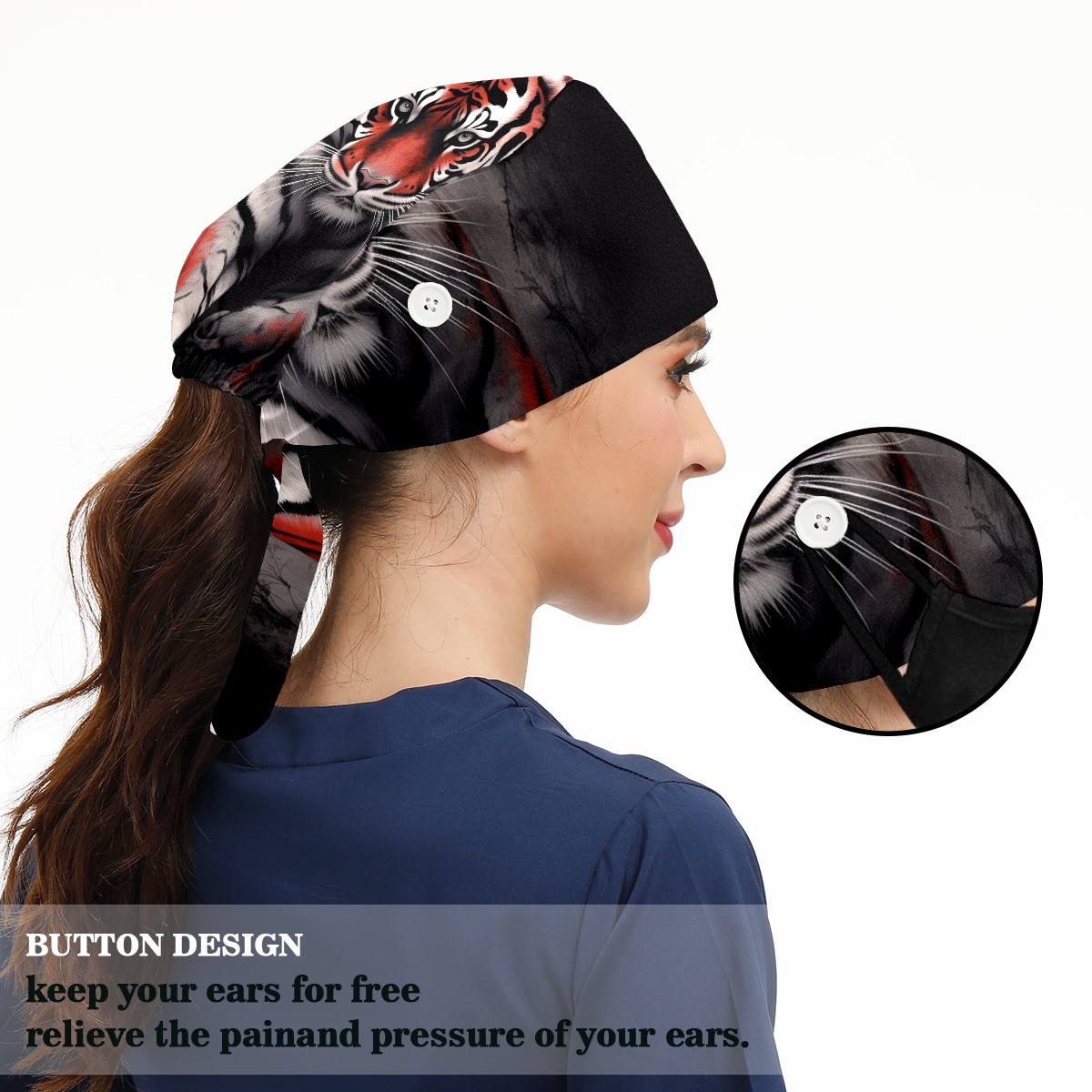 Working Caps with Button&Sweatband Satin Lined Cotton Adjustable Nurse Hats Elastic Band Scrub Cap Surgeon Hat Tiger 2