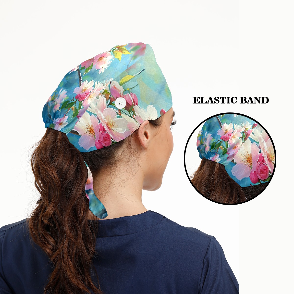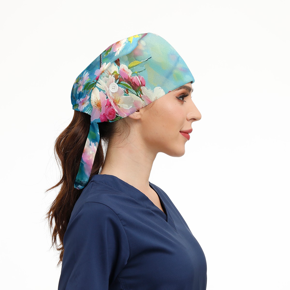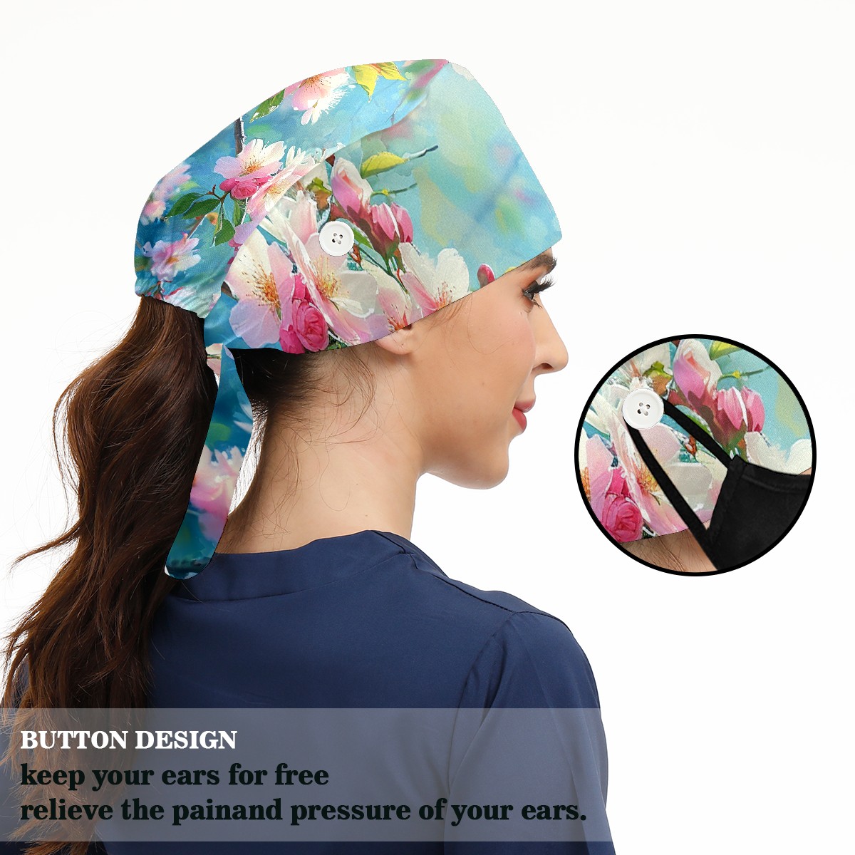 Working Caps with Button&Sweatband Satin Lined Cotton Adjustable Nurse Hats Elastic Band Scrub Cap Surgeon Hat Spring