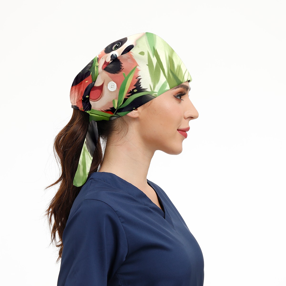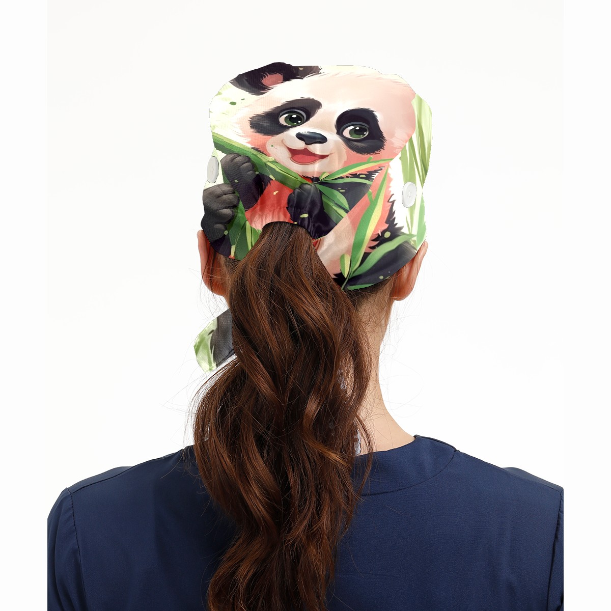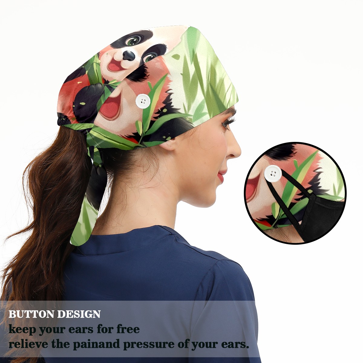 Working Caps with Button&Sweatband Satin Lined Cotton Adjustable Nurse Hats Elastic Band Scrub Cap Surgeon Hat Panda 3