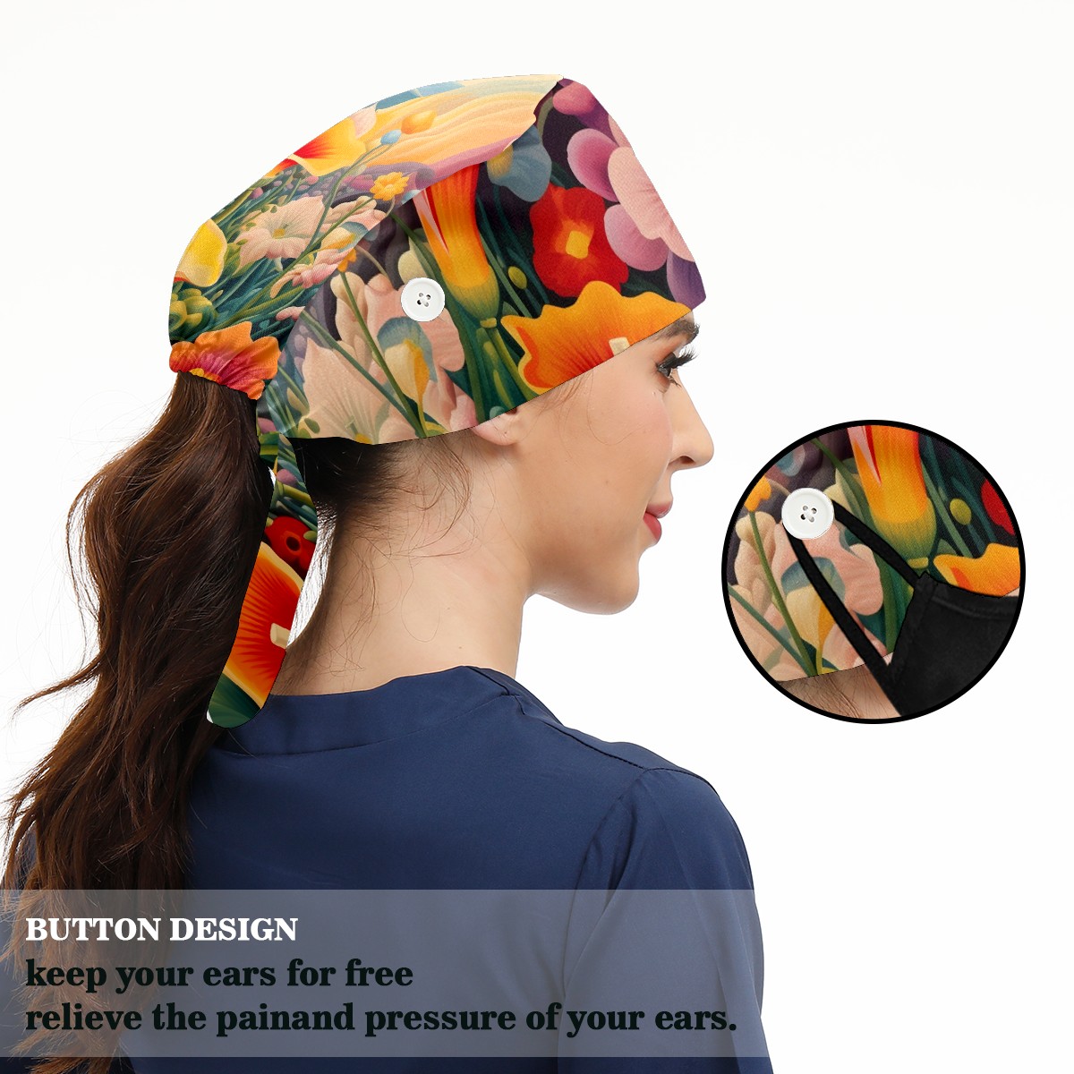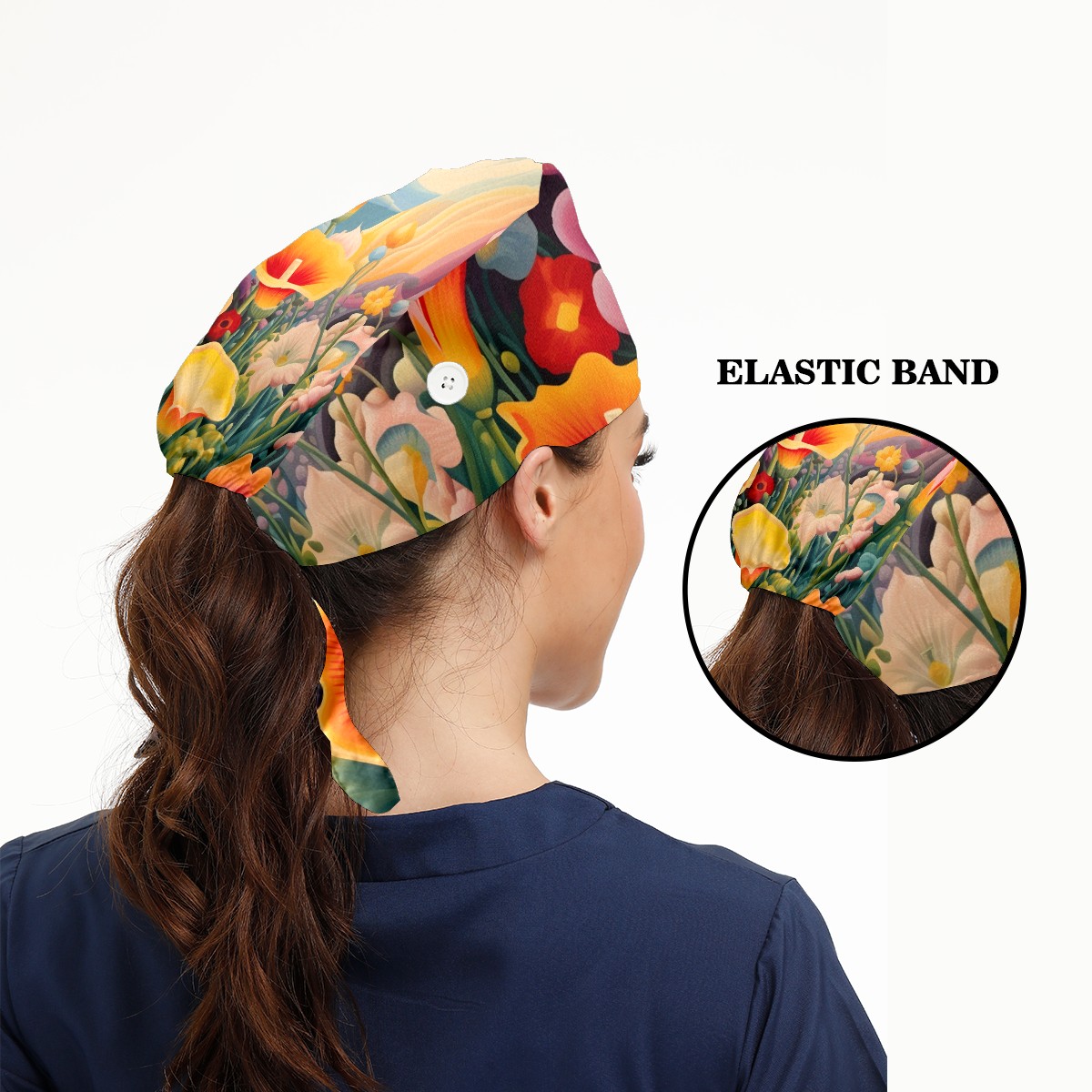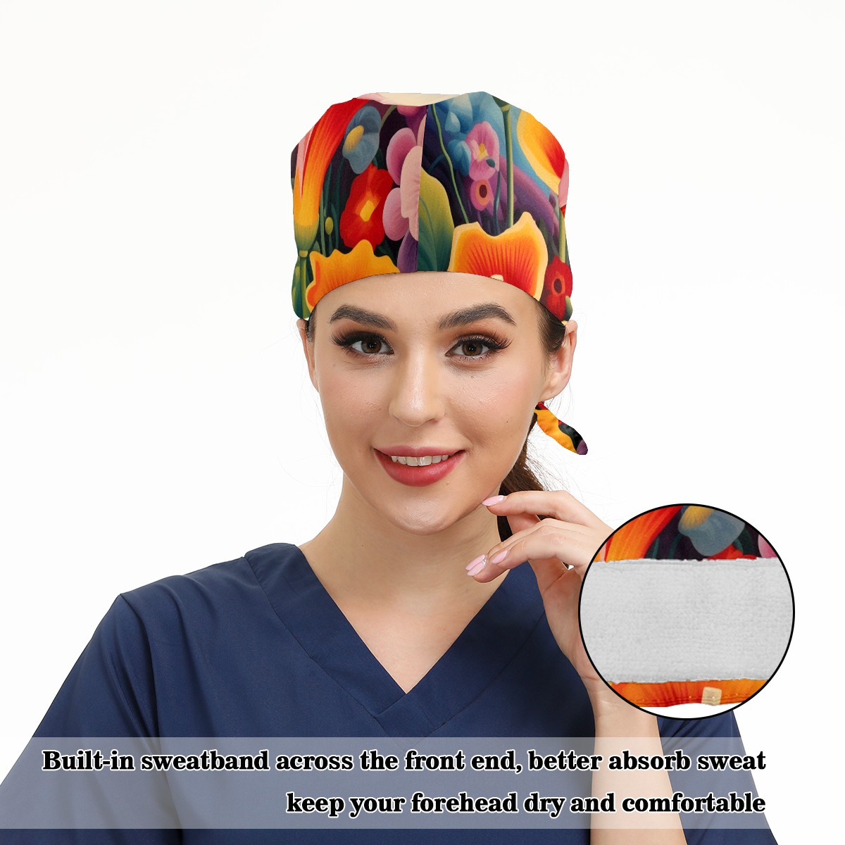 Working Caps with Button&Sweatband Satin Lined Cotton Adjustable Nurse Hats Elastic Band Scrub Cap Surgeon Hat Flower 7