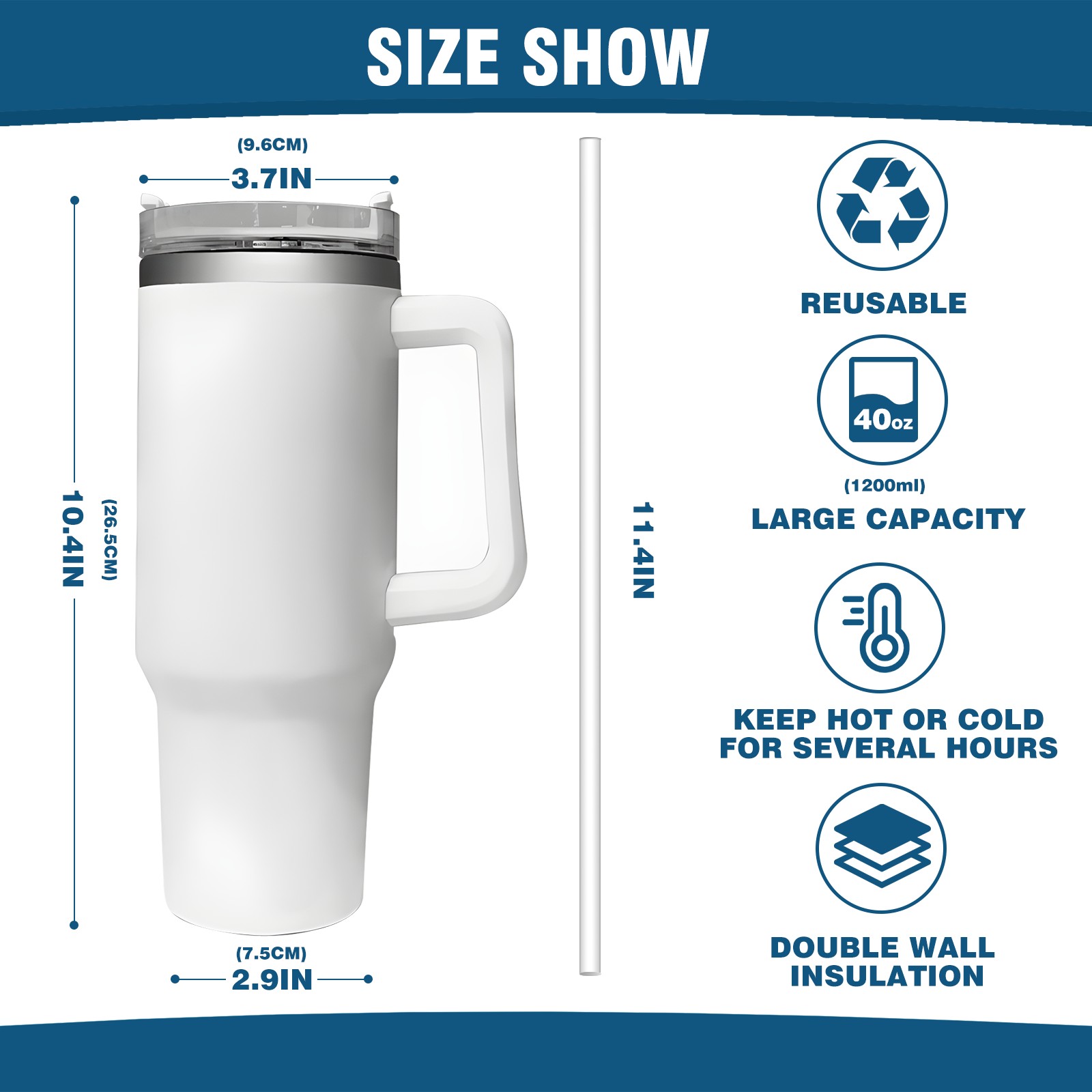 <b>ZXIVGOQFR Tumbler Is Your Dream Cup! </b>Whichever way your day flows, tumbler keeps you refreshed with fewer refills. </br> </br> ●<b>Double Wall Vacuum Insulation </b>means drinks stay cold, iced or hot for hours. </br> ●With advanced lid construction,STRAW OPENING designed to resist splashes with a seal that holds the reusable straw in place, a drink opening, and a full-cover top for added leak resistance. Totally spill proof! </br> ●ZXIVGOQFR Tumbler also included an ergonomic, comfort-grip HANDLE, 40 ounce tumbler cup is 2.9” wide at the base and 3.7” at the top. Narrow base fits just about any car cup holder. So you can bring a smoothie cup, iced coffee cup or extra espresso for your daily commute or weekend outing.