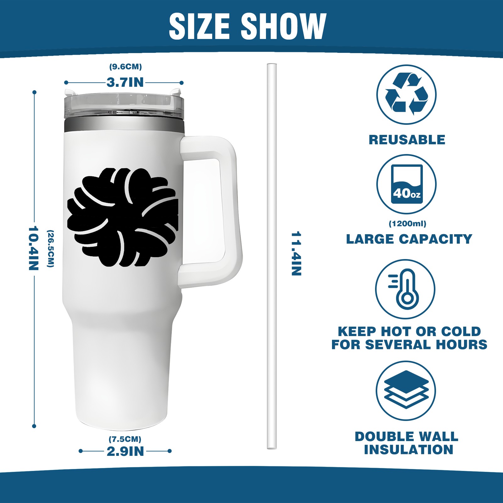 <b>ZXIVGOQFR Tumbler Is Your Dream Cup! </b>Whichever way your day flows, tumbler keeps you refreshed with fewer refills. </br> </br> ●<b>Double Wall Vacuum Insulation </b>means drinks stay cold, iced or hot for hours. </br> ●With advanced lid construction,STRAW OPENING designed to resist splashes with a seal that holds the reusable straw in place, a drink opening, and a full-cover top for added leak resistance. Totally spill proof! </br> ●ZXIVGOQFR Tumbler also included an ergonomic, comfort-grip HANDLE, 40 ounce tumbler cup is 2.9” wide at the base and 3.7” at the top. Narrow base fits just about any car cup holder. So you can bring a smoothie cup, iced coffee cup or extra espresso for your daily commute or weekend outing.