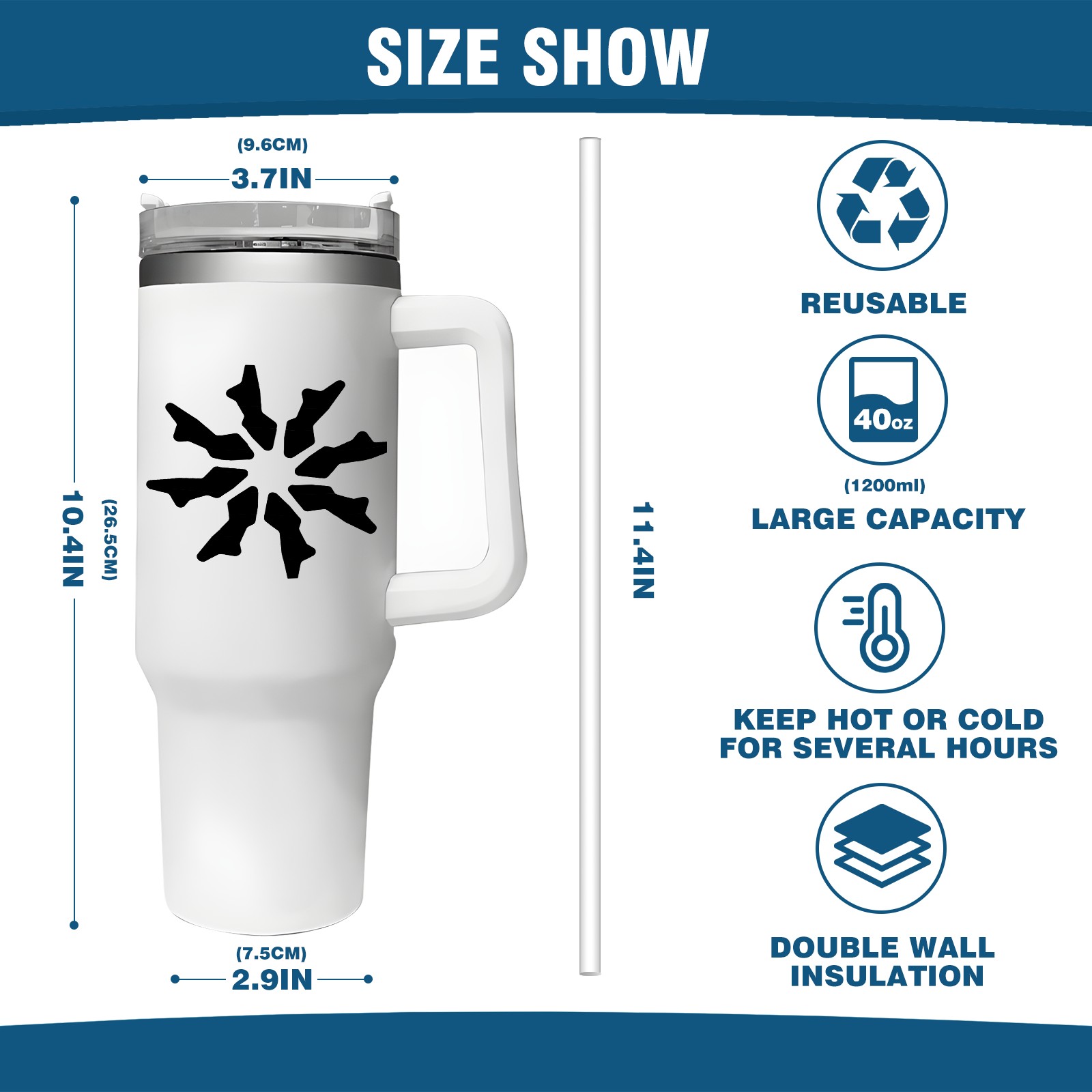 <b>ZXIVGOQFR Tumbler Is Your Dream Cup! </b>Whichever way your day flows, tumbler keeps you refreshed with fewer refills. </br> </br> ●<b>Double Wall Vacuum Insulation </b>means drinks stay cold, iced or hot for hours. </br> ●With advanced lid construction,STRAW OPENING designed to resist splashes with a seal that holds the reusable straw in place, a drink opening, and a full-cover top for added leak resistance. Totally spill proof! </br> ●ZXIVGOQFR Tumbler also included an ergonomic, comfort-grip HANDLE, 40 ounce tumbler cup is 2.9” wide at the base and 3.7” at the top. Narrow base fits just about any car cup holder. So you can bring a smoothie cup, iced coffee cup or extra espresso for your daily commute or weekend outing.