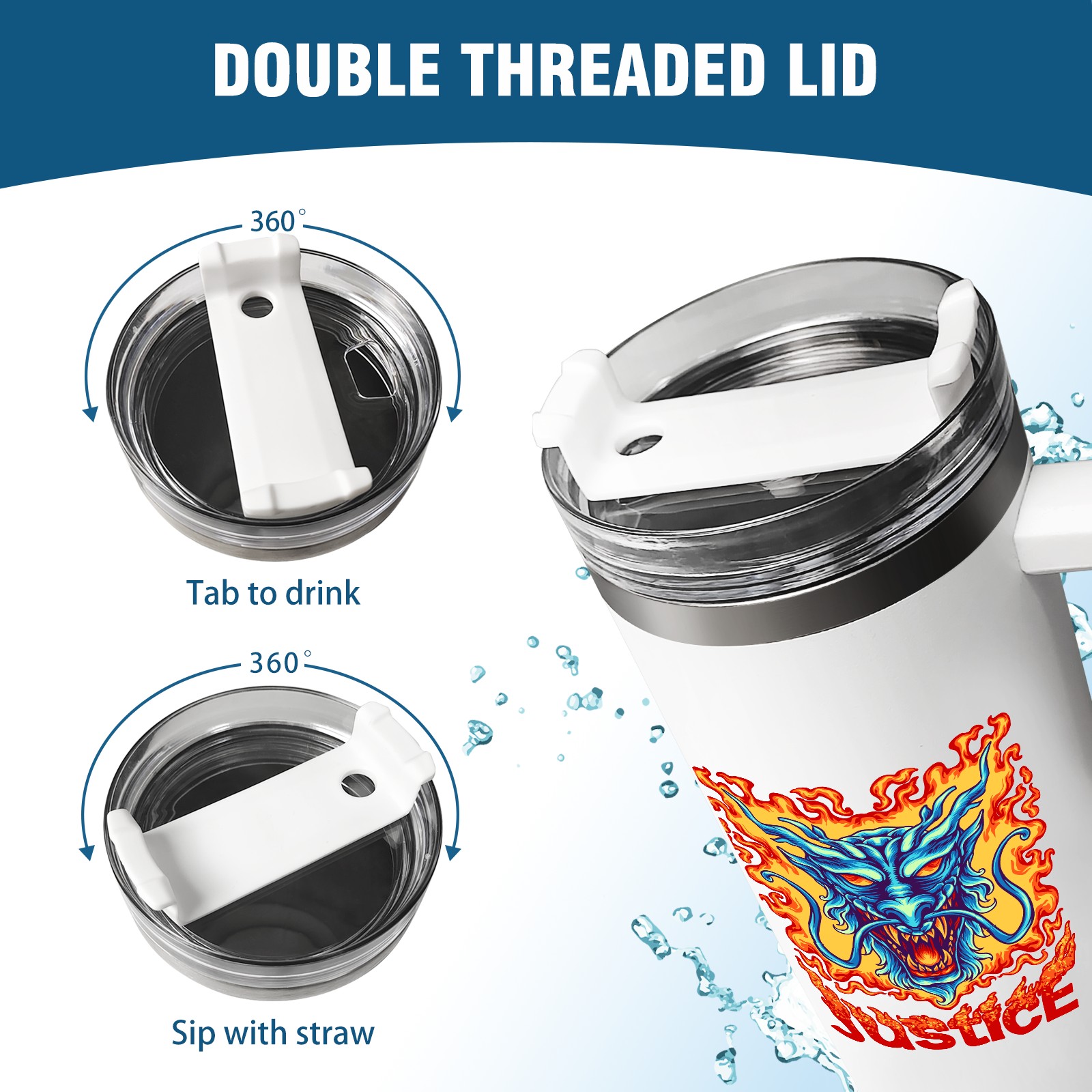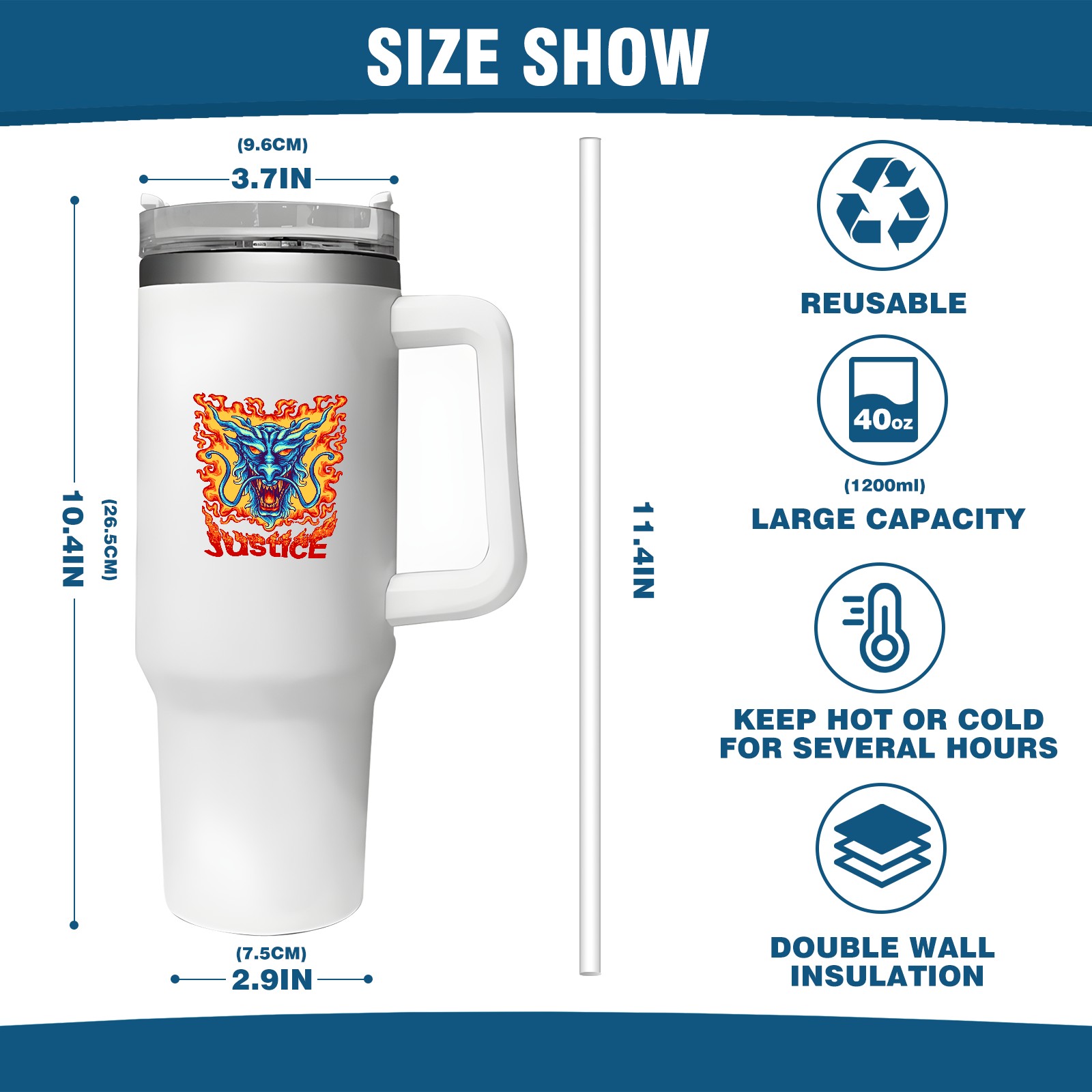 40oz Tumbler with Straw Lid , Handle& Double Wall Vacuum Insulated Cup Reusable Stainless Steel Bottle Trave Mug coffee tumblers BPA Powder Coated Justice