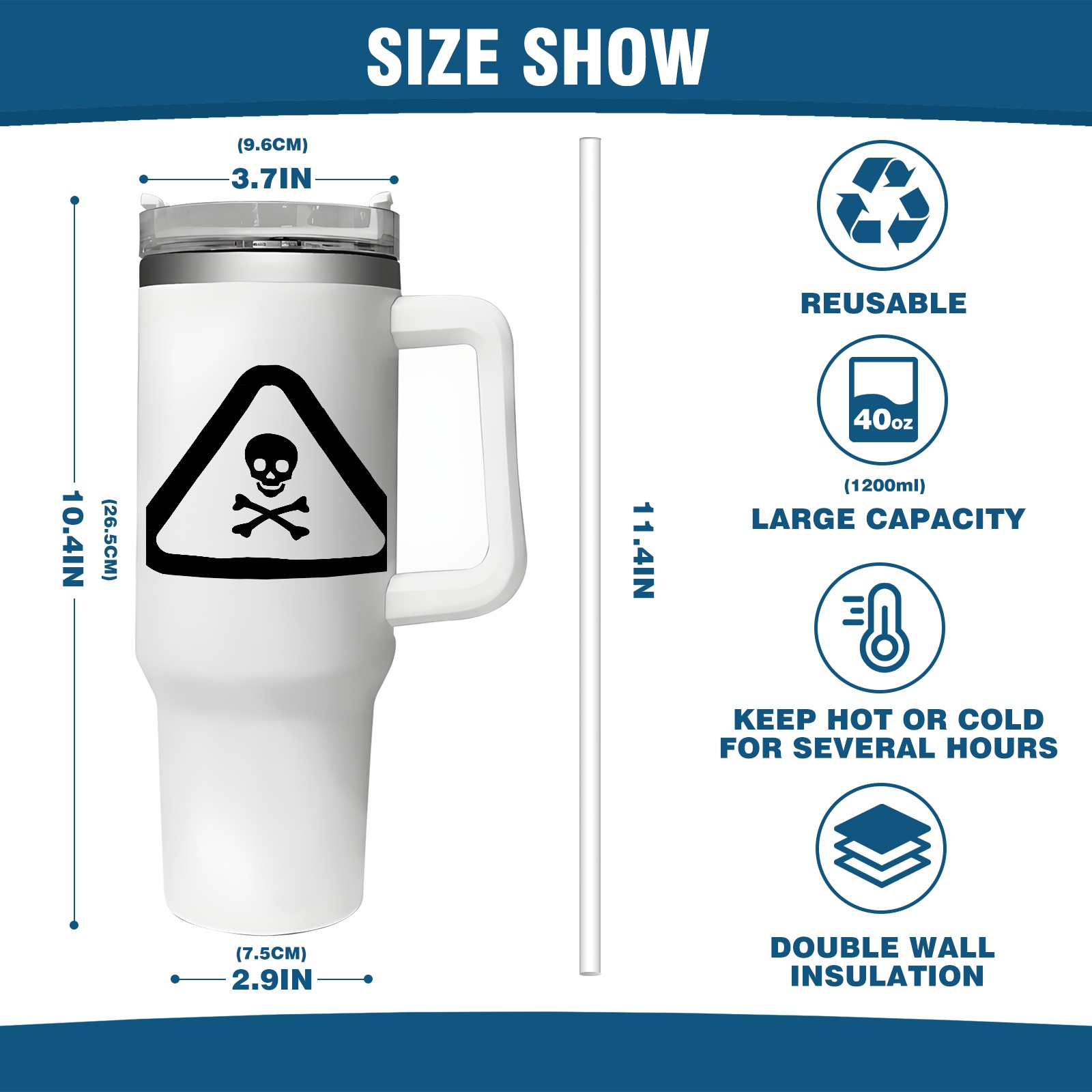 <b>ZXIVGOQFR Tumbler Is Your Dream Cup! </b>Whichever way your day flows, tumbler keeps you refreshed with fewer refills. </br> </br> ●<b>Double Wall Vacuum Insulation </b>means drinks stay cold, iced or hot for hours. </br> ●With advanced lid construction,STRAW OPENING designed to resist splashes with a seal that holds the reusable straw in place, a drink opening, and a full-cover top for added leak resistance. Totally spill proof! </br> ●ZXIVGOQFR Tumbler also included an ergonomic, comfort-grip HANDLE, 40 ounce tumbler cup is 2.9” wide at the base and 3.7” at the top. Narrow base fits just about any car cup holder. So you can bring a smoothie cup, iced coffee cup or extra espresso for your daily commute or weekend outing.