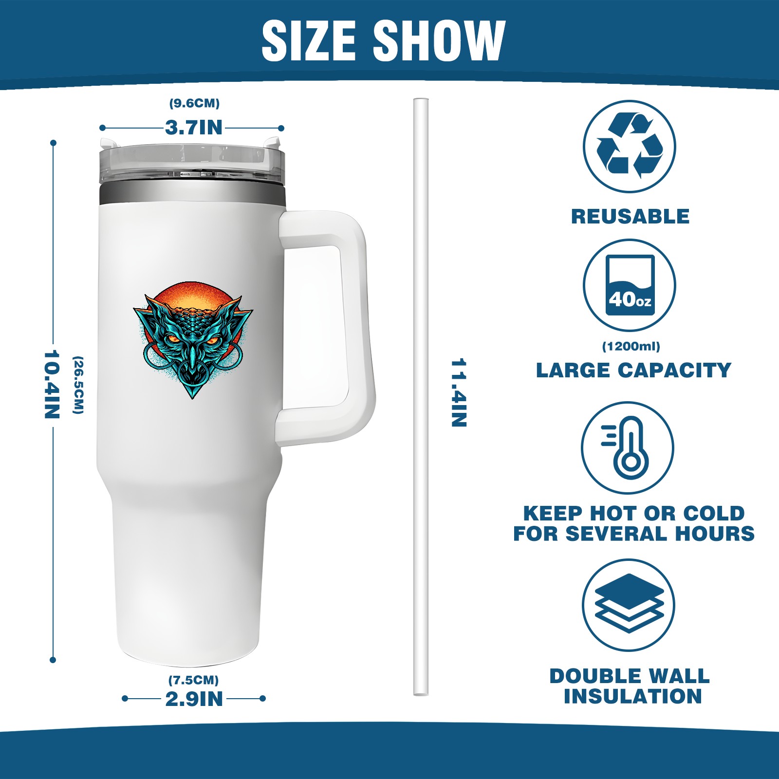 <b>ZXIVGOQFR Tumbler Is Your Dream Cup! </b>Whichever way your day flows, tumbler keeps you refreshed with fewer refills. </br> </br> ●<b>Double Wall Vacuum Insulation </b>means drinks stay cold, iced or hot for hours. </br> ●With advanced lid construction,STRAW OPENING designed to resist splashes with a seal that holds the reusable straw in place, a drink opening, and a full-cover top for added leak resistance. Totally spill proof! </br> ●ZXIVGOQFR Tumbler also included an ergonomic, comfort-grip HANDLE, 40 ounce tumbler cup is 2.9” wide at the base and 3.7” at the top. Narrow base fits just about any car cup holder. So you can bring a smoothie cup, iced coffee cup or extra espresso for your daily commute or weekend outing.
