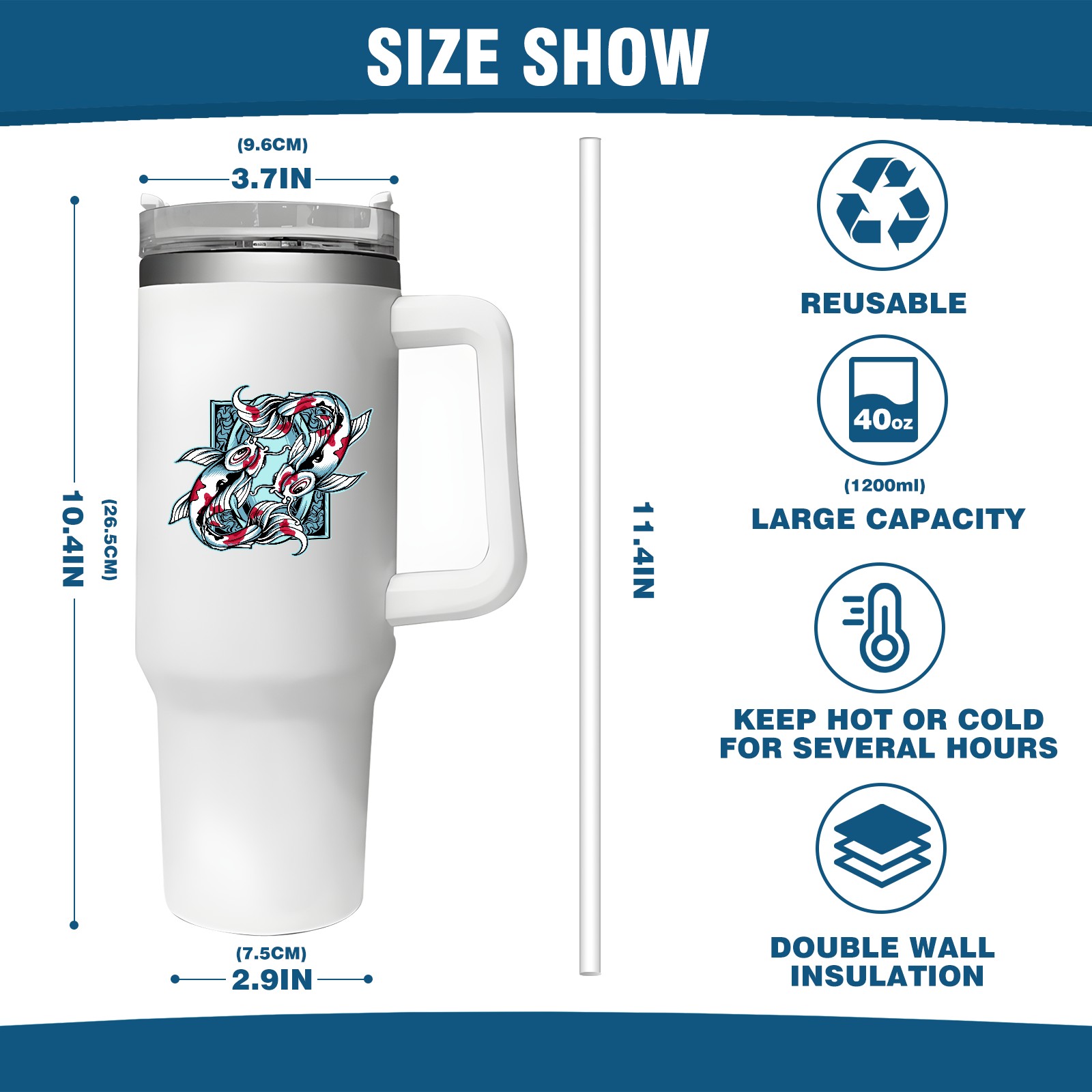 <b>ZXIVGOQFR Tumbler Is Your Dream Cup! </b>Whichever way your day flows, tumbler keeps you refreshed with fewer refills. </br> </br> ●<b>Double Wall Vacuum Insulation </b>means drinks stay cold, iced or hot for hours. </br> ●With advanced lid construction,STRAW OPENING designed to resist splashes with a seal that holds the reusable straw in place, a drink opening, and a full-cover top for added leak resistance. Totally spill proof! </br> ●ZXIVGOQFR Tumbler also included an ergonomic, comfort-grip HANDLE, 40 ounce tumbler cup is 2.9” wide at the base and 3.7” at the top. Narrow base fits just about any car cup holder. So you can bring a smoothie cup, iced coffee cup or extra espresso for your daily commute or weekend outing.