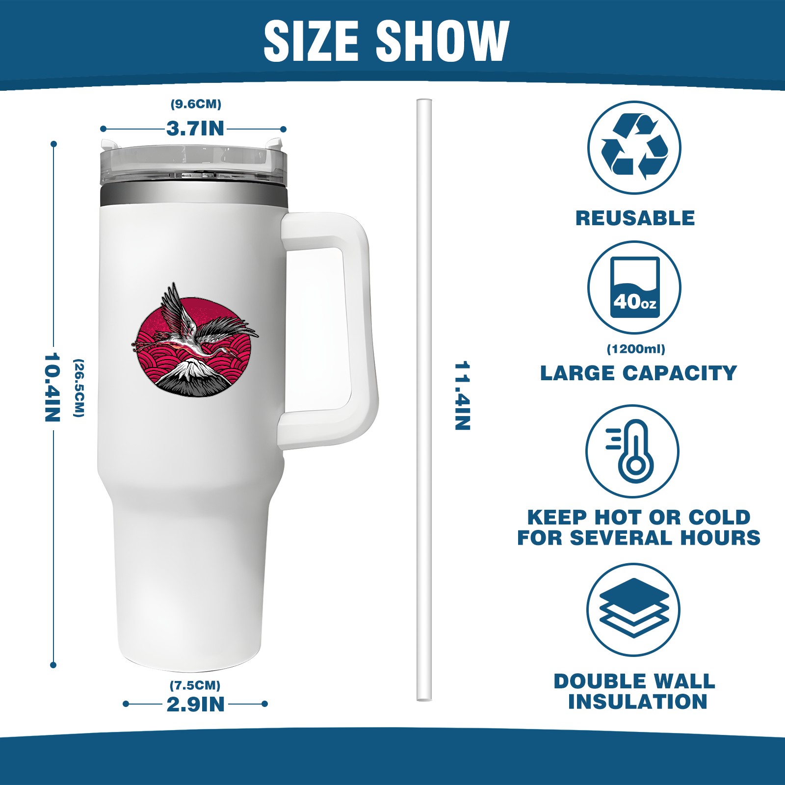 <b>ZXIVGOQFR Tumbler Is Your Dream Cup! </b>Whichever way your day flows, tumbler keeps you refreshed with fewer refills. </br> </br> ●<b>Double Wall Vacuum Insulation </b>means drinks stay cold, iced or hot for hours. </br> ●With advanced lid construction,STRAW OPENING designed to resist splashes with a seal that holds the reusable straw in place, a drink opening, and a full-cover top for added leak resistance. Totally spill proof! </br> ●ZXIVGOQFR Tumbler also included an ergonomic, comfort-grip HANDLE, 40 ounce tumbler cup is 2.9” wide at the base and 3.7” at the top. Narrow base fits just about any car cup holder. So you can bring a smoothie cup, iced coffee cup or extra espresso for your daily commute or weekend outing.