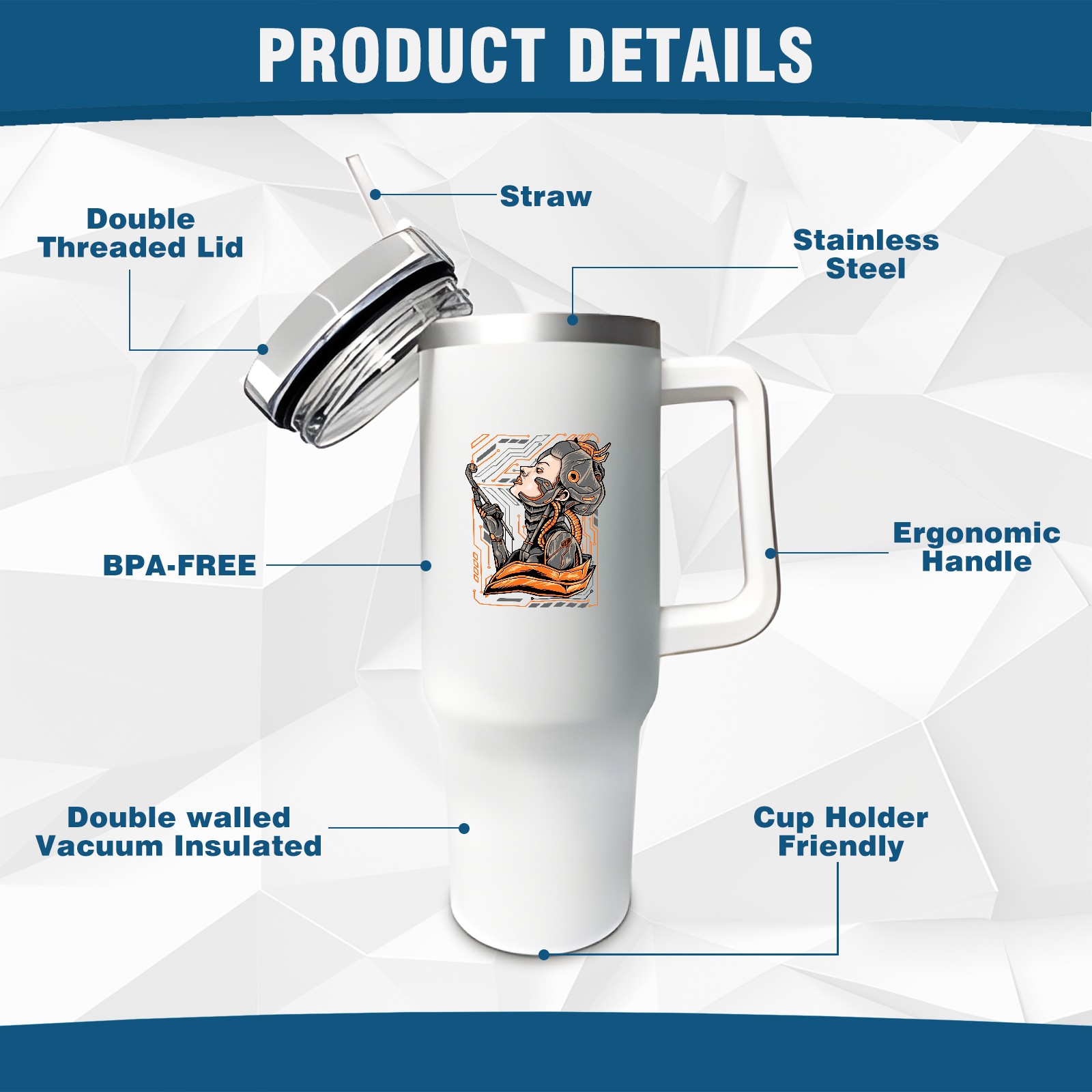 <b>ZXIVGOQFR Tumbler Is Your Dream Cup! </b>Whichever way your day flows, tumbler keeps you refreshed with fewer refills. </br> </br> ●<b>Double Wall Vacuum Insulation </b>means drinks stay cold, iced or hot for hours. </br> ●With advanced lid construction,STRAW OPENING designed to resist splashes with a seal that holds the reusable straw in place, a drink opening, and a full-cover top for added leak resistance. Totally spill proof! </br> ●ZXIVGOQFR Tumbler also included an ergonomic, comfort-grip HANDLE, 40 ounce tumbler cup is 2.9” wide at the base and 3.7” at the top. Narrow base fits just about any car cup holder. So you can bring a smoothie cup, iced coffee cup or extra espresso for your daily commute or weekend outing.