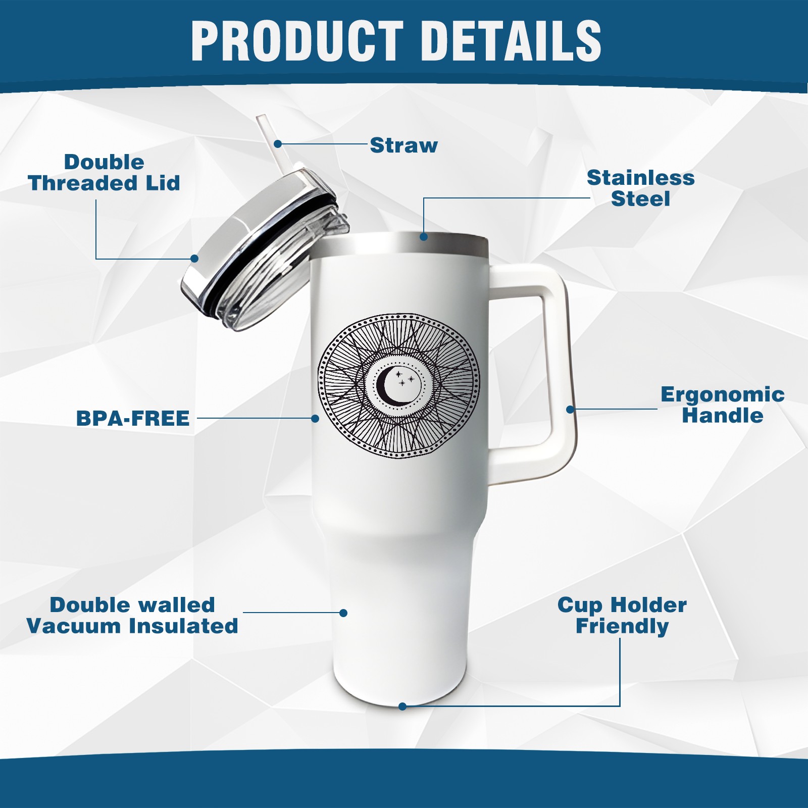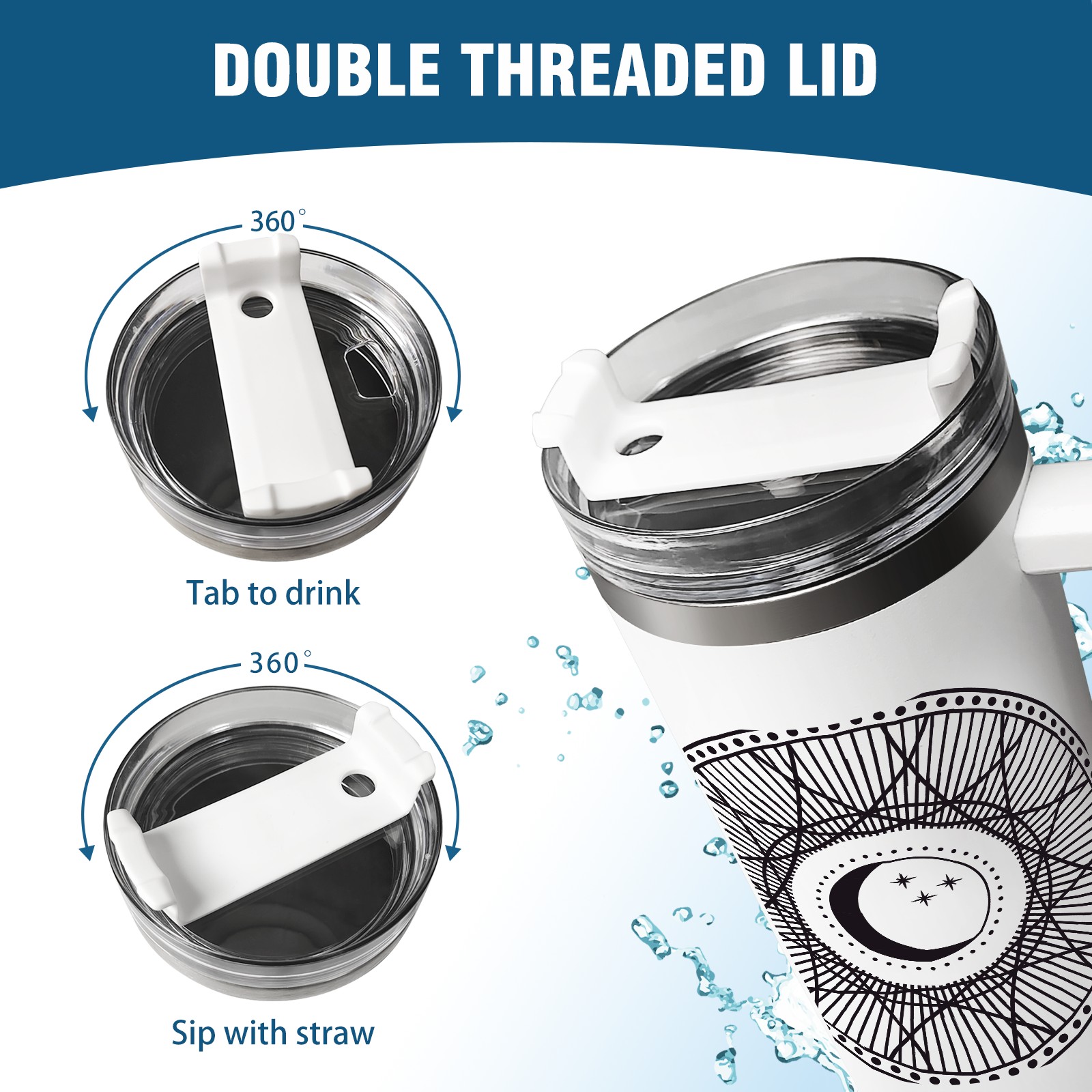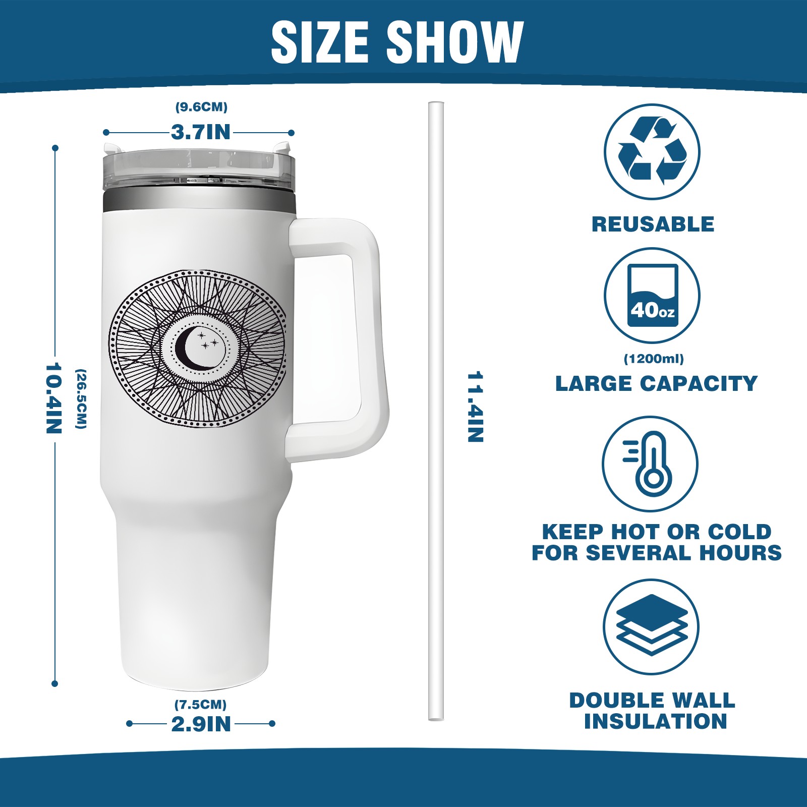 <b>ZXIVGOQFR Tumbler Is Your Dream Cup! </b>Whichever way your day flows, tumbler keeps you refreshed with fewer refills. </br> </br> ●<b>Double Wall Vacuum Insulation </b>means drinks stay cold, iced or hot for hours. </br> ●With advanced lid construction,STRAW OPENING designed to resist splashes with a seal that holds the reusable straw in place, a drink opening, and a full-cover top for added leak resistance. Totally spill proof! </br> ●ZXIVGOQFR Tumbler also included an ergonomic, comfort-grip HANDLE, 40 ounce tumbler cup is 2.9” wide at the base and 3.7” at the top. Narrow base fits just about any car cup holder. So you can bring a smoothie cup, iced coffee cup or extra espresso for your daily commute or weekend outing.