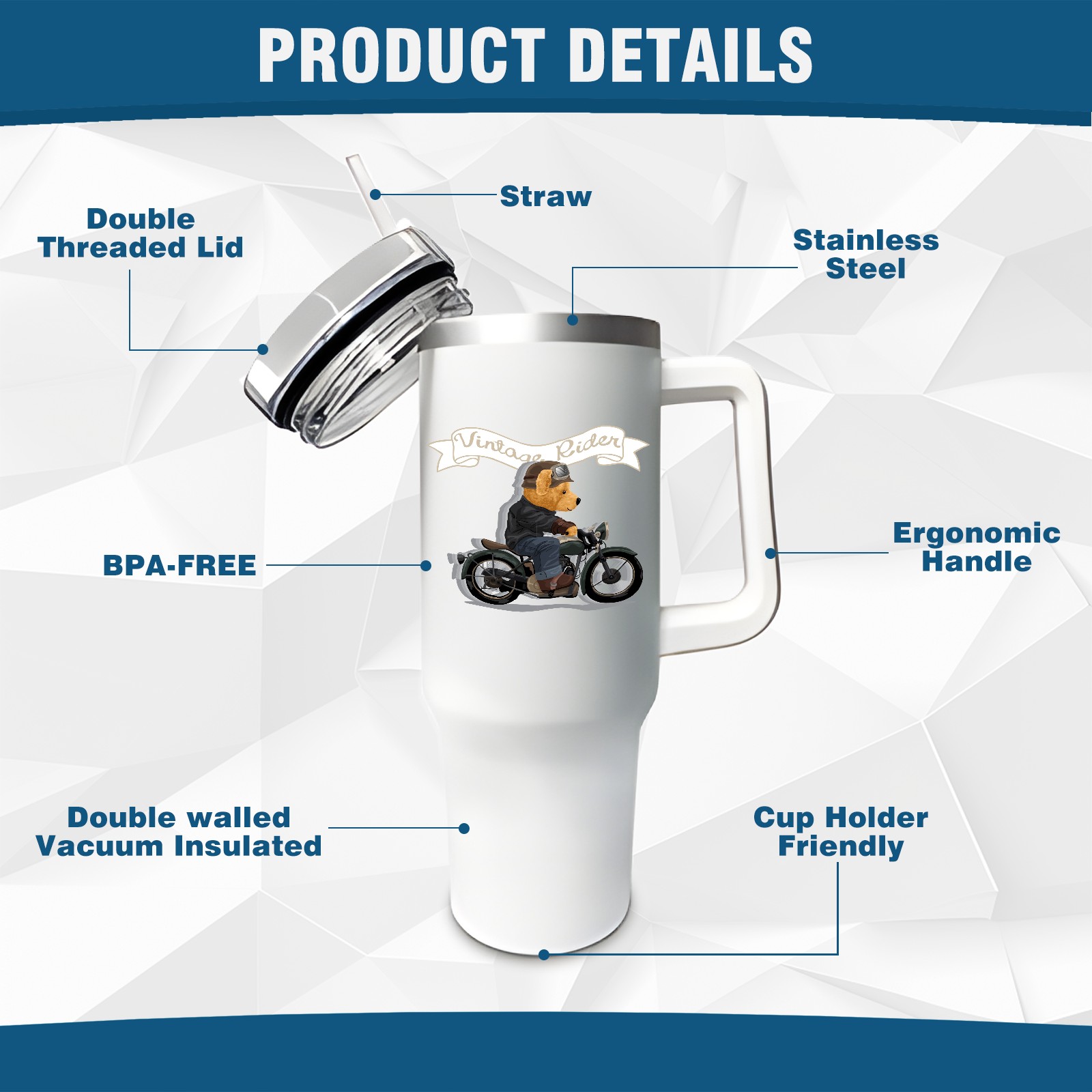 <b>ZXIVGOQFR Tumbler Is Your Dream Cup! </b>Whichever way your day flows, tumbler keeps you refreshed with fewer refills. </br> </br> ●<b>Double Wall Vacuum Insulation </b>means drinks stay cold, iced or hot for hours. </br> ●With advanced lid construction,STRAW OPENING designed to resist splashes with a seal that holds the reusable straw in place, a drink opening, and a full-cover top for added leak resistance. Totally spill proof! </br> ●ZXIVGOQFR Tumbler also included an ergonomic, comfort-grip HANDLE, 40 ounce tumbler cup is 2.9” wide at the base and 3.7” at the top. Narrow base fits just about any car cup holder. So you can bring a smoothie cup, iced coffee cup or extra espresso for your daily commute or weekend outing.