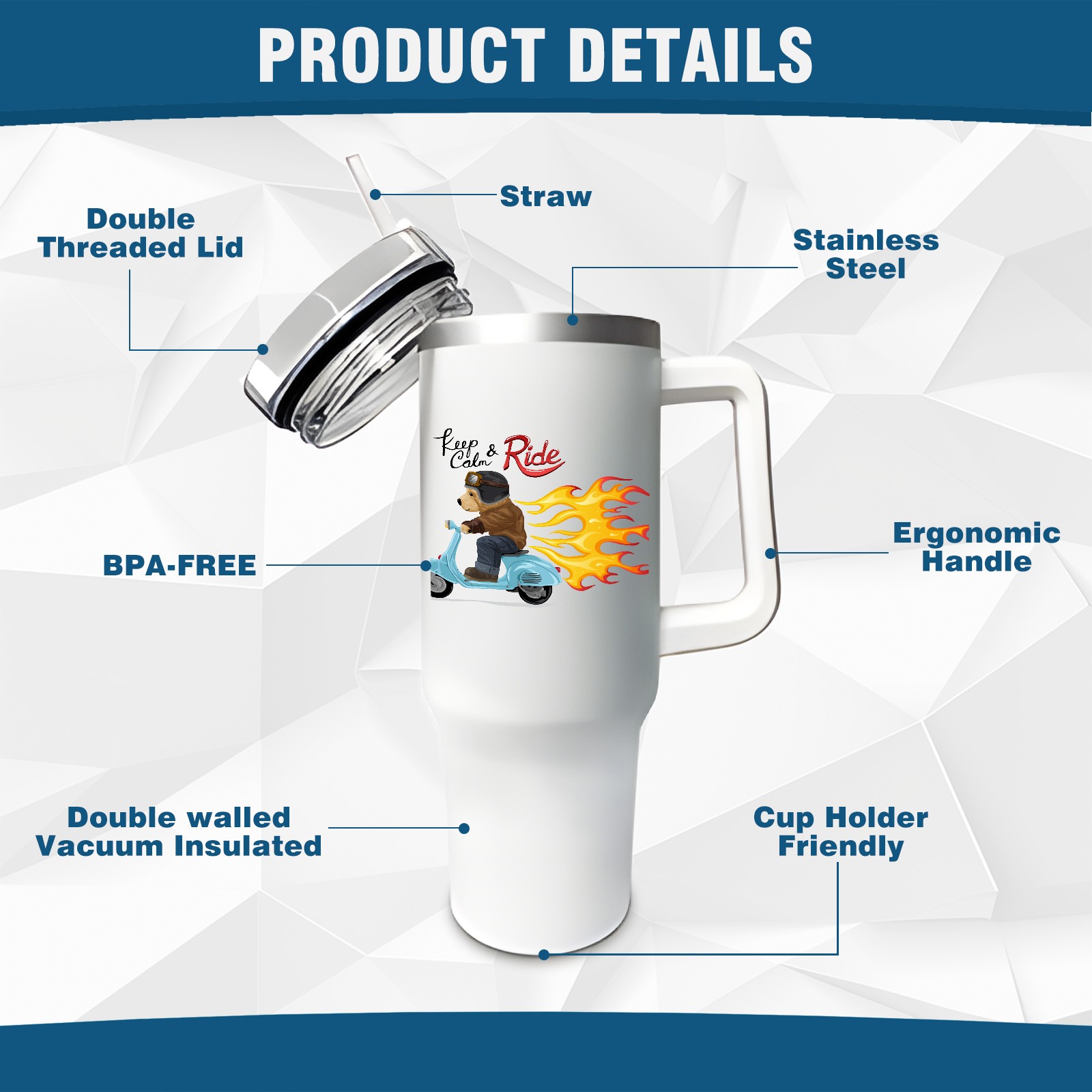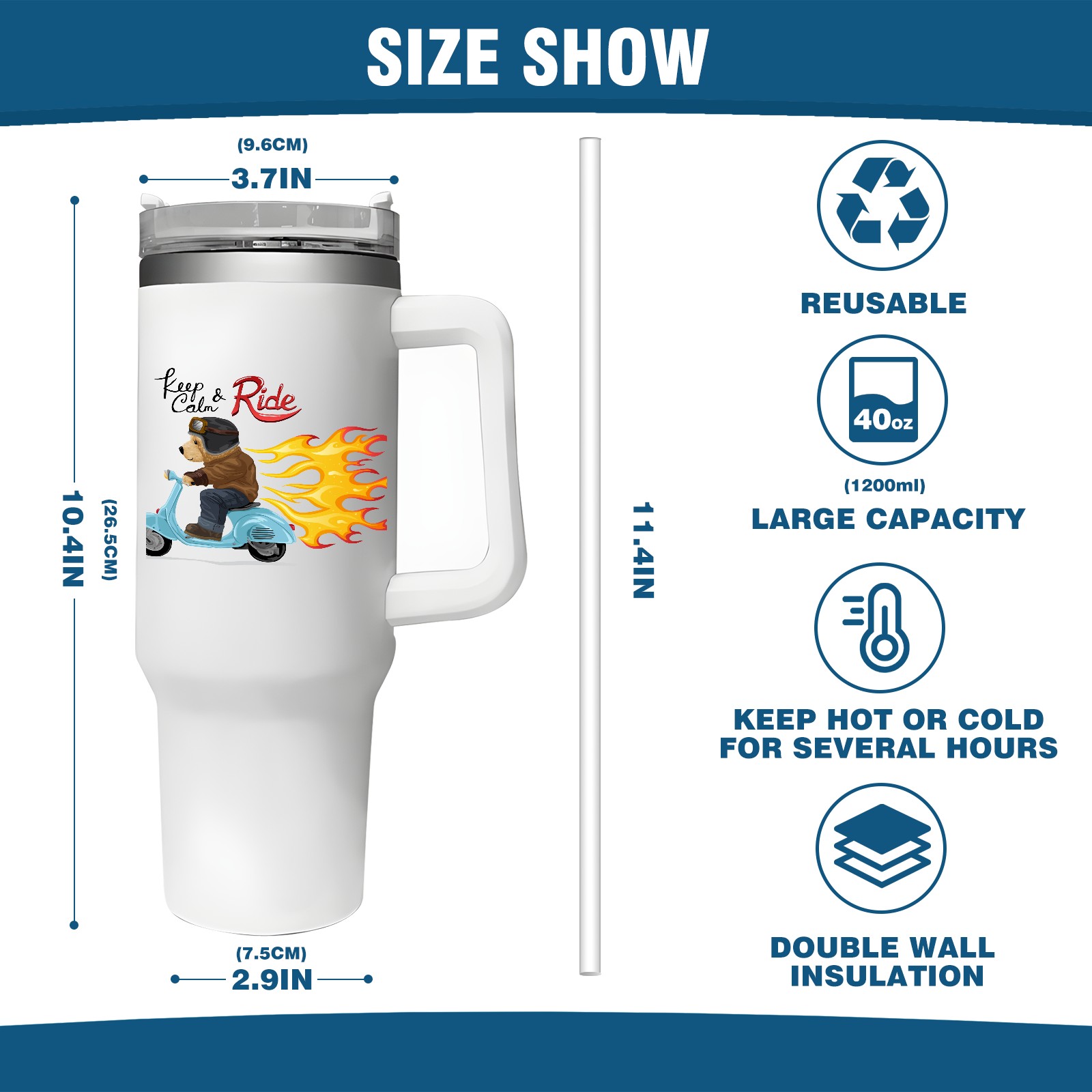 40oz Tumbler with Straw Lid , Handle& Double Wall Vacuum Insulated Cup Reusable Stainless Steel Bottle Trave Mug coffee tumblers BPA Powder Coated Keep Ride Calm