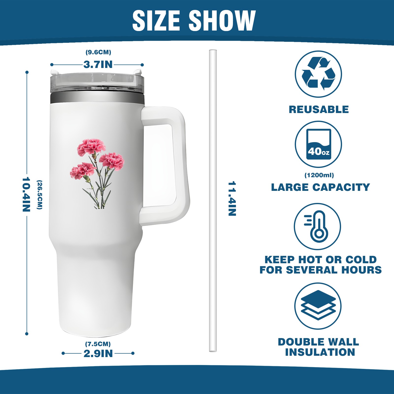 <b>ZXIVGOQFR Tumbler Is Your Dream Cup! </b>Whichever way your day flows, tumbler keeps you refreshed with fewer refills. </br> </br> ●<b>Double Wall Vacuum Insulation </b>means drinks stay cold, iced or hot for hours. </br> ●With advanced lid construction,STRAW OPENING designed to resist splashes with a seal that holds the reusable straw in place, a drink opening, and a full-cover top for added leak resistance. Totally spill proof! </br> ●ZXIVGOQFR Tumbler also included an ergonomic, comfort-grip HANDLE, 40 ounce tumbler cup is 2.9” wide at the base and 3.7” at the top. Narrow base fits just about any car cup holder. So you can bring a smoothie cup, iced coffee cup or extra espresso for your daily commute or weekend outing.