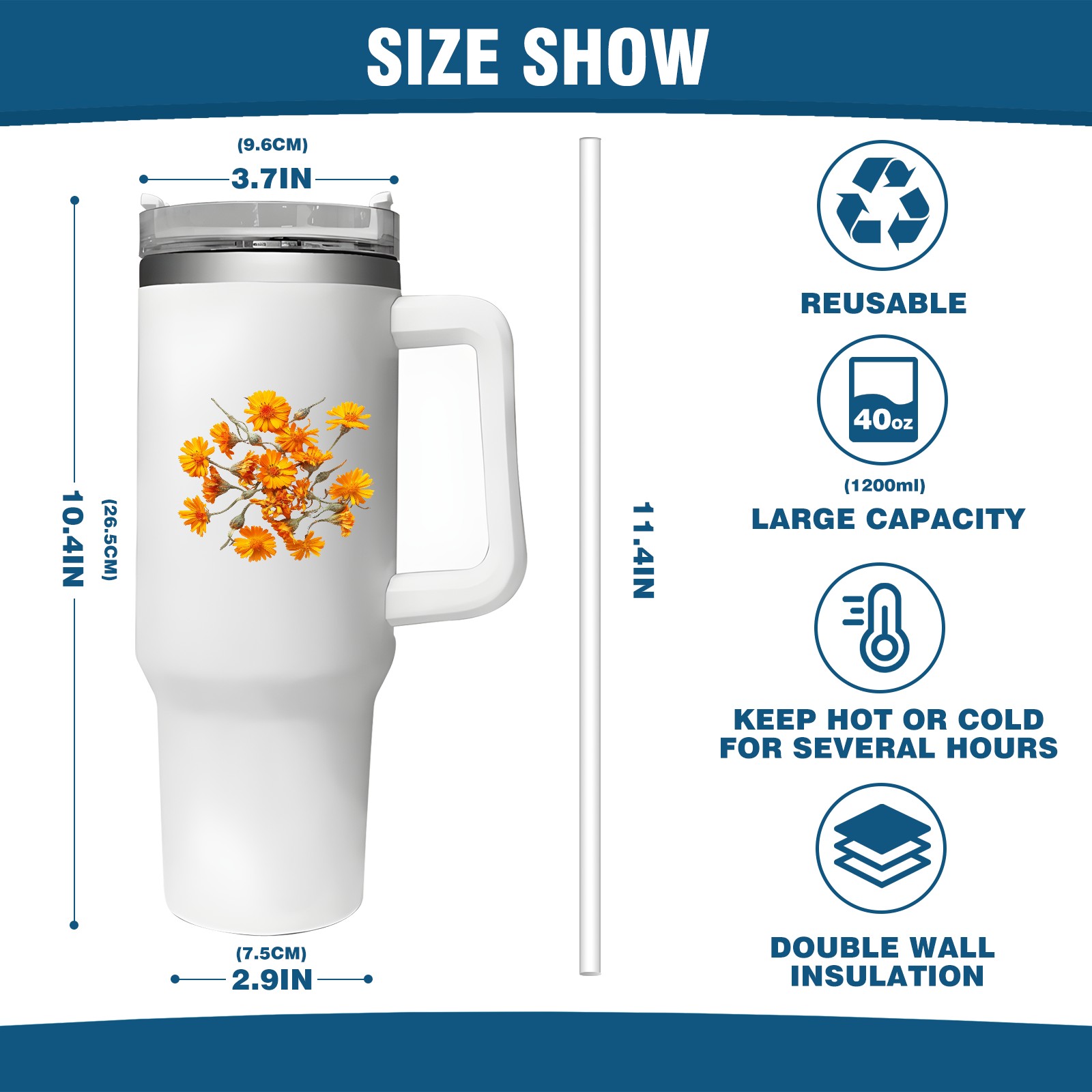<b>ZXIVGOQFR Tumbler Is Your Dream Cup! </b>Whichever way your day flows, tumbler keeps you refreshed with fewer refills. </br> </br> ●<b>Double Wall Vacuum Insulation </b>means drinks stay cold, iced or hot for hours. </br> ●With advanced lid construction,STRAW OPENING designed to resist splashes with a seal that holds the reusable straw in place, a drink opening, and a full-cover top for added leak resistance. Totally spill proof! </br> ●ZXIVGOQFR Tumbler also included an ergonomic, comfort-grip HANDLE, 40 ounce tumbler cup is 2.9” wide at the base and 3.7” at the top. Narrow base fits just about any car cup holder. So you can bring a smoothie cup, iced coffee cup or extra espresso for your daily commute or weekend outing.