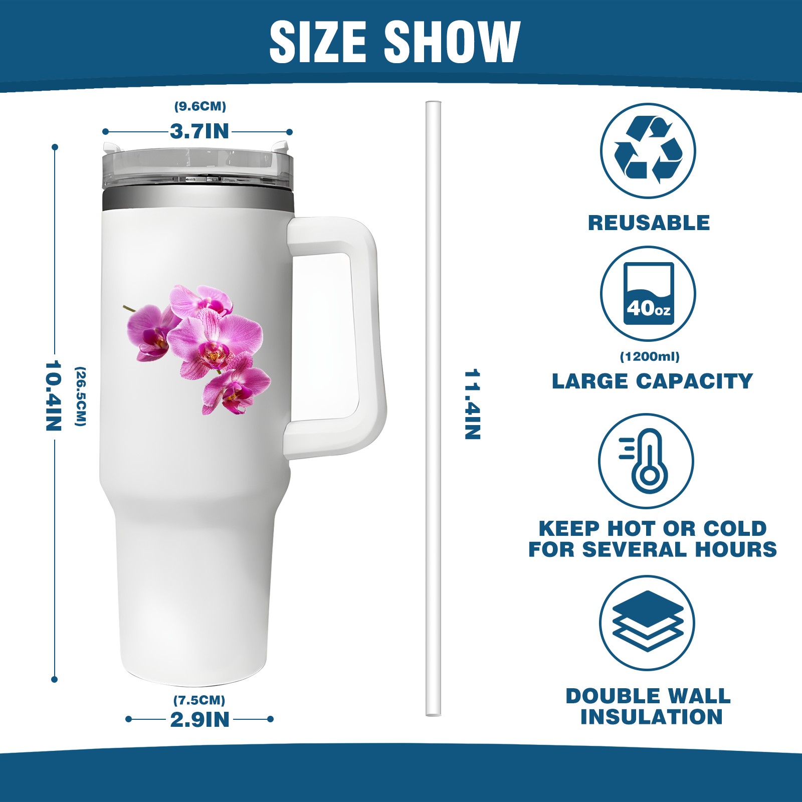 <b>ZXIVGOQFR Tumbler Is Your Dream Cup! </b>Whichever way your day flows, tumbler keeps you refreshed with fewer refills. </br> </br> ●<b>Double Wall Vacuum Insulation </b>means drinks stay cold, iced or hot for hours. </br> ●With advanced lid construction,STRAW OPENING designed to resist splashes with a seal that holds the reusable straw in place, a drink opening, and a full-cover top for added leak resistance. Totally spill proof! </br> ●ZXIVGOQFR Tumbler also included an ergonomic, comfort-grip HANDLE, 40 ounce tumbler cup is 2.9” wide at the base and 3.7” at the top. Narrow base fits just about any car cup holder. So you can bring a smoothie cup, iced coffee cup or extra espresso for your daily commute or weekend outing.