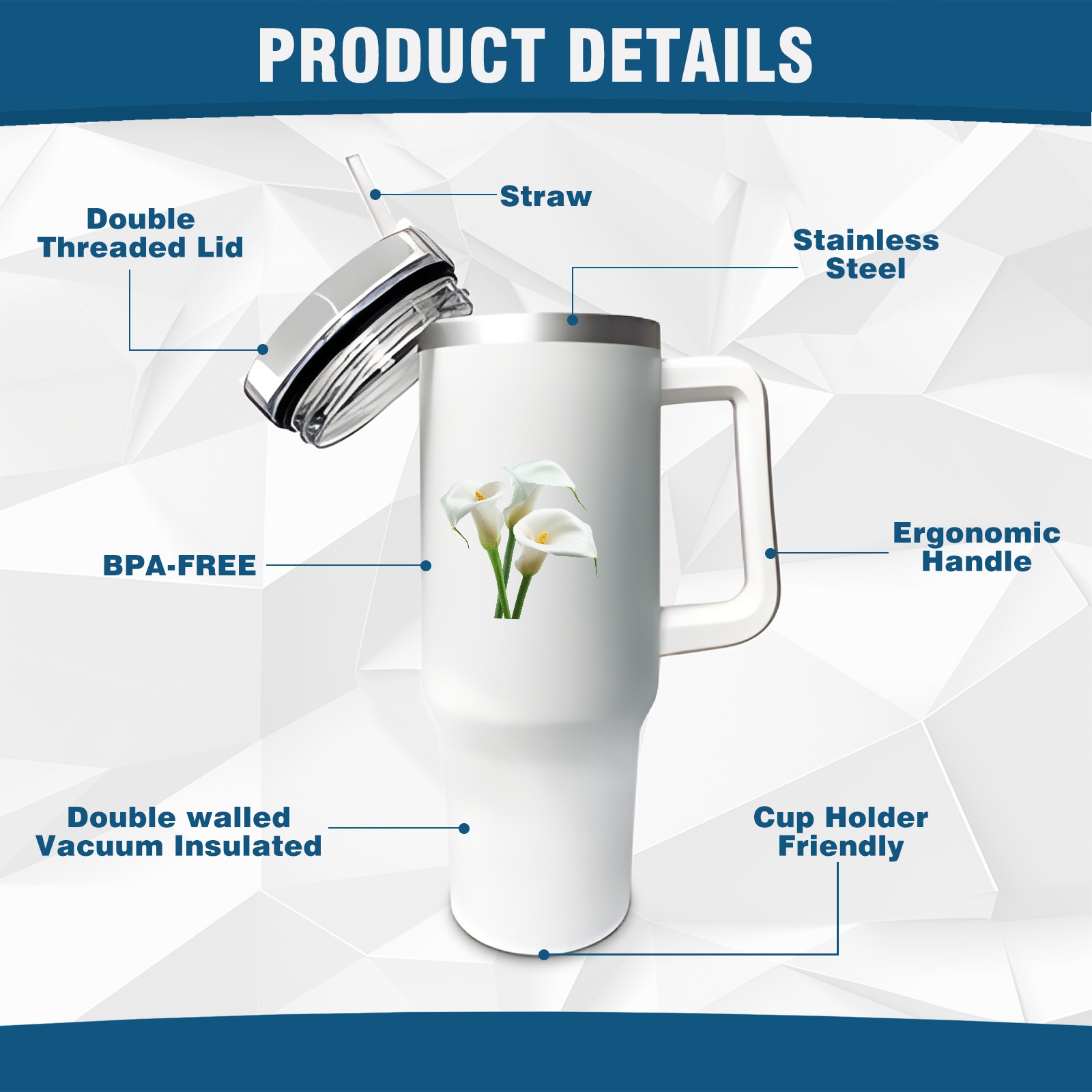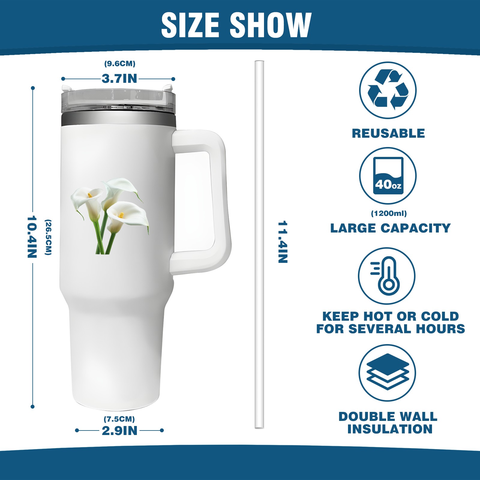 <b>ZXIVGOQFR Tumbler Is Your Dream Cup! </b>Whichever way your day flows, tumbler keeps you refreshed with fewer refills. </br> </br> ●<b>Double Wall Vacuum Insulation </b>means drinks stay cold, iced or hot for hours. </br> ●With advanced lid construction,STRAW OPENING designed to resist splashes with a seal that holds the reusable straw in place, a drink opening, and a full-cover top for added leak resistance. Totally spill proof! </br> ●ZXIVGOQFR Tumbler also included an ergonomic, comfort-grip HANDLE, 40 ounce tumbler cup is 2.9” wide at the base and 3.7” at the top. Narrow base fits just about any car cup holder. So you can bring a smoothie cup, iced coffee cup or extra espresso for your daily commute or weekend outing.