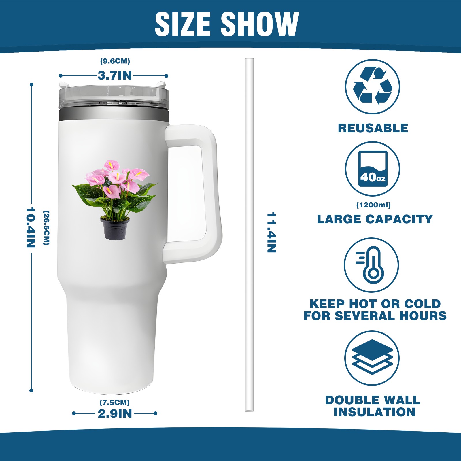 <b>ZXIVGOQFR Tumbler Is Your Dream Cup! </b>Whichever way your day flows, tumbler keeps you refreshed with fewer refills. </br> </br> ●<b>Double Wall Vacuum Insulation </b>means drinks stay cold, iced or hot for hours. </br> ●With advanced lid construction,STRAW OPENING designed to resist splashes with a seal that holds the reusable straw in place, a drink opening, and a full-cover top for added leak resistance. Totally spill proof! </br> ●ZXIVGOQFR Tumbler also included an ergonomic, comfort-grip HANDLE, 40 ounce tumbler cup is 2.9” wide at the base and 3.7” at the top. Narrow base fits just about any car cup holder. So you can bring a smoothie cup, iced coffee cup or extra espresso for your daily commute or weekend outing.