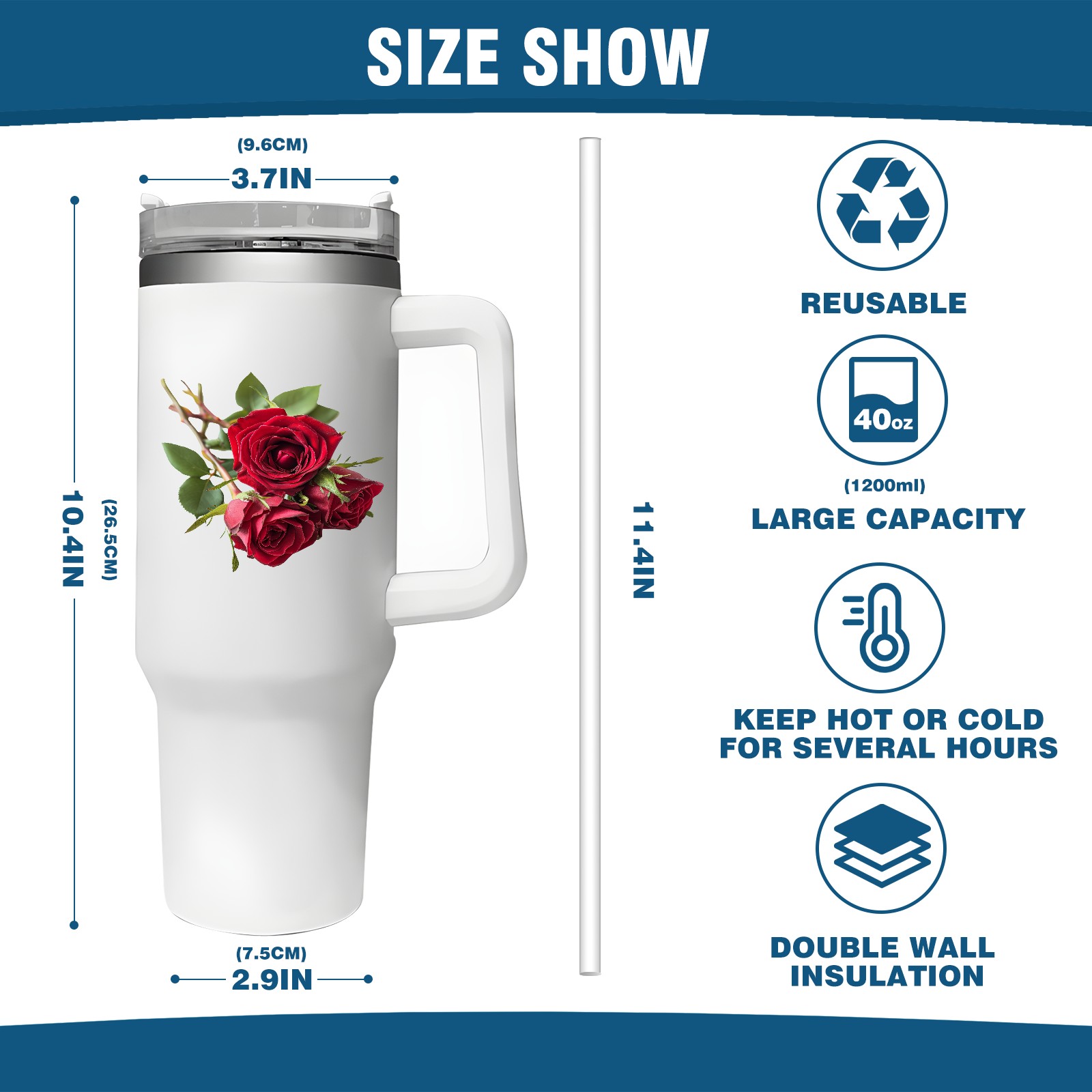 <b>ZXIVGOQFR Tumbler Is Your Dream Cup! </b>Whichever way your day flows, tumbler keeps you refreshed with fewer refills. </br> </br> ●<b>Double Wall Vacuum Insulation </b>means drinks stay cold, iced or hot for hours. </br> ●With advanced lid construction,STRAW OPENING designed to resist splashes with a seal that holds the reusable straw in place, a drink opening, and a full-cover top for added leak resistance. Totally spill proof! </br> ●ZXIVGOQFR Tumbler also included an ergonomic, comfort-grip HANDLE, 40 ounce tumbler cup is 2.9” wide at the base and 3.7” at the top. Narrow base fits just about any car cup holder. So you can bring a smoothie cup, iced coffee cup or extra espresso for your daily commute or weekend outing.