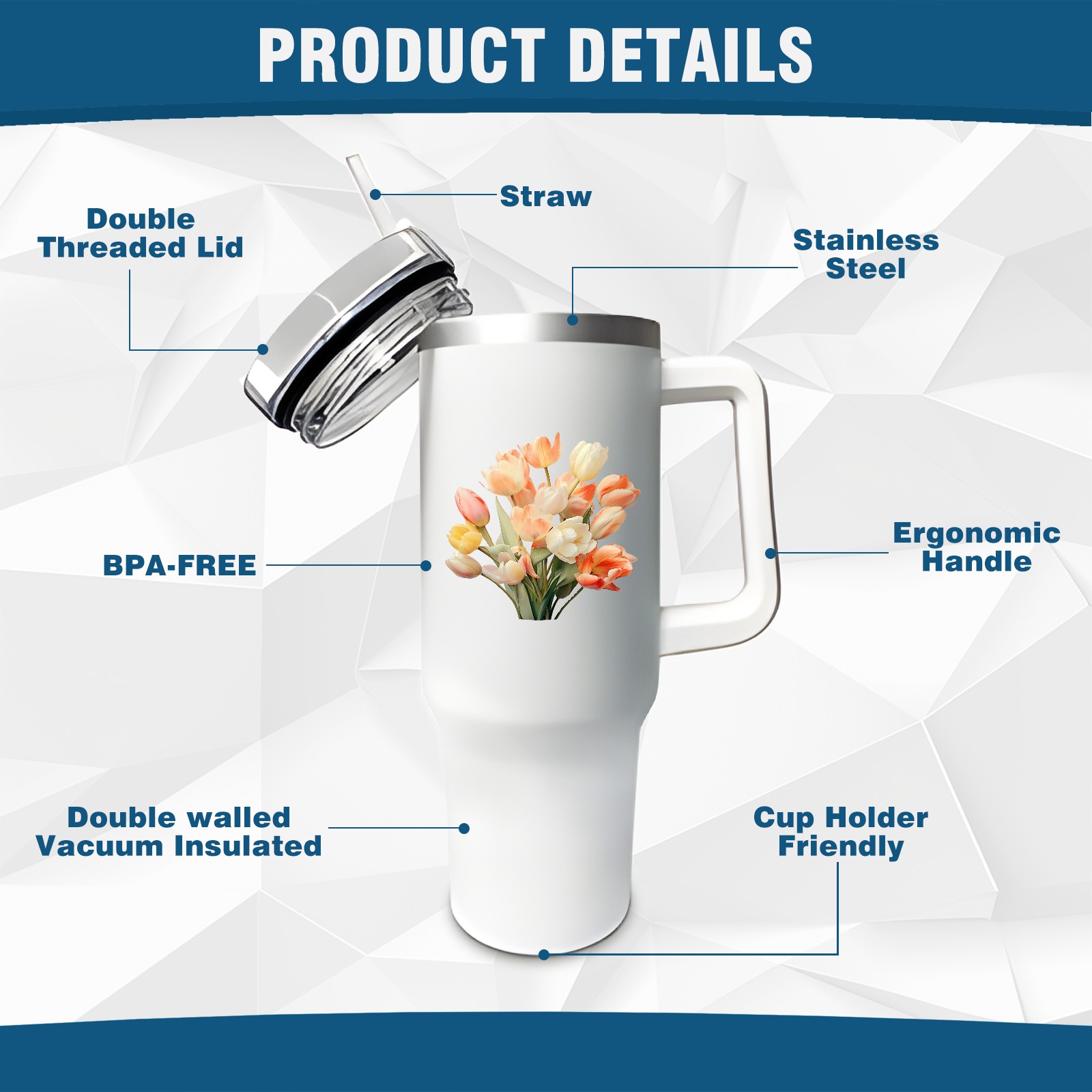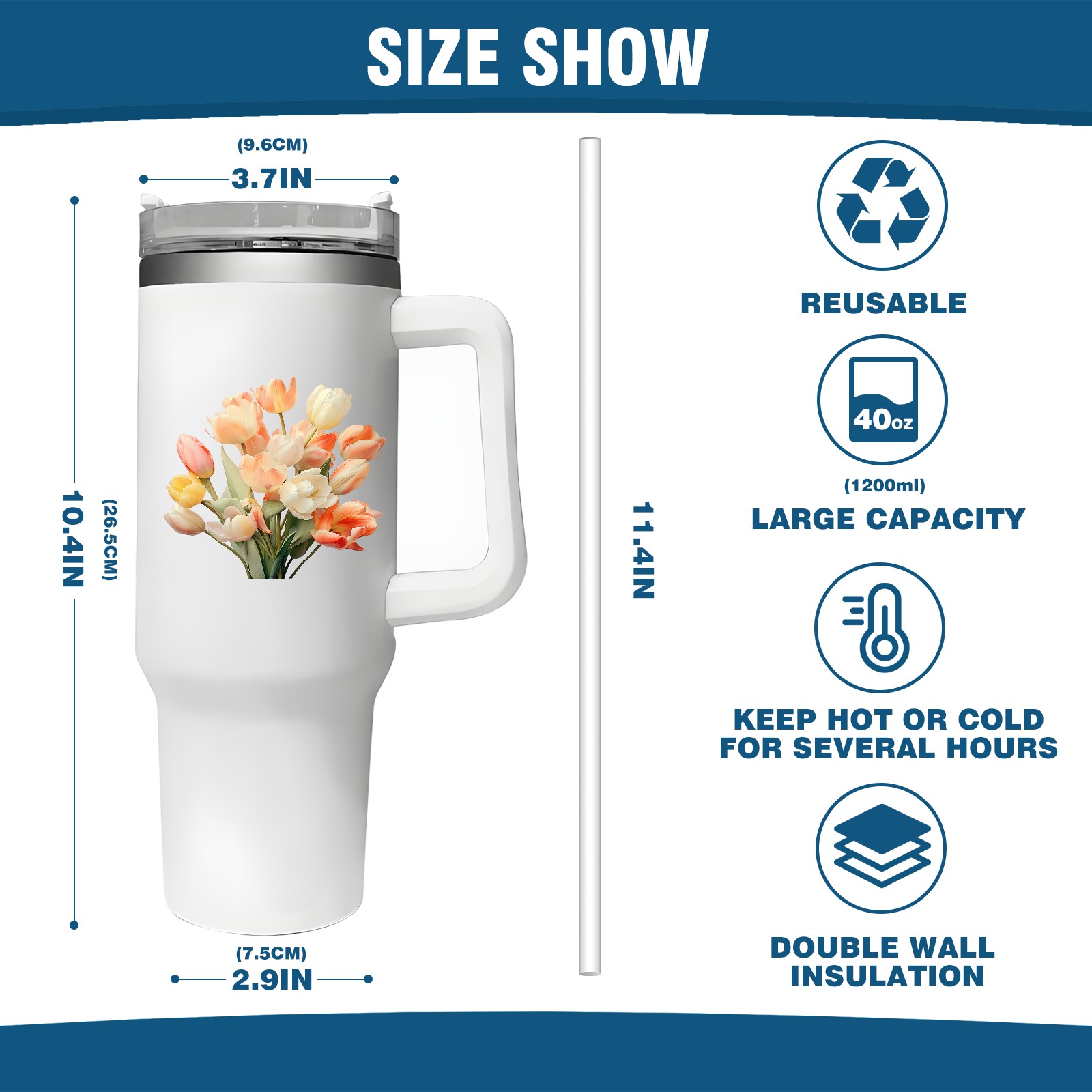 <b>ZXIVGOQFR Tumbler Is Your Dream Cup! </b>Whichever way your day flows, tumbler keeps you refreshed with fewer refills. </br> </br> ●<b>Double Wall Vacuum Insulation </b>means drinks stay cold, iced or hot for hours. </br> ●With advanced lid construction,STRAW OPENING designed to resist splashes with a seal that holds the reusable straw in place, a drink opening, and a full-cover top for added leak resistance. Totally spill proof! </br> ●ZXIVGOQFR Tumbler also included an ergonomic, comfort-grip HANDLE, 40 ounce tumbler cup is 2.9” wide at the base and 3.7” at the top. Narrow base fits just about any car cup holder. So you can bring a smoothie cup, iced coffee cup or extra espresso for your daily commute or weekend outing.