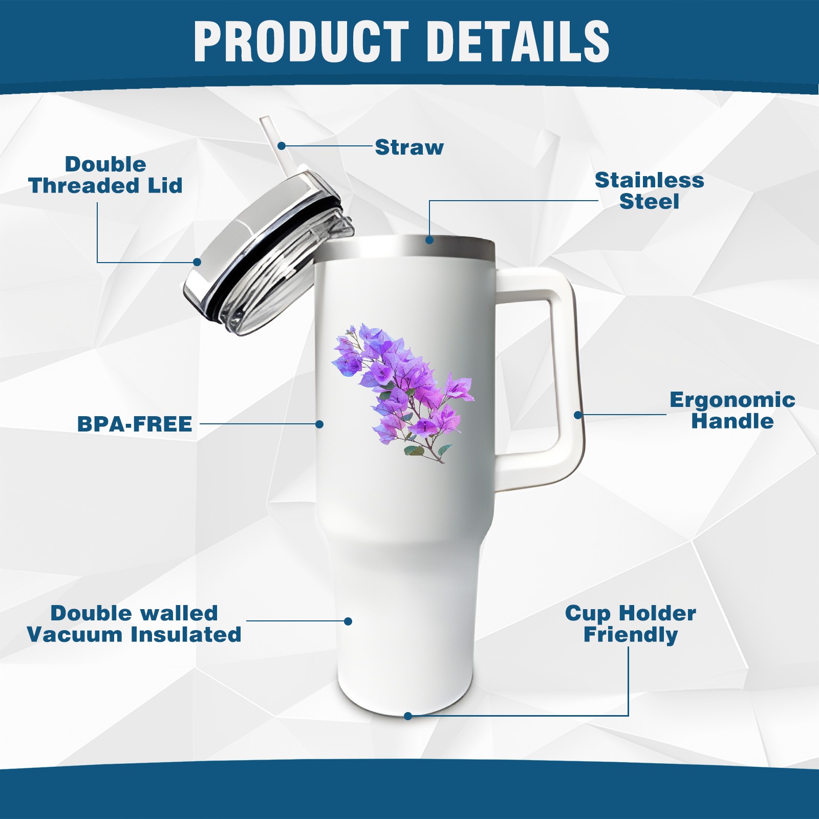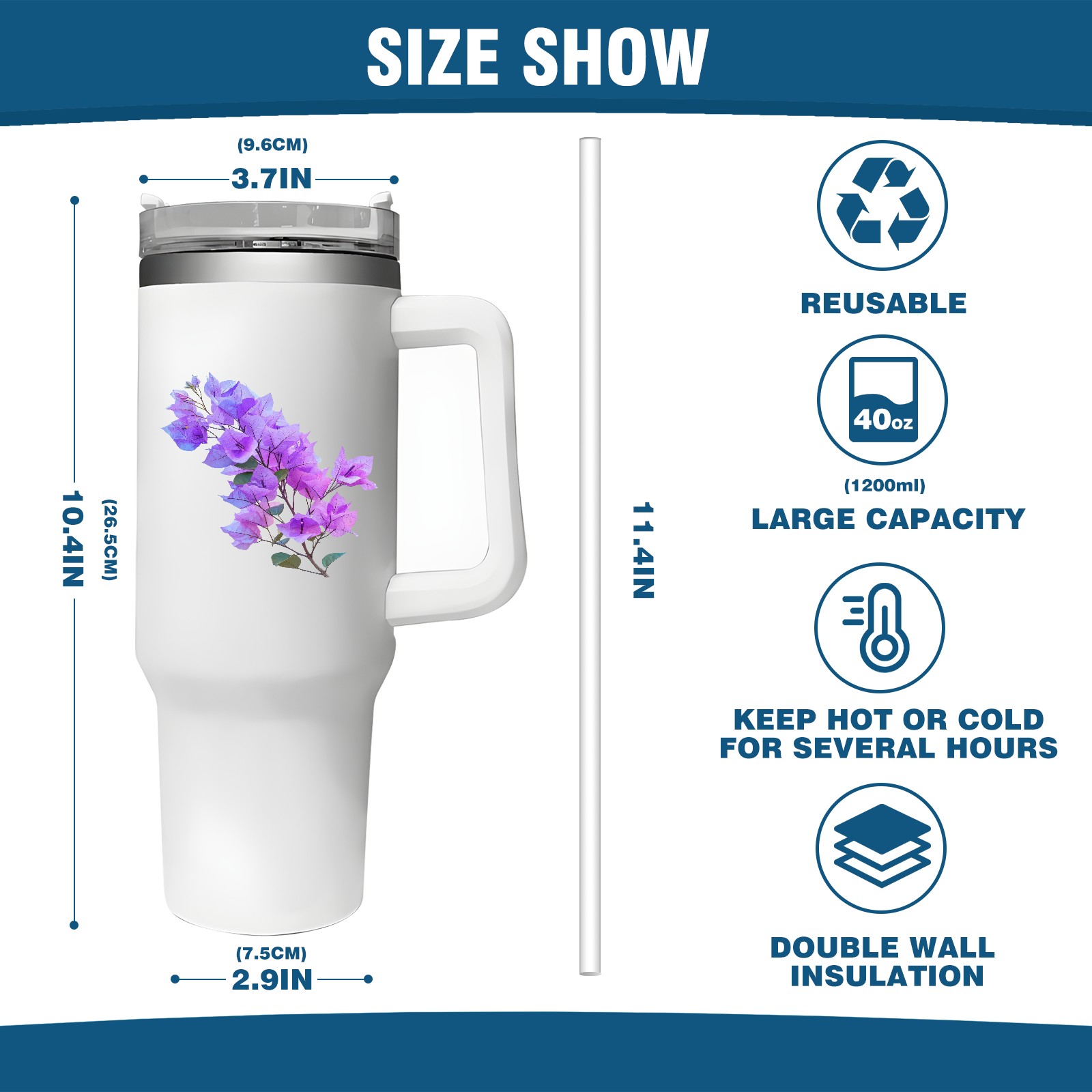 <b>ZXIVGOQFR Tumbler Is Your Dream Cup! </b>Whichever way your day flows, tumbler keeps you refreshed with fewer refills. </br> </br> ●<b>Double Wall Vacuum Insulation </b>means drinks stay cold, iced or hot for hours. </br> ●With advanced lid construction,STRAW OPENING designed to resist splashes with a seal that holds the reusable straw in place, a drink opening, and a full-cover top for added leak resistance. Totally spill proof! </br> ●ZXIVGOQFR Tumbler also included an ergonomic, comfort-grip HANDLE, 40 ounce tumbler cup is 2.9” wide at the base and 3.7” at the top. Narrow base fits just about any car cup holder. So you can bring a smoothie cup, iced coffee cup or extra espresso for your daily commute or weekend outing.