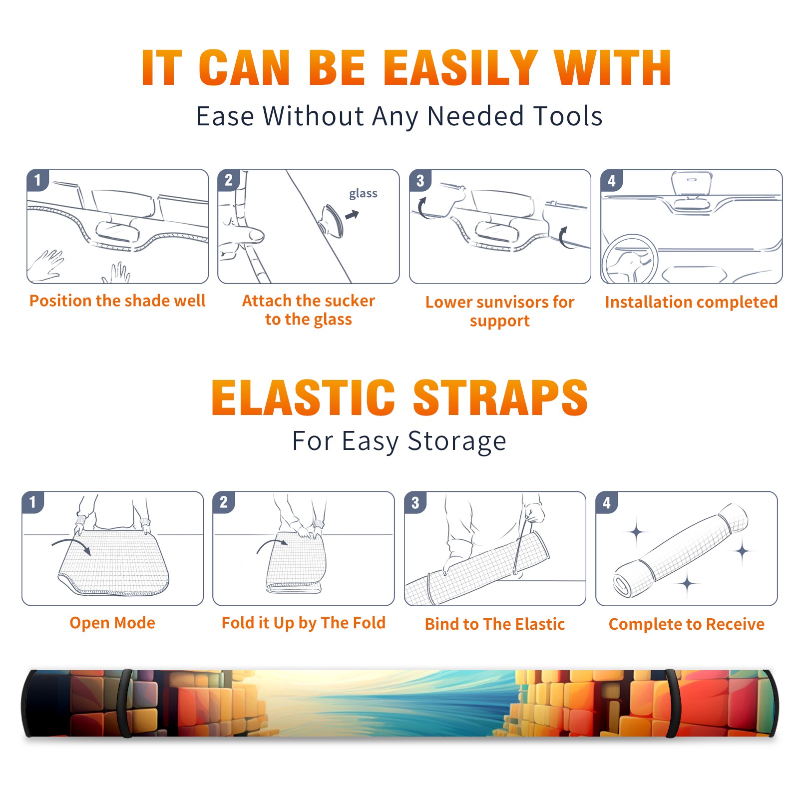 • <b>ZXIVGOQFR Foldable Premium Car Windshield Sunshade is your great solution to reduce your car’s interior temperature dramatically! This is definitely a must-have item for your summer travel! </b> <br> ●<b>Size: 63"L x 33.5"W </b> <br></b> ●<b>Blocking Uv Rays & Heat Insulation<br></b> Our vehicle sunshade provides effective UV, sun, and summer heat protection .Maintains dashboards by preventing fading and cracking <br> ●<b>Easy-To-Store Folding Design Makes Storage Convenient <br></b> ZXIVGOQFR car sunshades come with removable suction cups and elastic bands that you can install easily and quickly, and the removable suction cups will not leave any marks on your windows when removed. Within seconds, windshield visor can be installed and removed. When not in use,the front windshield can be easily and effectively placed on the door pocket or the dashboard, which is beautiful and does not take up space in the car.<br> <br> <b>PUT UP A 'PROTECTIVE UMBRELLA' FOR YOUR BELOVED CAR!</b>