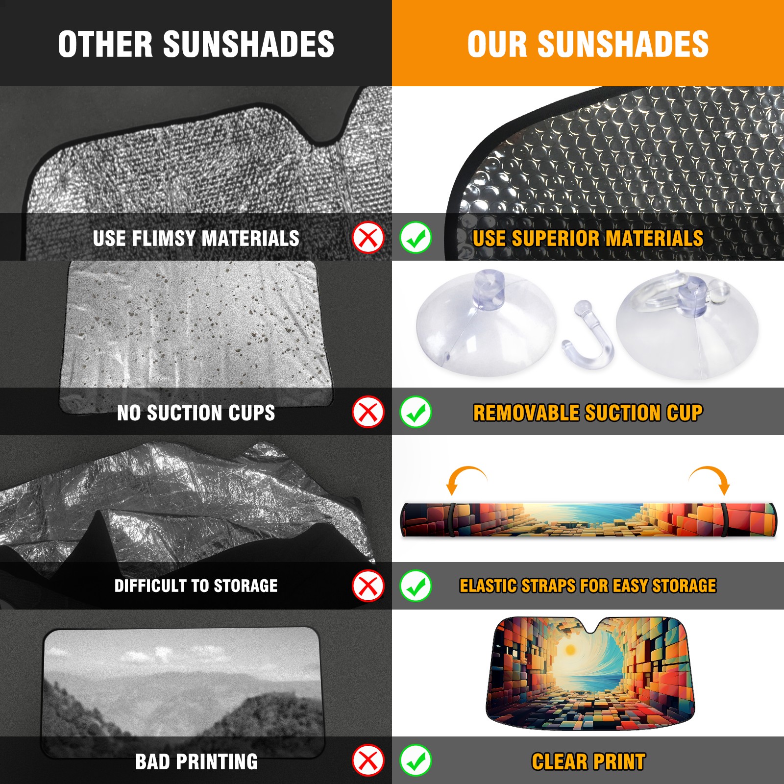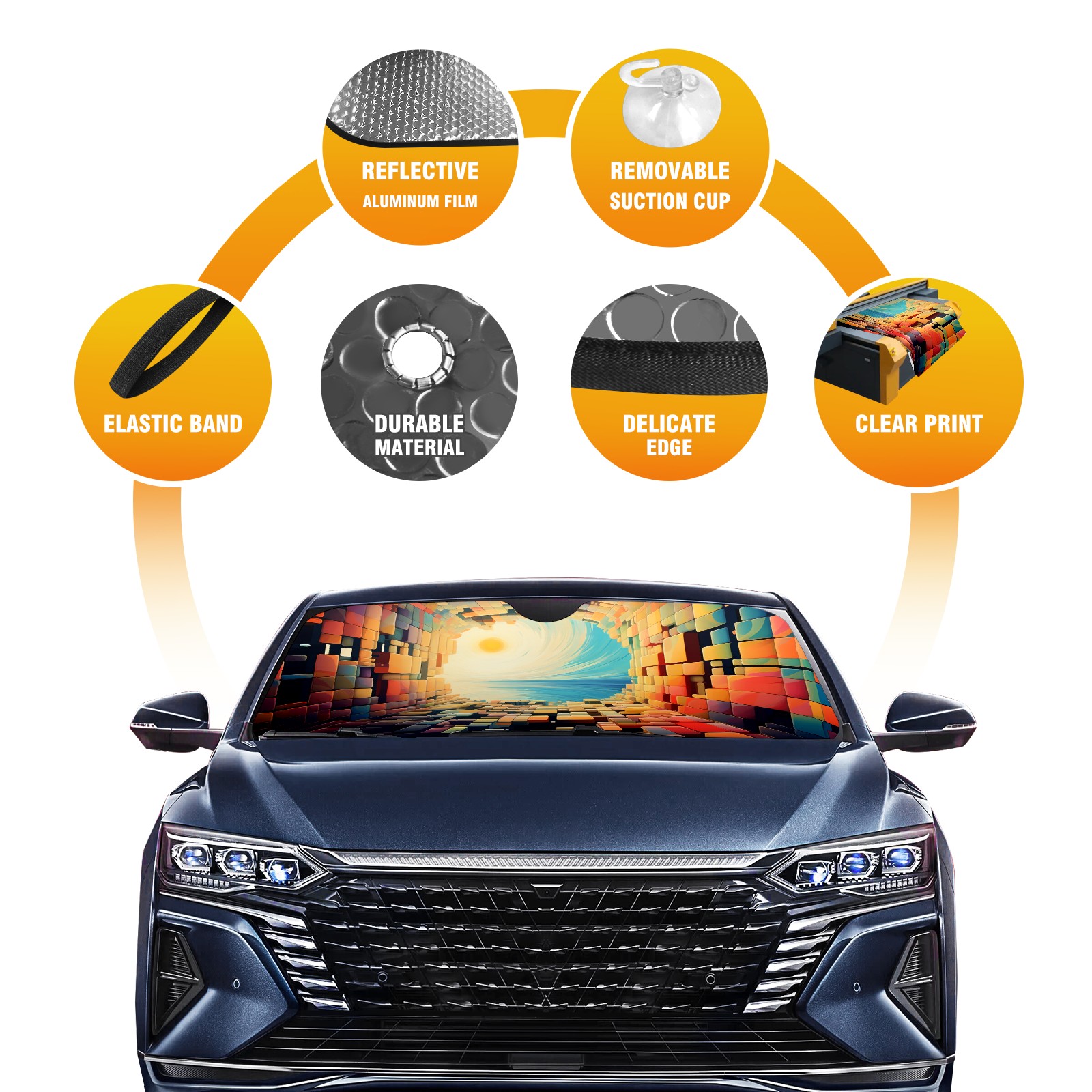 <b>ZXIVGOQFR Foldable Premium Car Windshield Sunshade is your great solution to reduce your car’s interior temperature dramatically! This is definitely a must-have item for your summer travel! </b> <br> ●<b>Size: 63"L x 33.5"W </b> <br></b> ●<b>Blocking Uv Rays & Heat Insulation<br></b> Our vehicle sunshade provides effective UV, sun, and summer heat protection .Maintains dashboards by preventing fading and cracking <br> ●<b>Easy-To-Store Folding Design Makes Storage Convenient <br></b> ZXIVGOQFR car sunshades come with removable suction cups and elastic bands that you can install easily and quickly, and the removable suction cups will not leave any marks on your windows when removed. Within seconds, windshield visor can be installed and removed. When not in use,the front windshield can be easily and effectively placed on the door pocket or the dashboard, which is beautiful and does not take up space in the car.<br> <br> <b>PUT UP A 'PROTECTIVE UMBRELLA' FOR YOUR BELOVED CAR!</b>