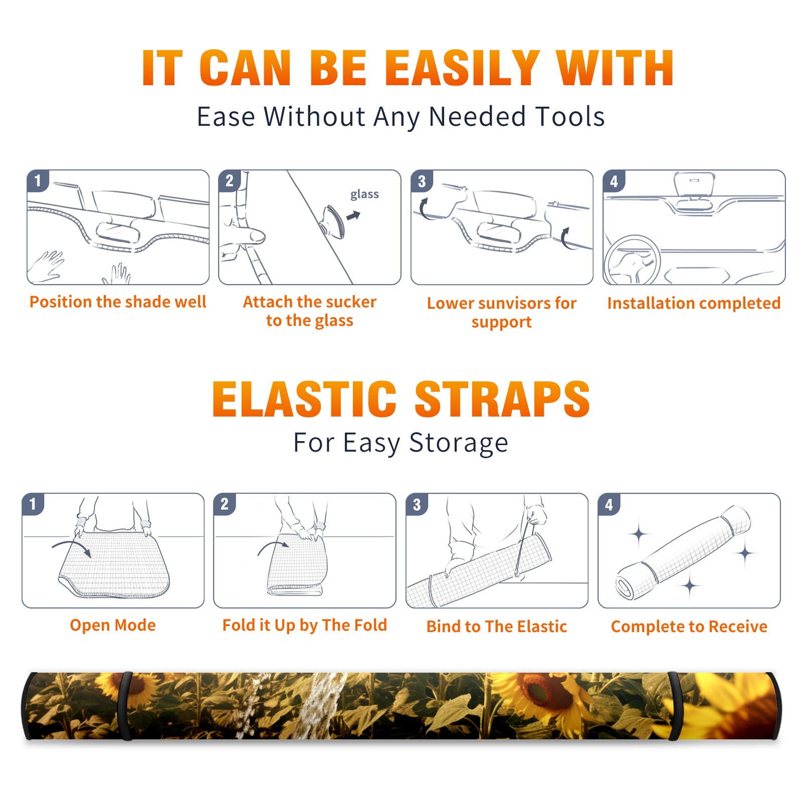 <b>ZXIVGOQFR Foldable Premium Car Windshield Sunshade is your great solution to reduce your car’s interior temperature dramatically! This is definitely a must-have item for your summer travel! </b> <br> ●<b>Size: 63"L x 33.5"W </b> <br></b> ●<b>Blocking Uv Rays & Heat Insulation<br></b> Our vehicle sunshade provides effective UV, sun, and summer heat protection .Maintains dashboards by preventing fading and cracking <br> ●<b>Easy-To-Store Folding Design Makes Storage Convenient <br></b> ZXIVGOQFR car sunshades come with removable suction cups and elastic bands that you can install easily and quickly, and the removable suction cups will not leave any marks on your windows when removed. Within seconds, windshield visor can be installed and removed. When not in use,the front windshield can be easily and effectively placed on the door pocket or the dashboard, which is beautiful and does not take up space in the car.<br> <br> <b>PUT UP A 'PROTECTIVE UMBRELLA' FOR YOUR BELOVED CAR!</b>