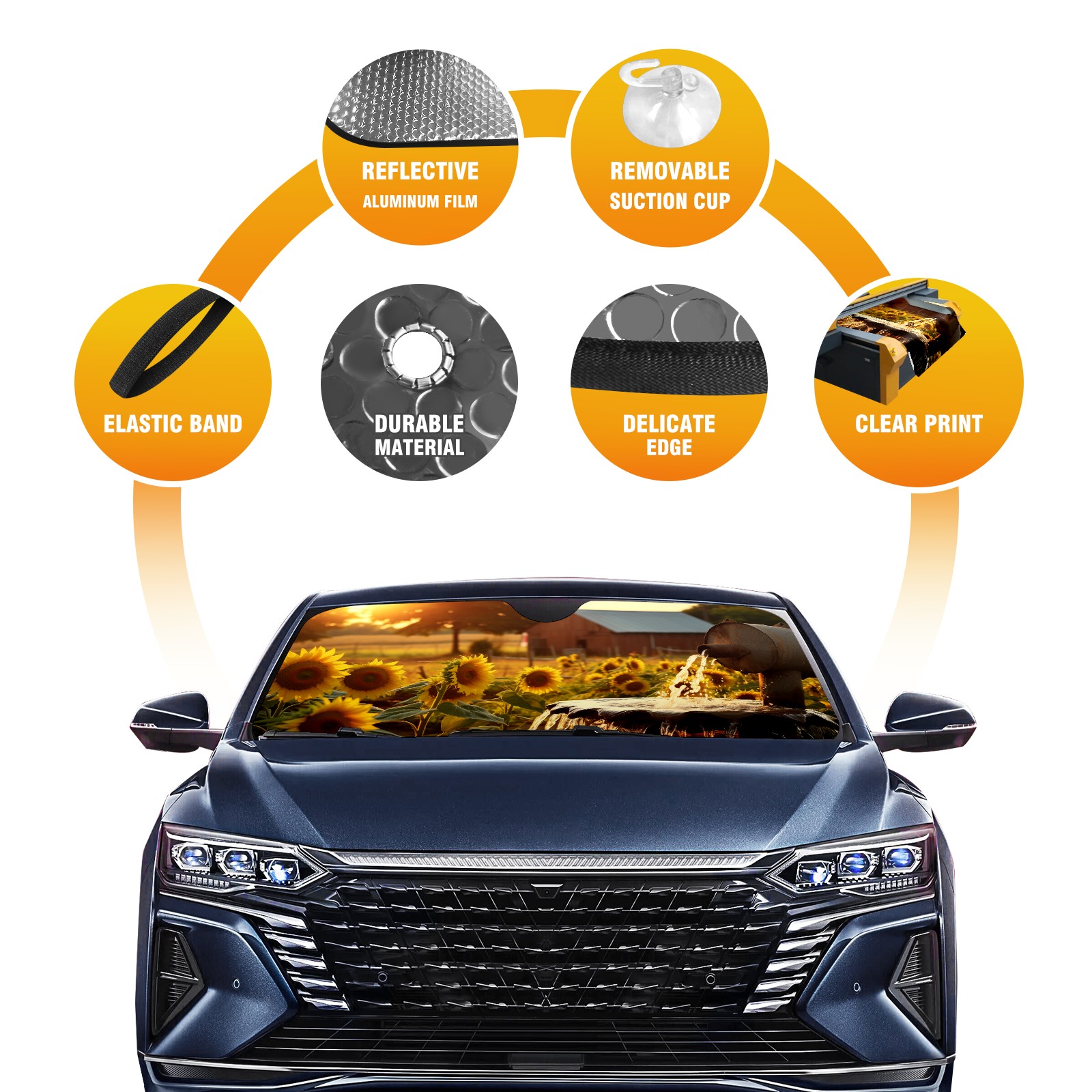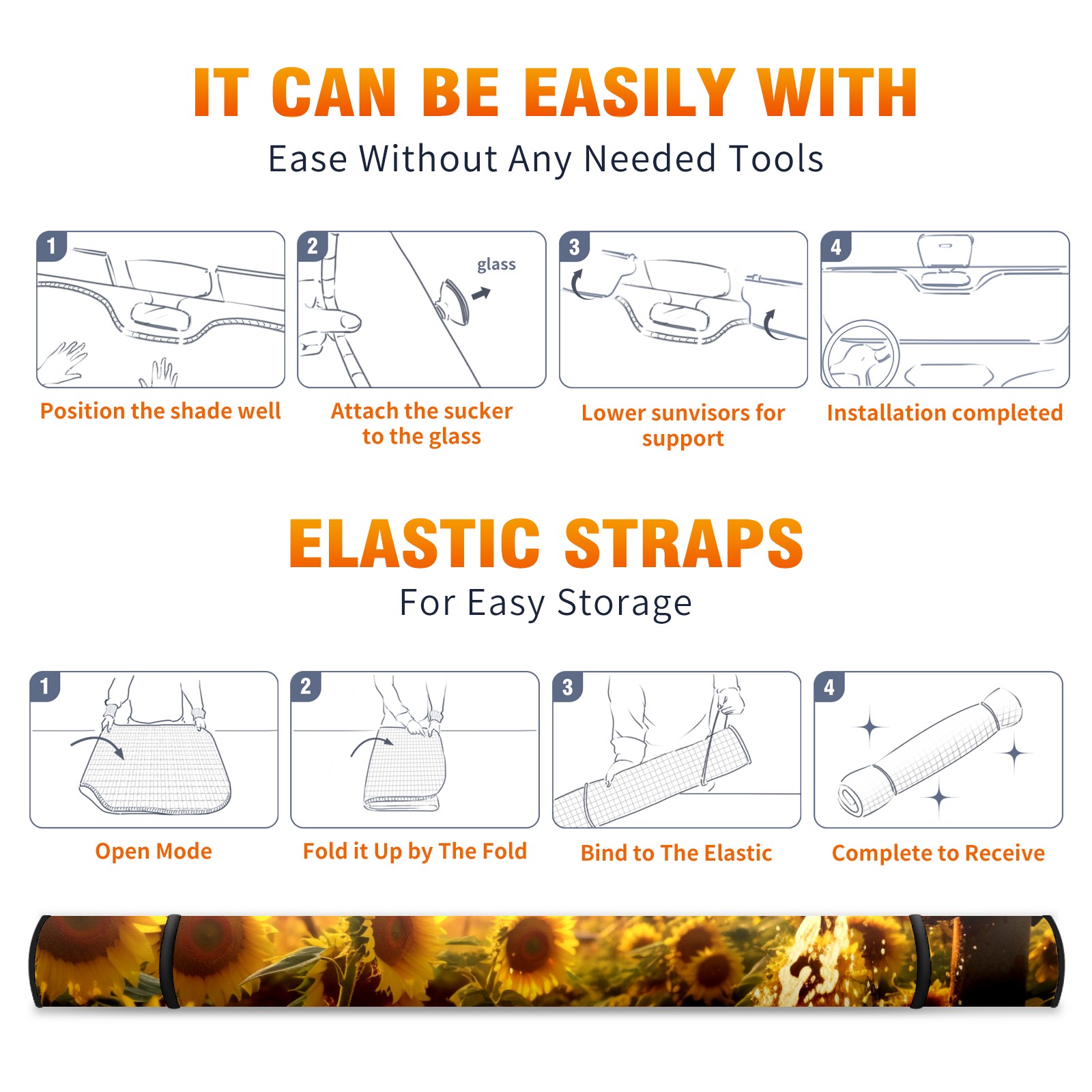 <b>ZXIVGOQFR Foldable Premium Car Windshield Sunshade is your great solution to reduce your car’s interior temperature dramatically! This is definitely a must-have item for your summer travel! </b> <br> ●<b>Size: 63"L x 33.5"W </b> <br></b> ●<b>Blocking Uv Rays & Heat Insulation<br></b> Our vehicle sunshade provides effective UV, sun, and summer heat protection .Maintains dashboards by preventing fading and cracking <br> ●<b>Easy-To-Store Folding Design Makes Storage Convenient <br></b> ZXIVGOQFR car sunshades come with removable suction cups and elastic bands that you can install easily and quickly, and the removable suction cups will not leave any marks on your windows when removed. Within seconds, windshield visor can be installed and removed. When not in use,the front windshield can be easily and effectively placed on the door pocket or the dashboard, which is beautiful and does not take up space in the car.<br> <br> <b>PUT UP A 'PROTECTIVE UMBRELLA' FOR YOUR BELOVED CAR!</b>