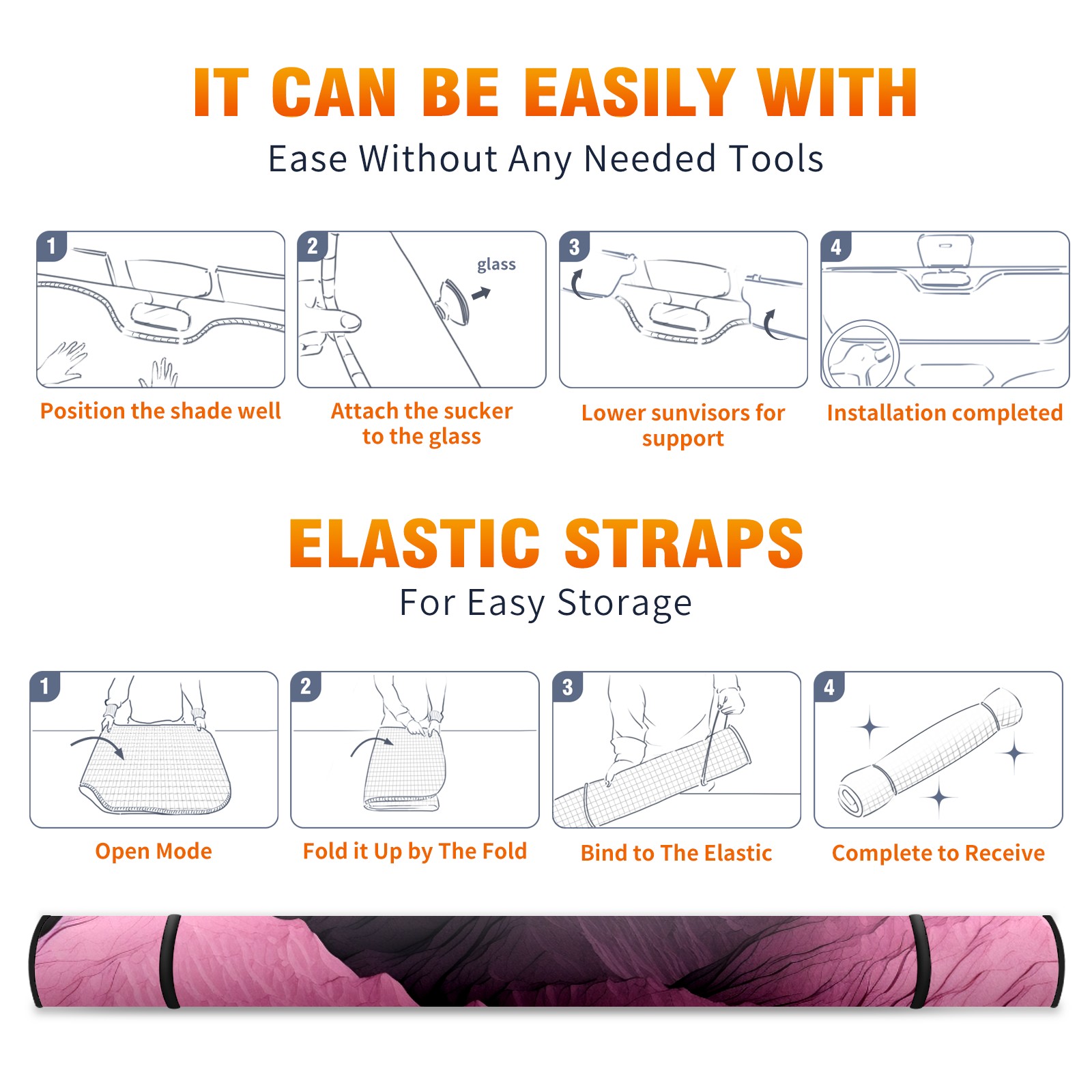 • <b>ZXIVGOQFR Foldable Premium Car Windshield Sunshade is your great solution to reduce your car’s interior temperature dramatically! This is definitely a must-have item for your summer travel! </b> <br> ●<b>Size: 63"L x 33.5"W </b> <br></b> ●<b>Blocking Uv Rays & Heat Insulation<br></b> Our vehicle sunshade provides effective UV, sun, and summer heat protection .Maintains dashboards by preventing fading and cracking <br> ●<b>Easy-To-Store Folding Design Makes Storage Convenient <br></b> ZXIVGOQFR car sunshades come with removable suction cups and elastic bands that you can install easily and quickly, and the removable suction cups will not leave any marks on your windows when removed. Within seconds, windshield visor can be installed and removed. When not in use,the front windshield can be easily and effectively placed on the door pocket or the dashboard, which is beautiful and does not take up space in the car.<br> <br> <b>PUT UP A 'PROTECTIVE UMBRELLA' FOR YOUR BELOVED CAR!</b>