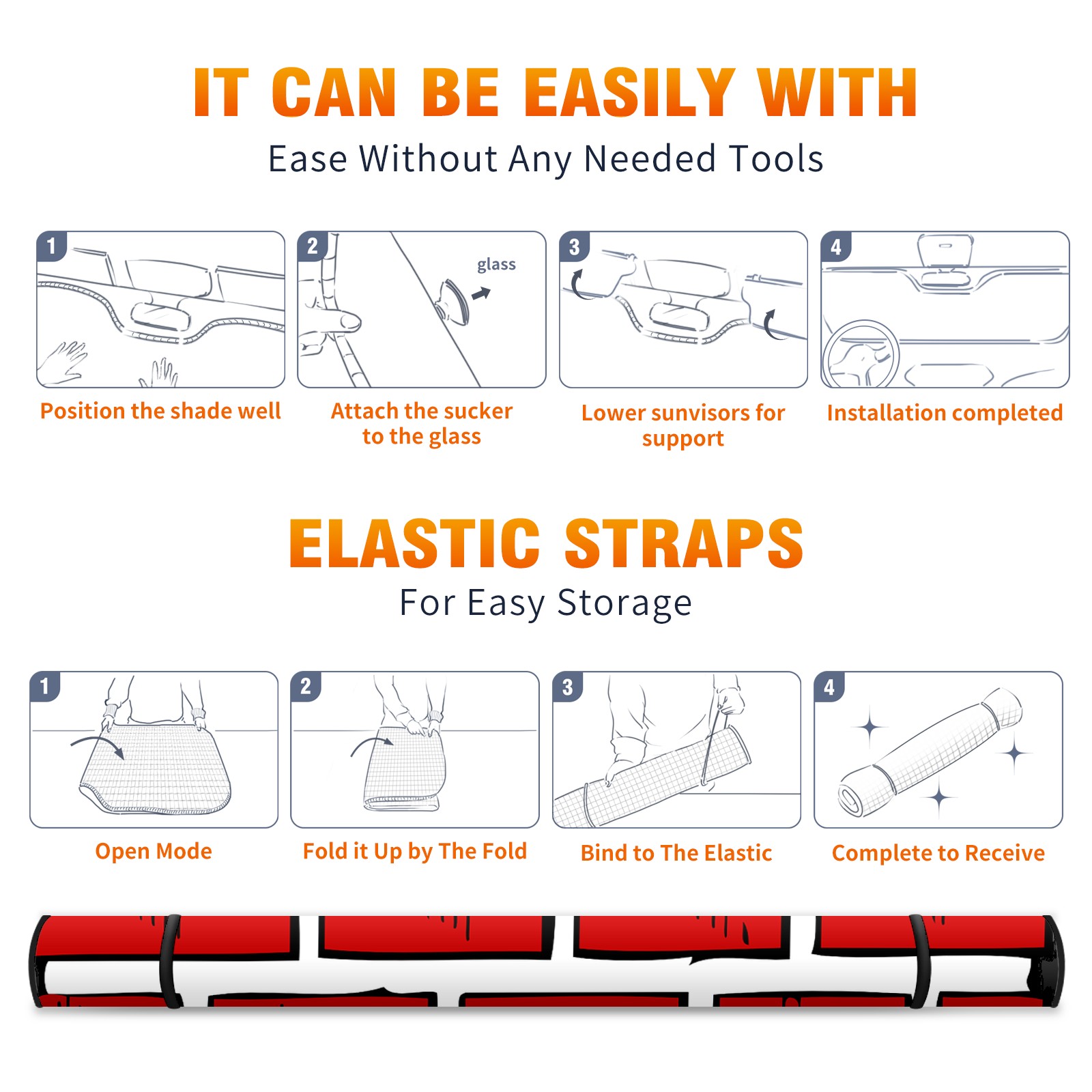 <b>ZXIVGOQFR Foldable Premium Car Windshield Sunshade is your great solution to reduce your car’s interior temperature dramatically! This is definitely a must-have item for your summer travel! </b> <br> ●<b>Size: 63"L x 33.5"W </b> <br></b> ●<b>Blocking Uv Rays & Heat Insulation<br></b> Our vehicle sunshade provides effective UV, sun, and summer heat protection .Maintains dashboards by preventing fading and cracking <br> ●<b>Easy-To-Store Folding Design Makes Storage Convenient <br></b> ZXIVGOQFR car sunshades come with removable suction cups and elastic bands that you can install easily and quickly, and the removable suction cups will not leave any marks on your windows when removed. Within seconds, windshield visor can be installed and removed. When not in use,the front windshield can be easily and effectively placed on the door pocket or the dashboard, which is beautiful and does not take up space in the car.<br> <br> <b>PUT UP A 'PROTECTIVE UMBRELLA' FOR YOUR BELOVED CAR!</b>