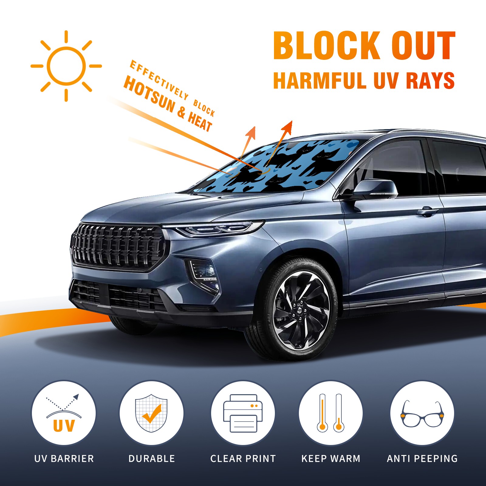 <b>ZXIVGOQFR Foldable Premium Car Windshield Sunshade is your great solution to reduce your car’s interior temperature dramatically! This is definitely a must-have item for your summer travel! </b> <br> ●<b>Size: 63"L x 33.5"W </b> <br></b> ●<b>Blocking Uv Rays & Heat Insulation<br></b> Our vehicle sunshade provides effective UV, sun, and summer heat protection .Maintains dashboards by preventing fading and cracking <br> ●<b>Easy-To-Store Folding Design Makes Storage Convenient <br></b> ZXIVGOQFR car sunshades come with removable suction cups and elastic bands that you can install easily and quickly, and the removable suction cups will not leave any marks on your windows when removed. Within seconds, windshield visor can be installed and removed. When not in use,the front windshield can be easily and effectively placed on the door pocket or the dashboard, which is beautiful and does not take up space in the car.<br> <br> <b>PUT UP A 'PROTECTIVE UMBRELLA' FOR YOUR BELOVED CAR!</b>
