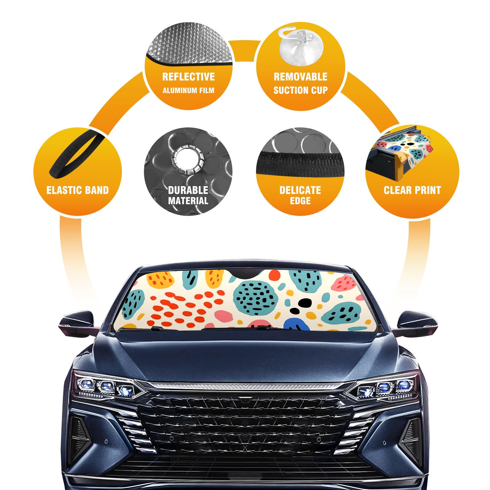 • <b>ZXIVGOQFR Foldable Premium Car Windshield Sunshade is your great solution to reduce your car’s interior temperature dramatically! This is definitely a must-have item for your summer travel! </b> <br> ●<b>Size: 63"L x 33.5"W </b> <br></b> ●<b>Blocking Uv Rays & Heat Insulation<br></b> Our vehicle sunshade provides effective UV, sun, and summer heat protection .Maintains dashboards by preventing fading and cracking <br> ●<b>Easy-To-Store Folding Design Makes Storage Convenient <br></b> ZXIVGOQFR car sunshades come with removable suction cups and elastic bands that you can install easily and quickly, and the removable suction cups will not leave any marks on your windows when removed. Within seconds, windshield visor can be installed and removed. When not in use,the front windshield can be easily and effectively placed on the door pocket or the dashboard, which is beautiful and does not take up space in the car.<br> <br> <b>PUT UP A 'PROTECTIVE UMBRELLA' FOR YOUR BELOVED CAR!</b>