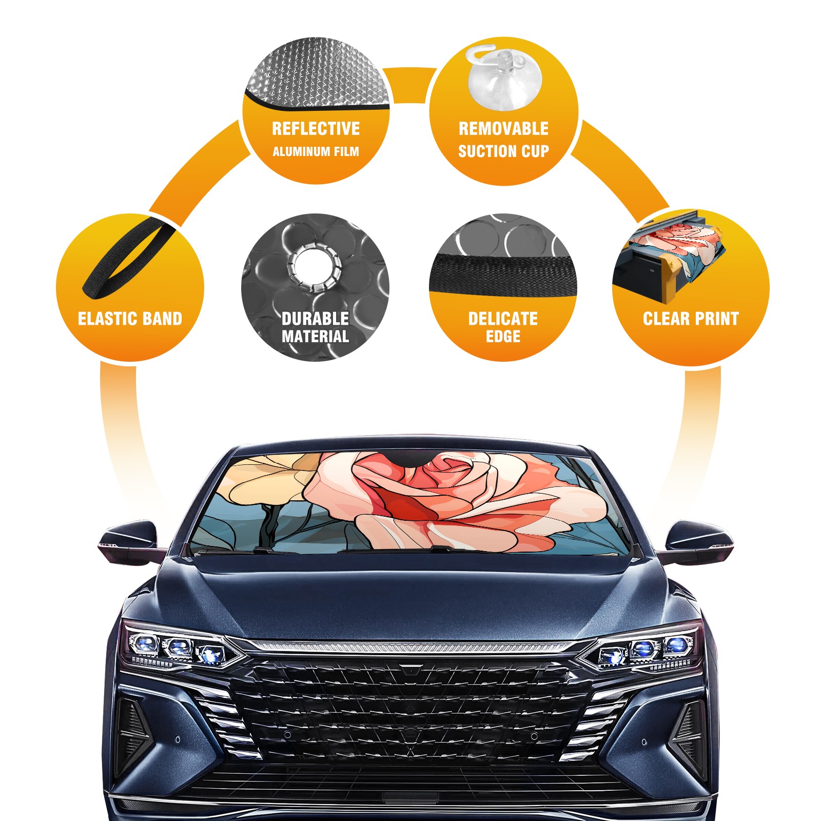 • <b>ZXIVGOQFR Foldable Premium Car Windshield Sunshade is your great solution to reduce your car’s interior temperature dramatically! This is definitely a must-have item for your summer travel! </b> <br> ●<b>Size: 63"L x 33.5"W </b> <br></b> ●<b>Blocking Uv Rays & Heat Insulation<br></b> Our vehicle sunshade provides effective UV, sun, and summer heat protection .Maintains dashboards by preventing fading and cracking <br> ●<b>Easy-To-Store Folding Design Makes Storage Convenient <br></b> ZXIVGOQFR car sunshades come with removable suction cups and elastic bands that you can install easily and quickly, and the removable suction cups will not leave any marks on your windows when removed. Within seconds, windshield visor can be installed and removed. When not in use,the front windshield can be easily and effectively placed on the door pocket or the dashboard, which is beautiful and does not take up space in the car.<br> <br> <b>PUT UP A 'PROTECTIVE UMBRELLA' FOR YOUR BELOVED CAR!</b>