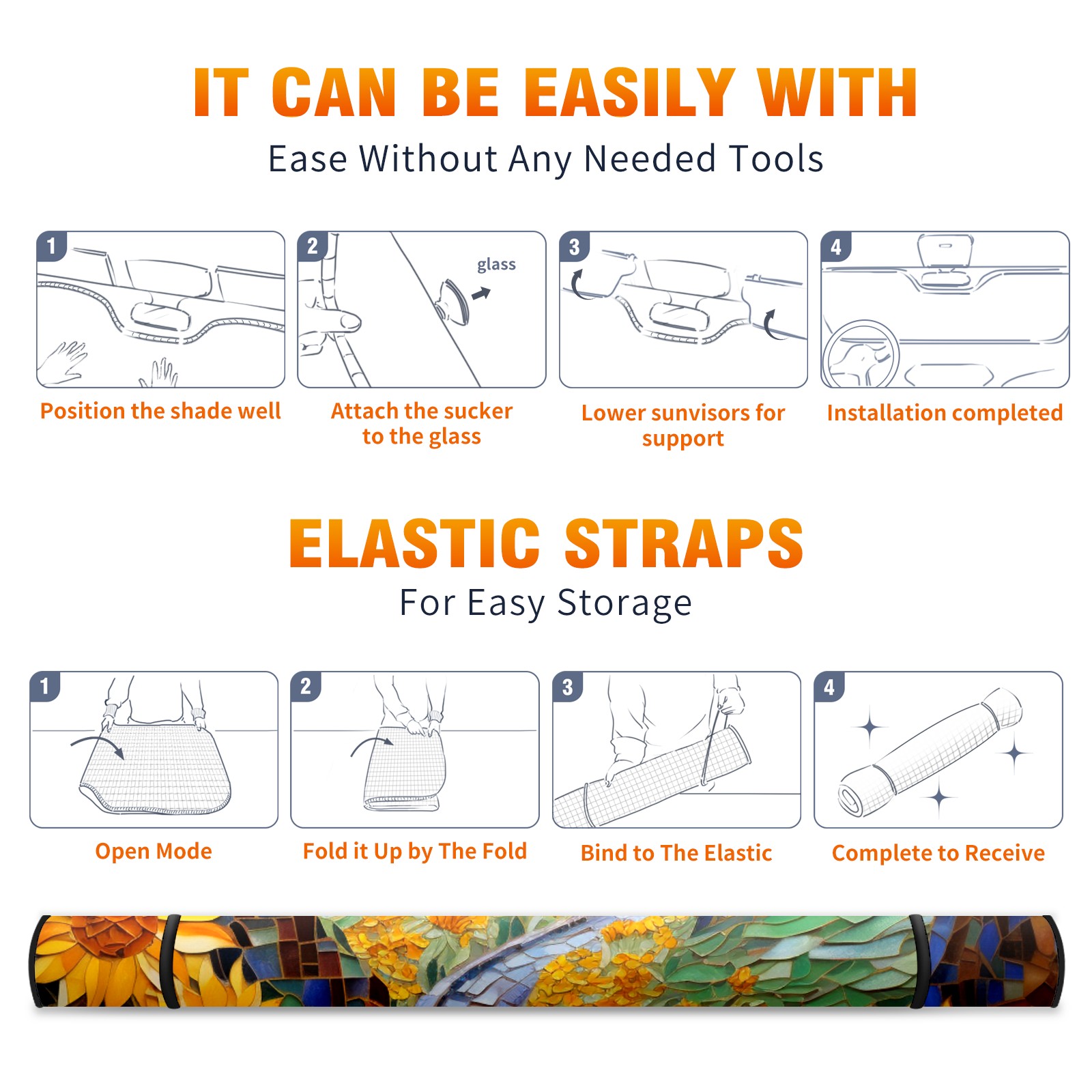 • <b>ZXIVGOQFR Foldable Premium Car Windshield Sunshade is your great solution to reduce your car’s interior temperature dramatically! This is definitely a must-have item for your summer travel! </b> <br> ●<b>Size: 63"L x 33.5"W </b> <br></b> ●<b>Blocking Uv Rays & Heat Insulation<br></b> Our vehicle sunshade provides effective UV, sun, and summer heat protection .Maintains dashboards by preventing fading and cracking <br> ●<b>Easy-To-Store Folding Design Makes Storage Convenient <br></b> ZXIVGOQFR car sunshades come with removable suction cups and elastic bands that you can install easily and quickly, and the removable suction cups will not leave any marks on your windows when removed. Within seconds, windshield visor can be installed and removed. When not in use,the front windshield can be easily and effectively placed on the door pocket or the dashboard, which is beautiful and does not take up space in the car.<br> <br> <b>PUT UP A 'PROTECTIVE UMBRELLA' FOR YOUR BELOVED CAR!</b>