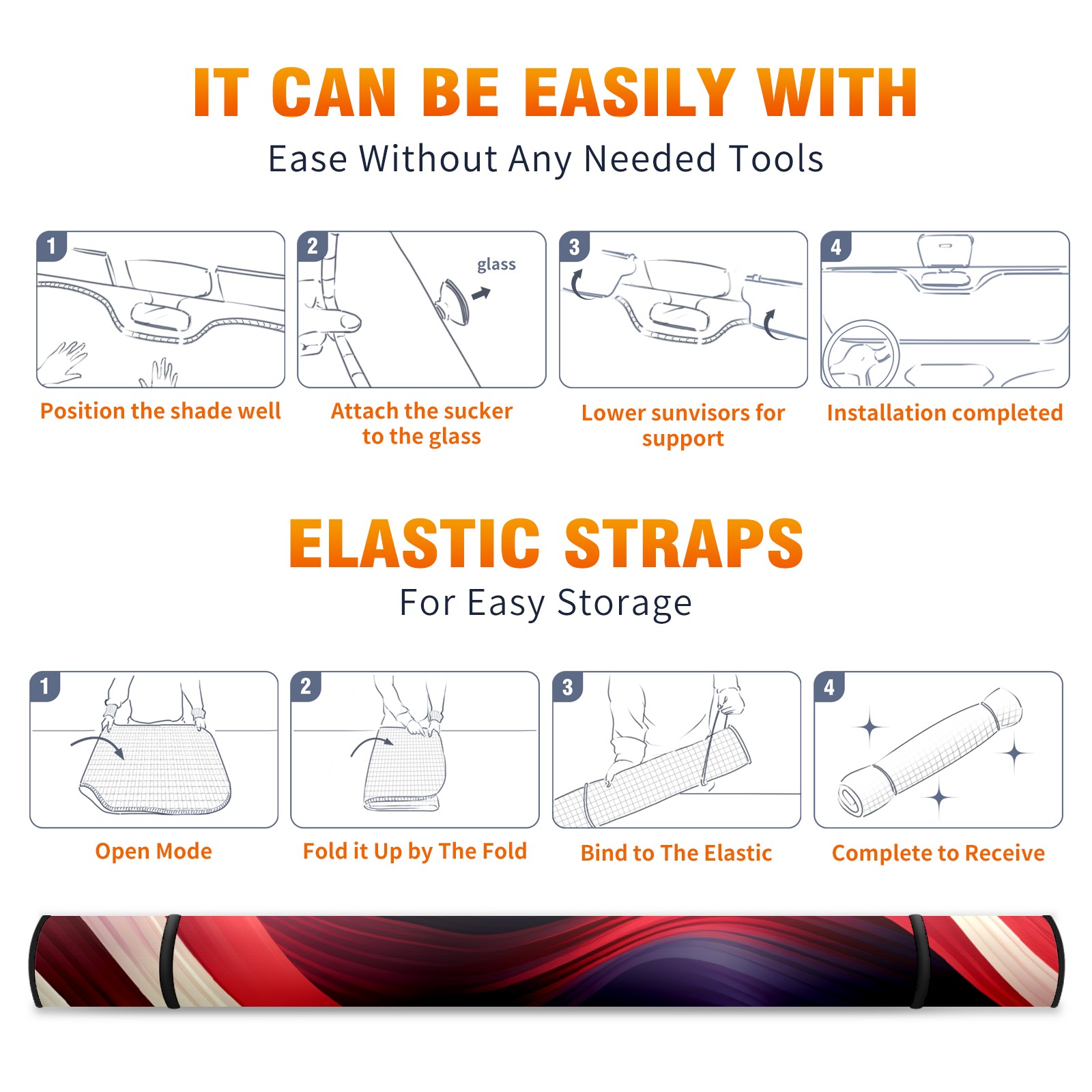 <b>ZXIVGOQFR Foldable Premium Car Windshield Sunshade is your great solution to reduce your car’s interior temperature dramatically! This is definitely a must-have item for your summer travel! </b> <br> ●<b>Size: 63"L x 33.5"W </b> <br></b> ●<b>Blocking Uv Rays & Heat Insulation<br></b> Our vehicle sunshade provides effective UV, sun, and summer heat protection .Maintains dashboards by preventing fading and cracking <br> ●<b>Easy-To-Store Folding Design Makes Storage Convenient <br></b> ZXIVGOQFR car sunshades come with removable suction cups and elastic bands that you can install easily and quickly, and the removable suction cups will not leave any marks on your windows when removed. Within seconds, windshield visor can be installed and removed. When not in use,the front windshield can be easily and effectively placed on the door pocket or the dashboard, which is beautiful and does not take up space in the car.<br> <br> <b>PUT UP A 'PROTECTIVE UMBRELLA' FOR YOUR BELOVED CAR!</b>