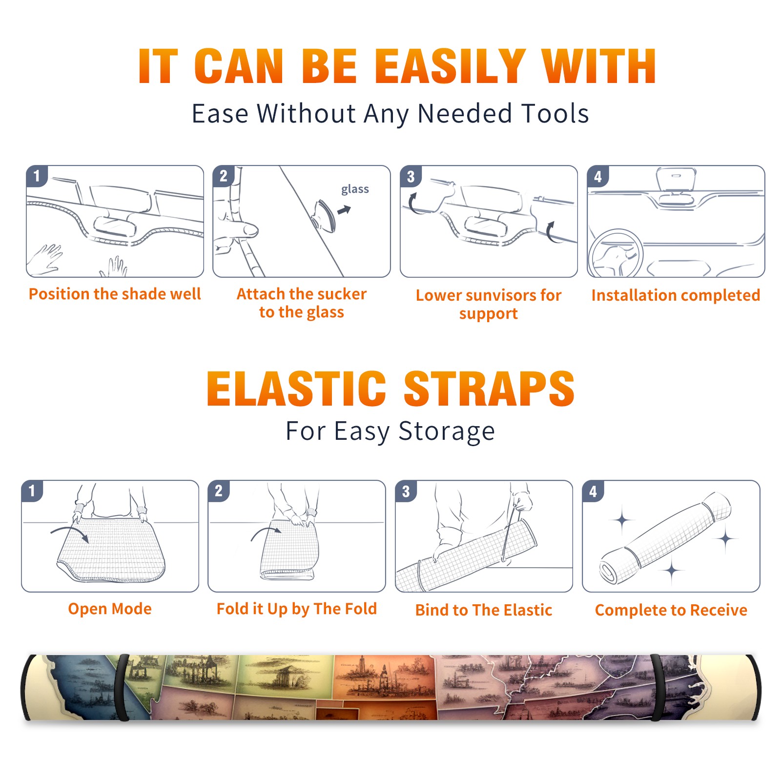 • <b>ZXIVGOQFR Foldable Premium Car Windshield Sunshade is your great solution to reduce your car’s interior temperature dramatically! This is definitely a must-have item for your summer travel! </b> <br> ●<b>Size: 63"L x 33.5"W </b> <br></b> ●<b>Blocking Uv Rays & Heat Insulation<br></b> Our vehicle sunshade provides effective UV, sun, and summer heat protection .Maintains dashboards by preventing fading and cracking <br> ●<b>Easy-To-Store Folding Design Makes Storage Convenient <br></b> ZXIVGOQFR car sunshades come with removable suction cups and elastic bands that you can install easily and quickly, and the removable suction cups will not leave any marks on your windows when removed. Within seconds, windshield visor can be installed and removed. When not in use,the front windshield can be easily and effectively placed on the door pocket or the dashboard, which is beautiful and does not take up space in the car.<br> <br> <b>PUT UP A 'PROTECTIVE UMBRELLA' FOR YOUR BELOVED CAR!</b>
